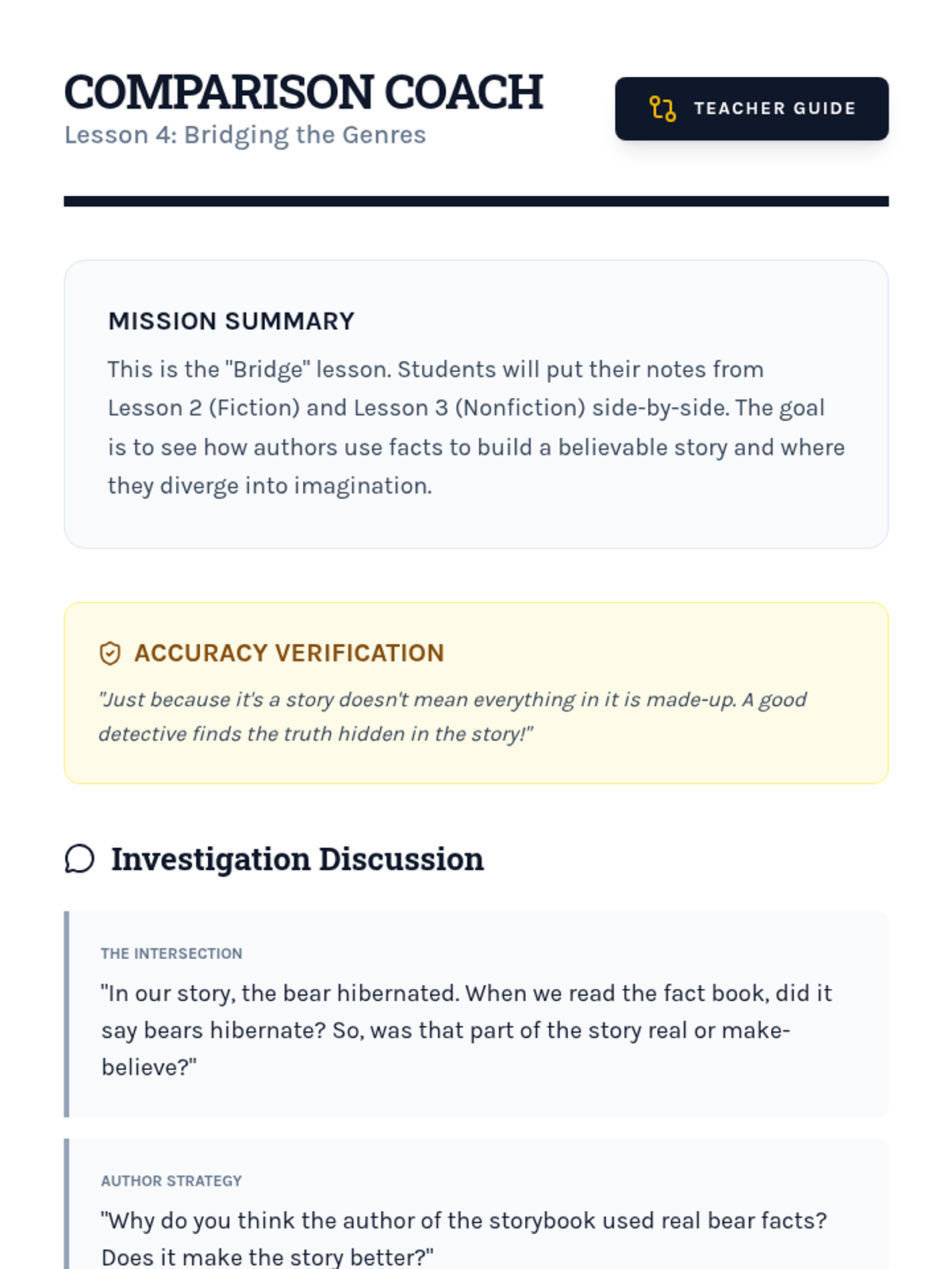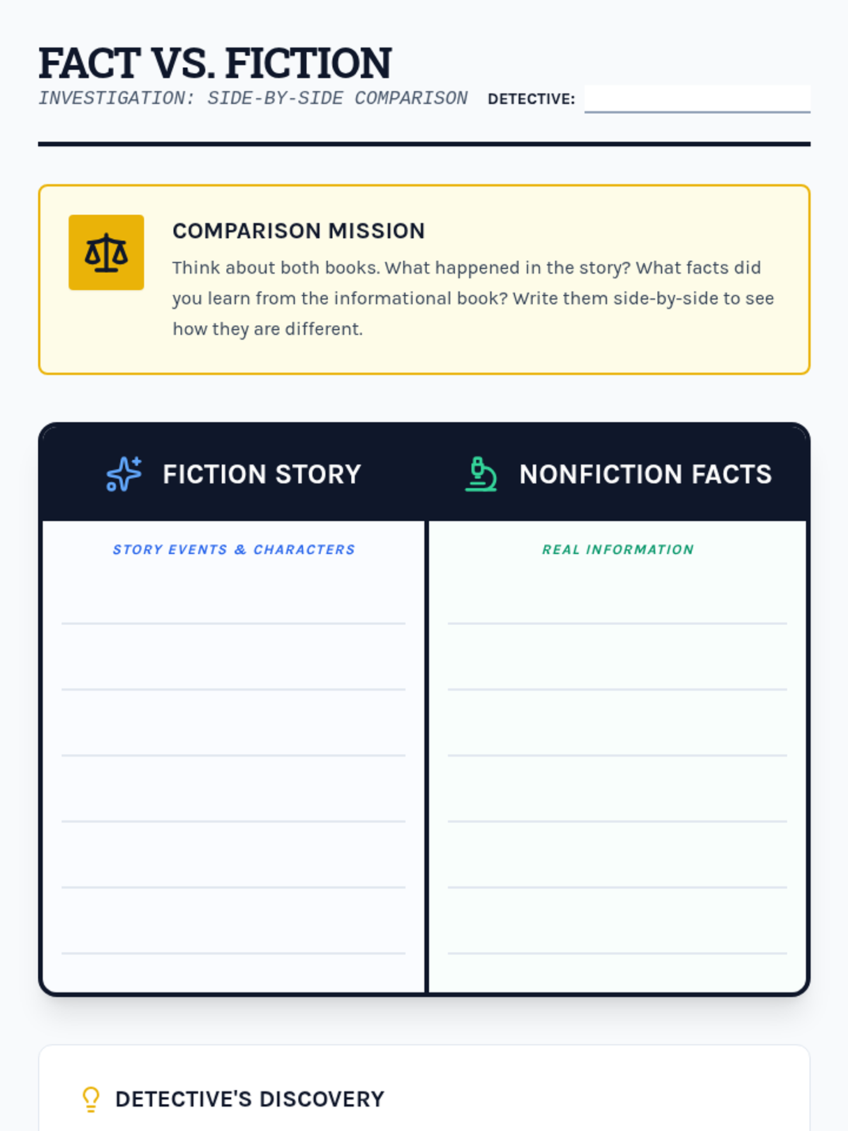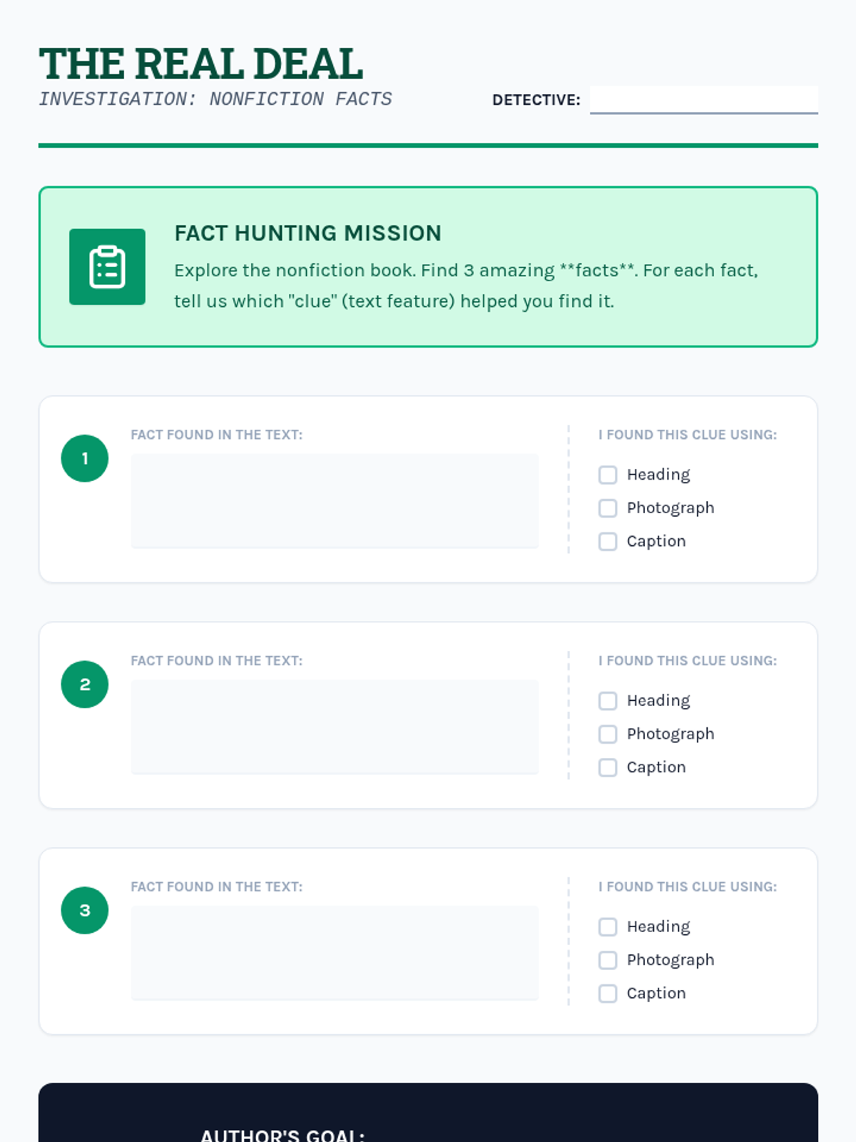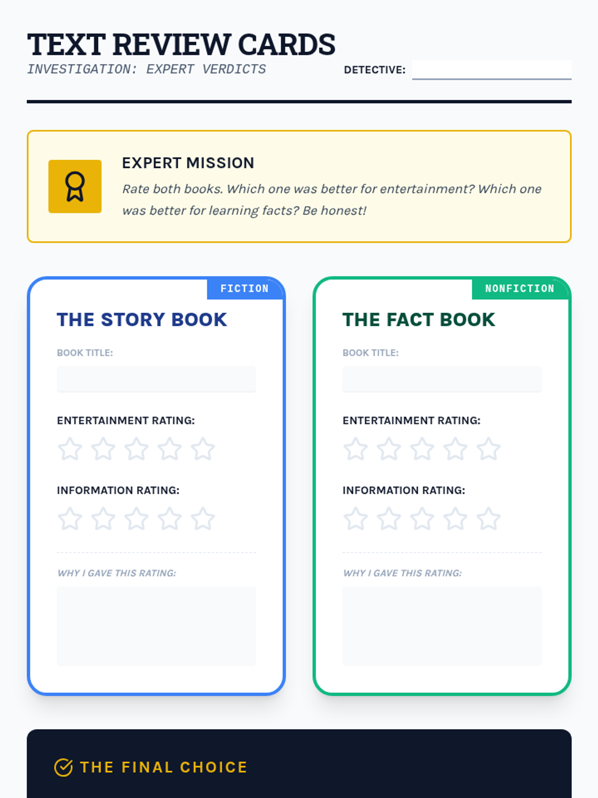 A 2nd Grade ELA sequence where students become 'Text Detectives' to distinguish between fiction and nonfiction texts. Through a series of 5 lessons, students learn to identify text features, analyze narrative elements, extract key facts, compare content across genres, and evaluate author approaches using paired texts on the same topic.
