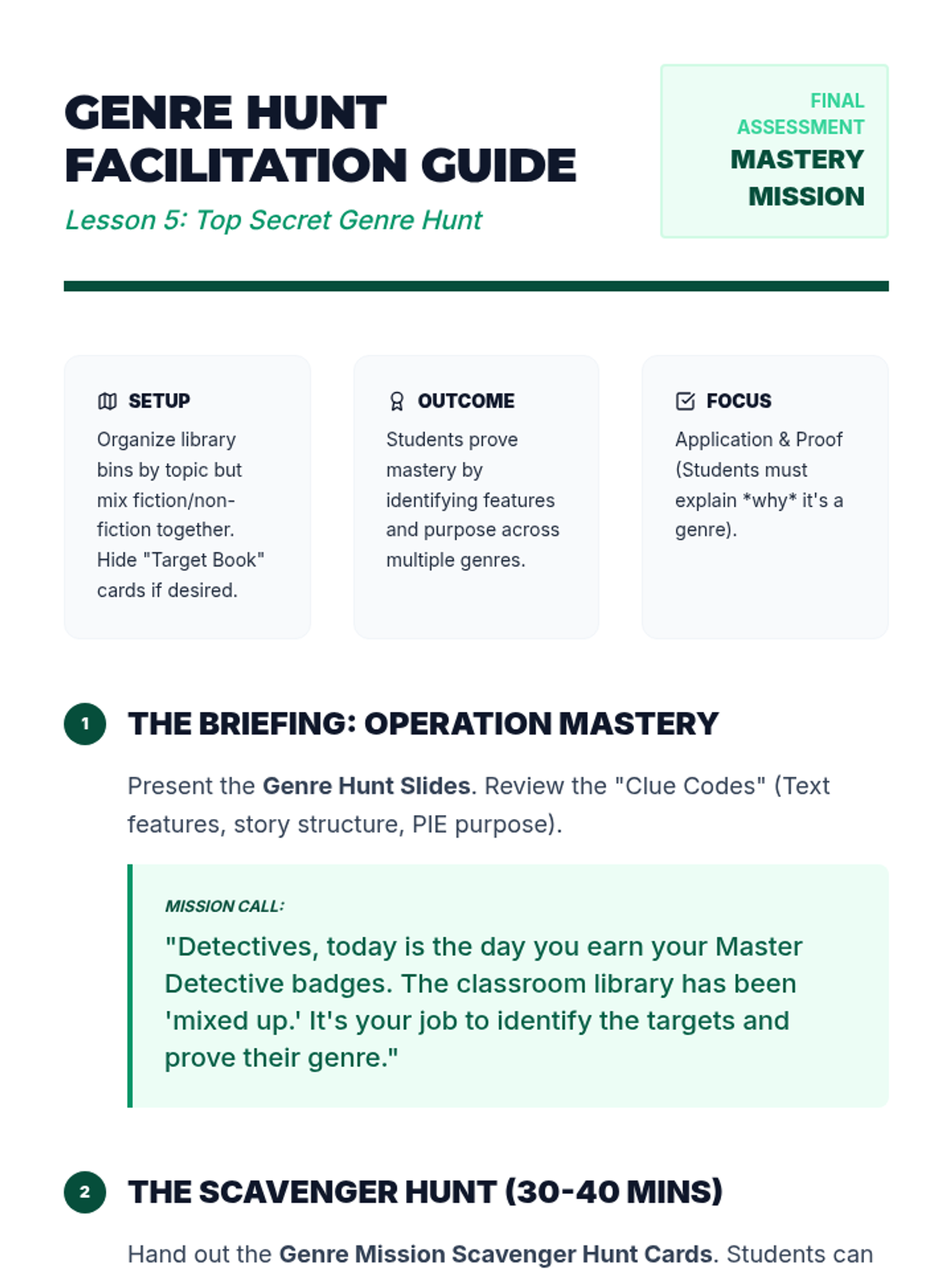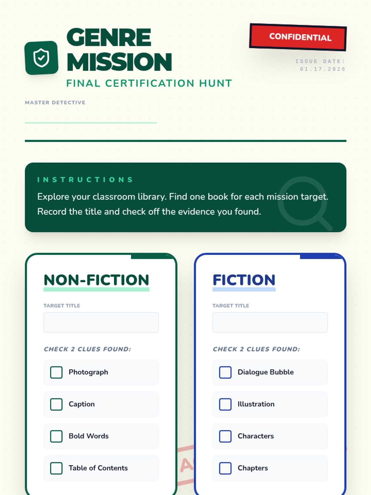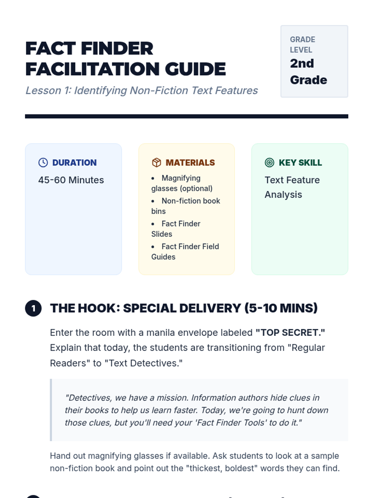 A 2nd-grade workshop-style sequence where students become 'Text Detectives' to distinguish between fiction and non-fiction. By exploring text features, narrative structures, and author's purpose, students learn to navigate different genres and retrieve information effectively.