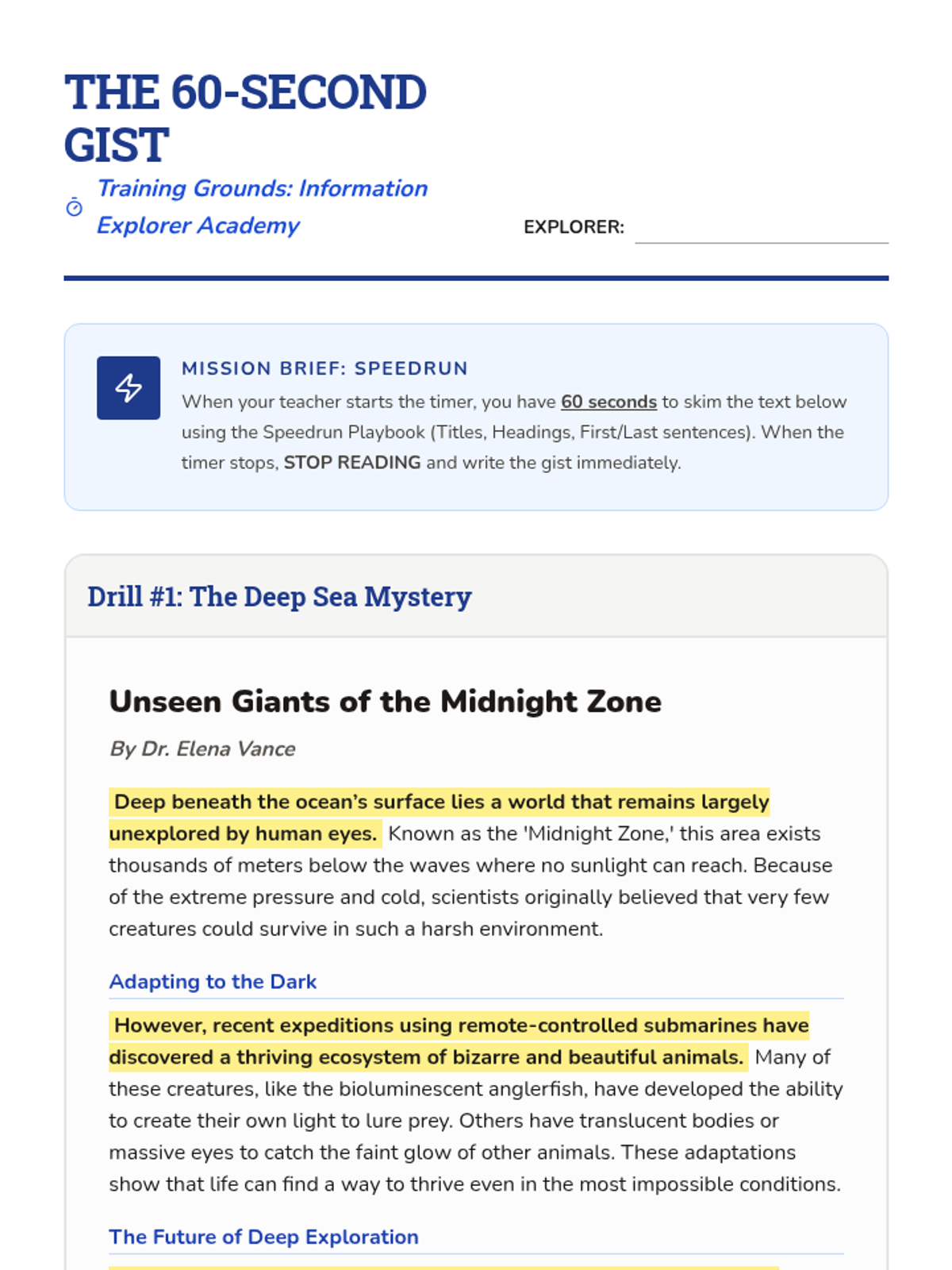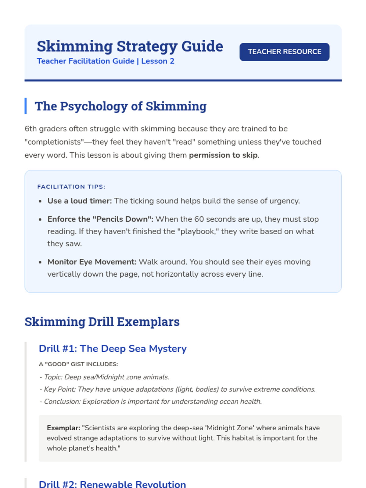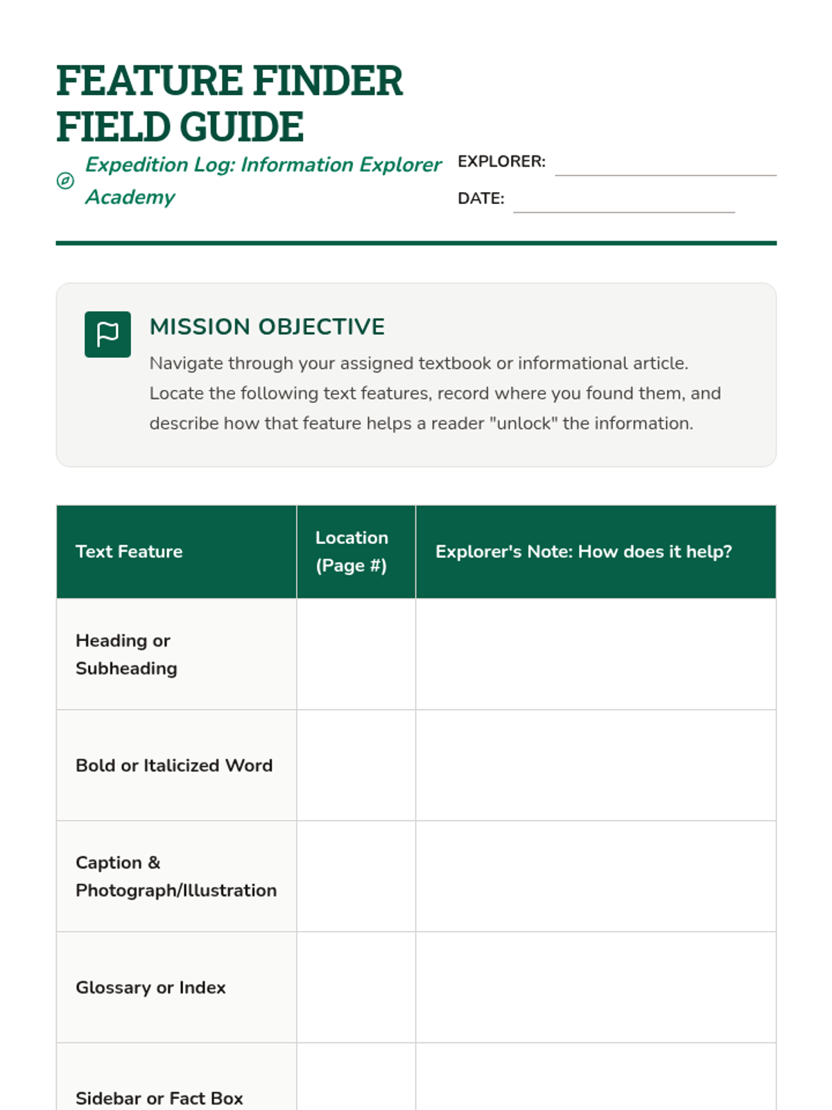 A comprehensive sequence for 6th-grade students to master informational text navigation, skimming and scanning techniques, active annotation, and information synthesis. Students develop critical study skills through an 'Information Explorer' theme, progressing from basic feature identification to complex synthesis.