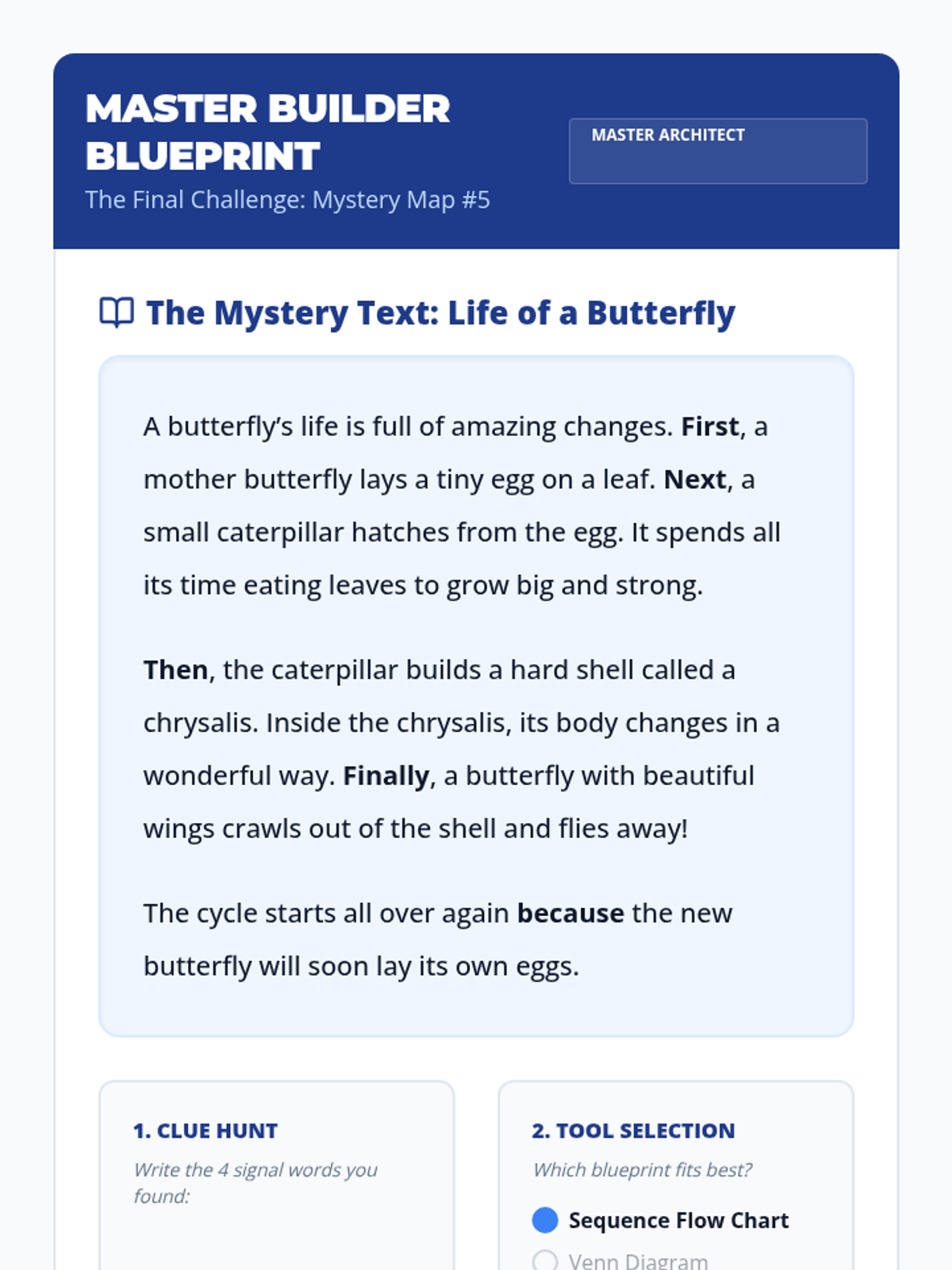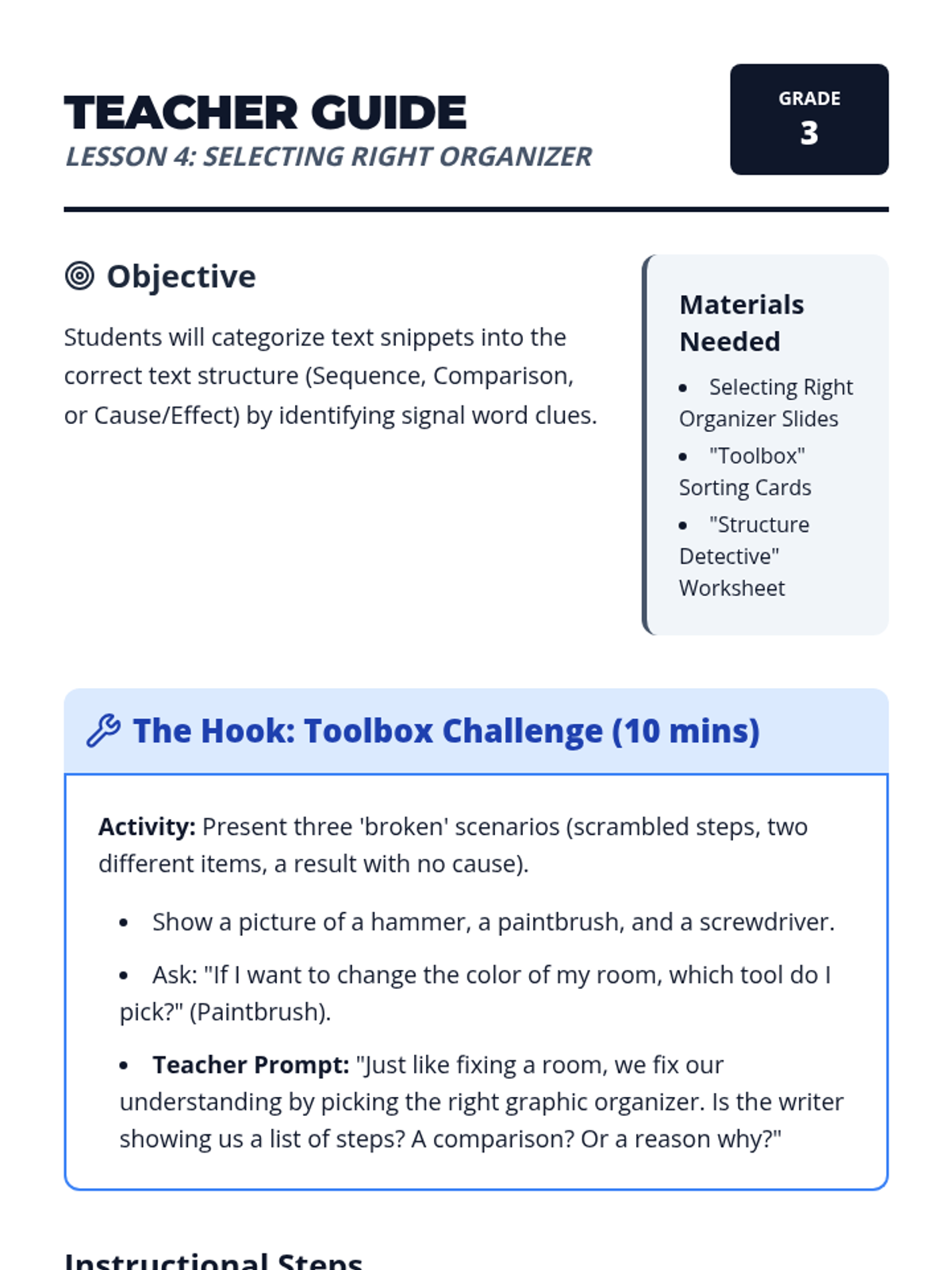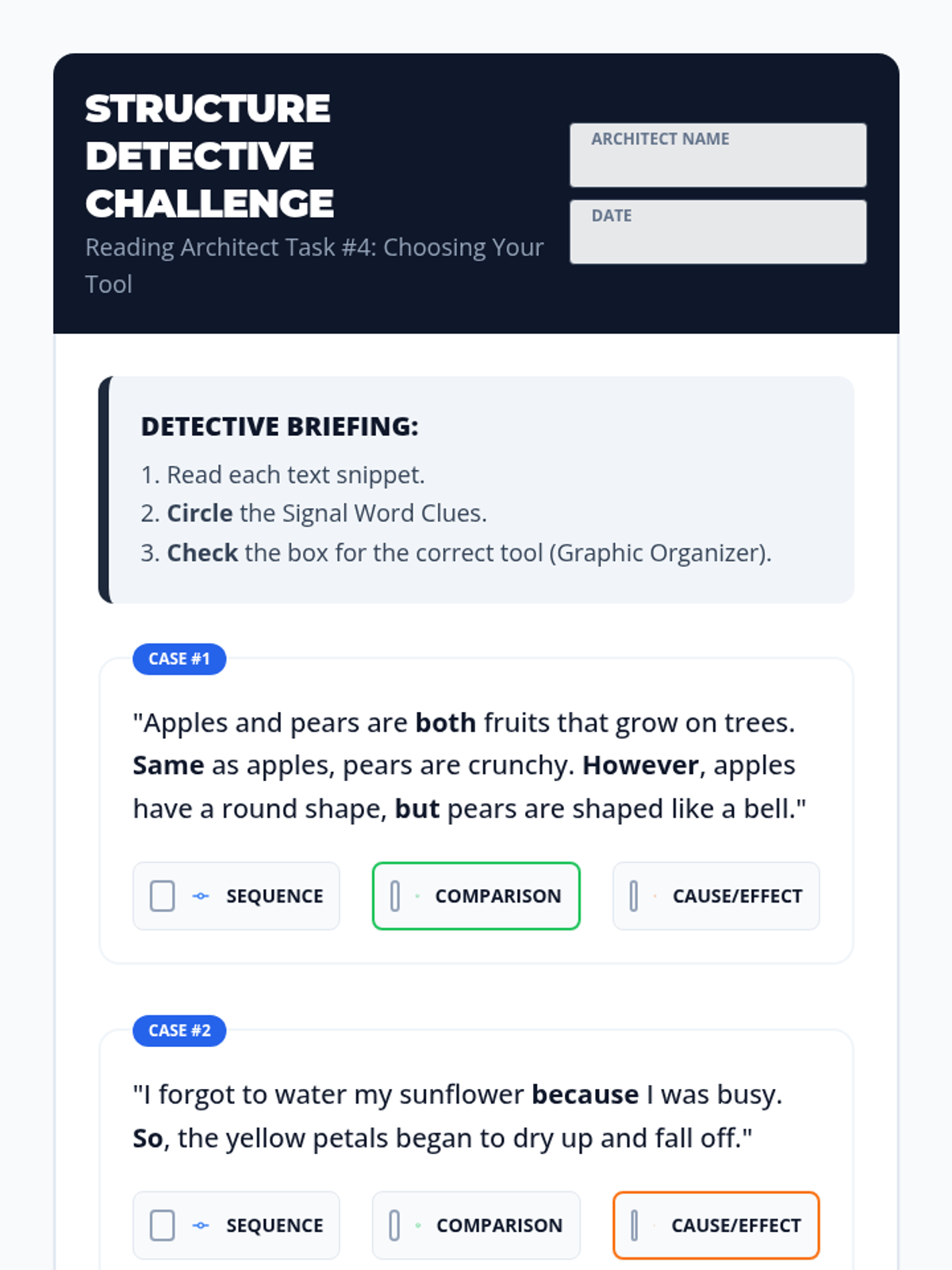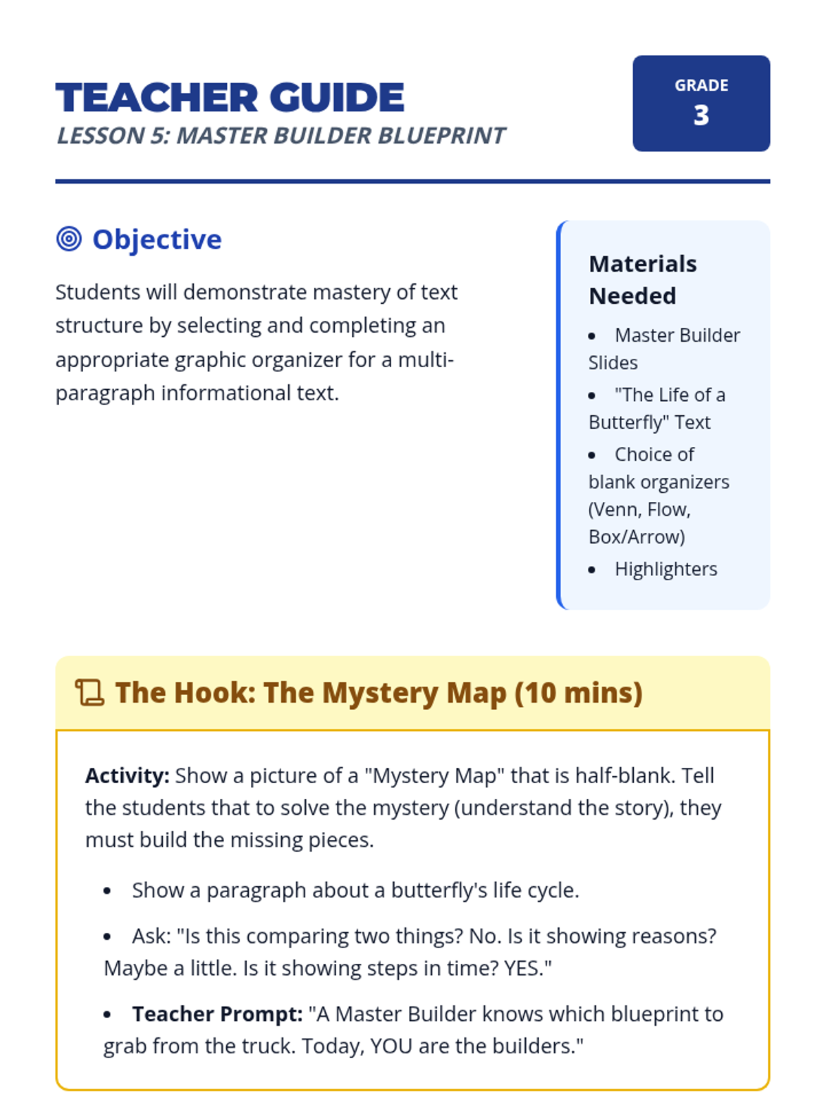 This sequence introduces 3rd-grade students to three primary text structures: sequence, comparison, and cause-effect. Using a 'Reading Architect' theme, students learn to use specific graphic organizers to map out information, identifying signal words as clues for which 'blueprint' to use.