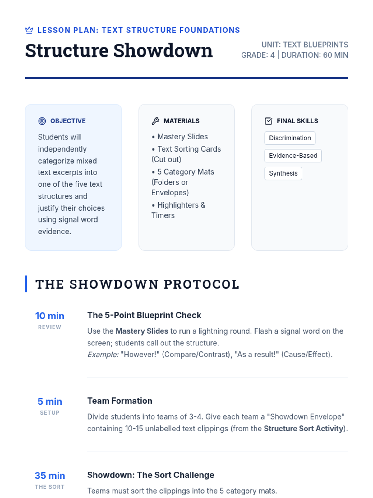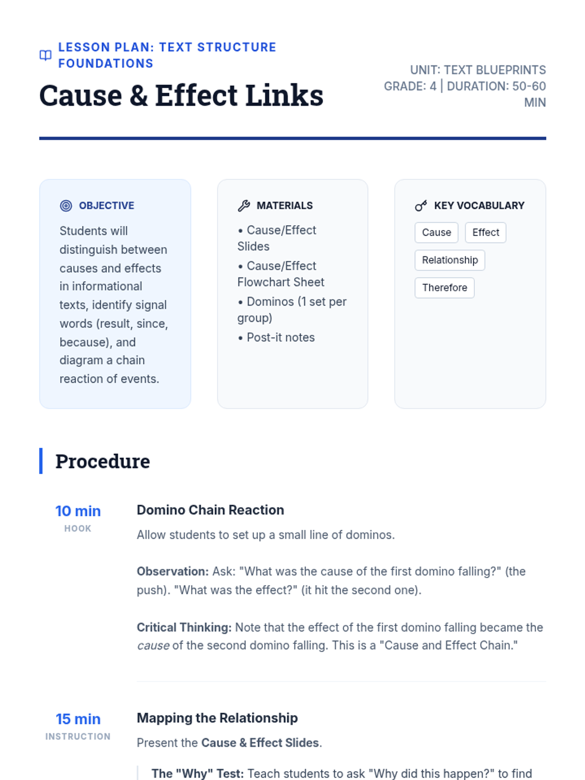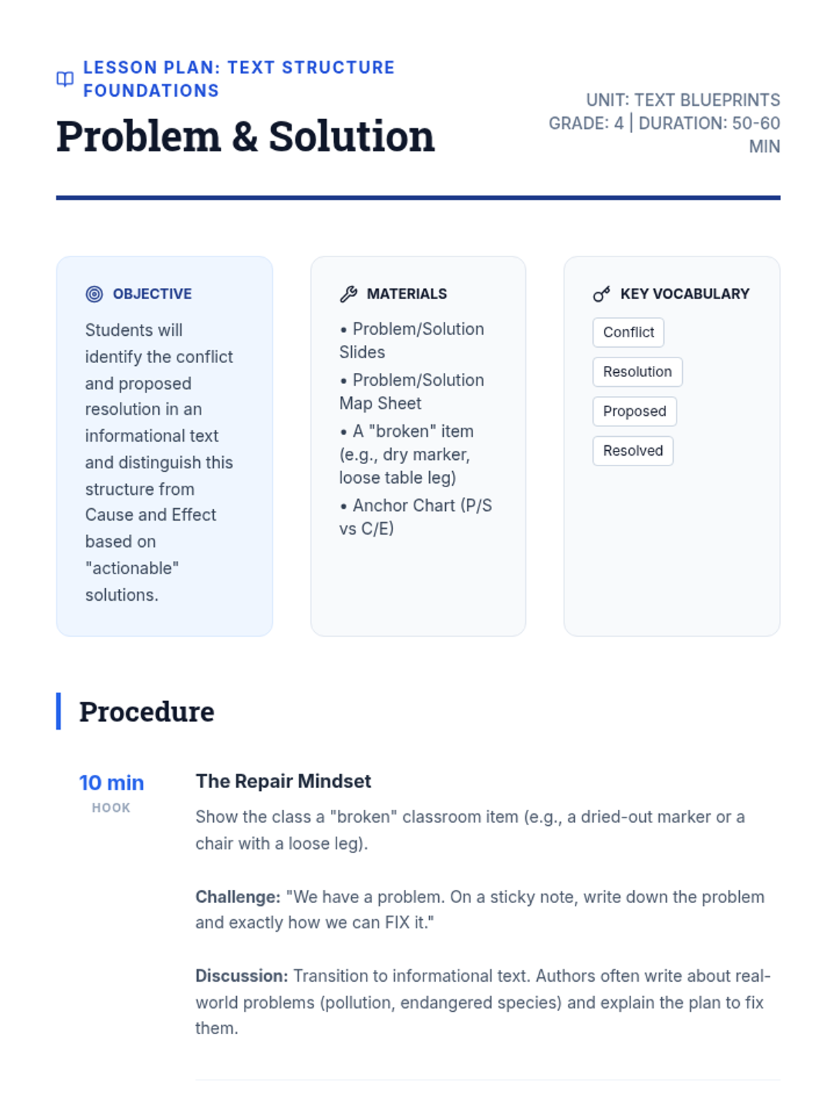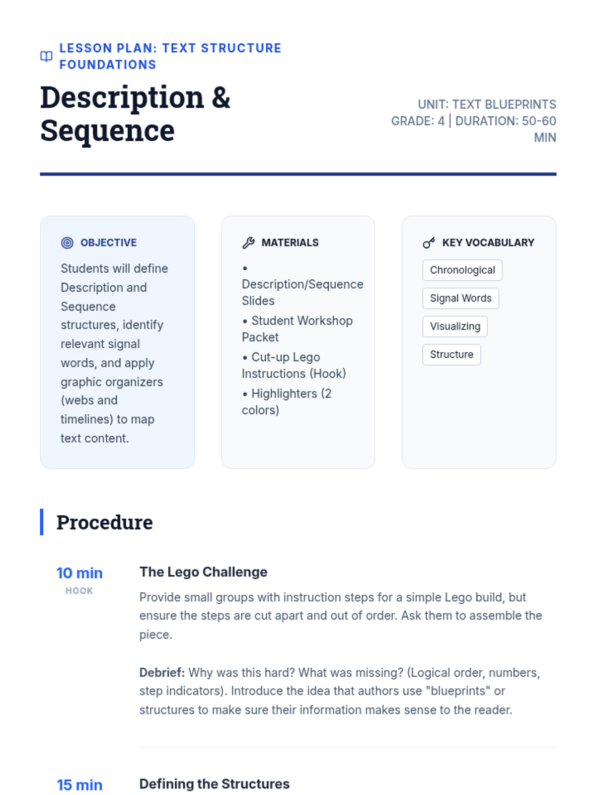 This sequence introduces 4th-grade students to the five primary informational text structures: description, sequence, compare/contrast, cause/effect, and problem/solution. Through a workshop model, students learn to identify signal words and use graphic organizers to map information.