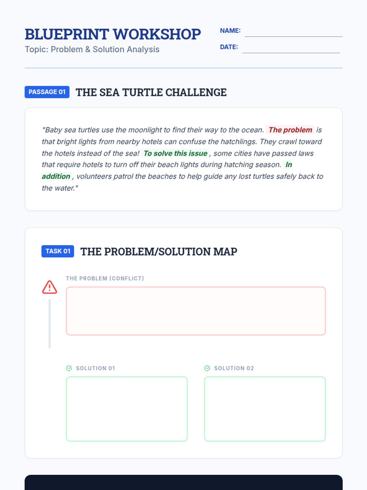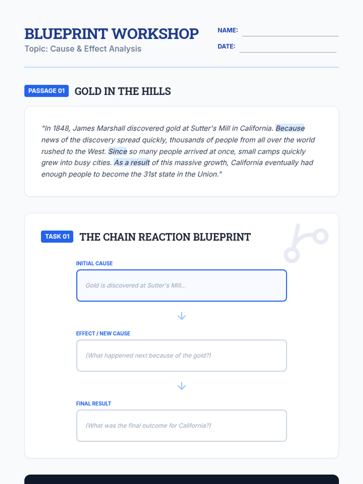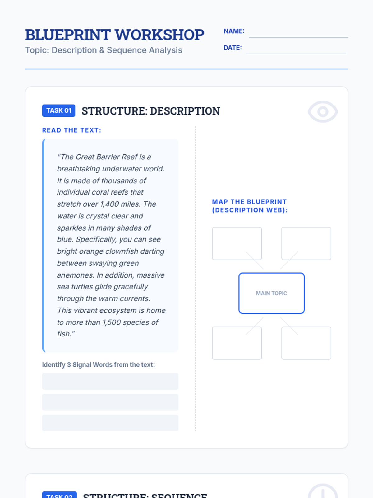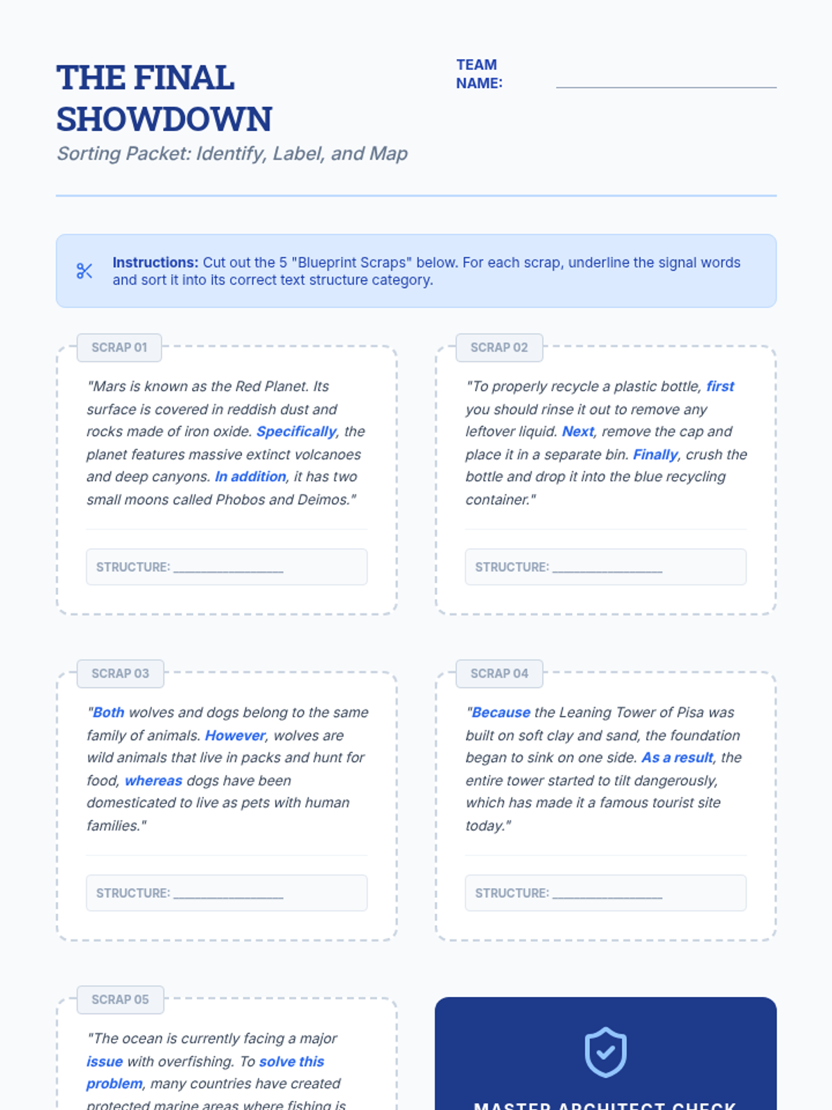 This sequence introduces 4th-grade students to the five primary informational text structures: description, sequence, compare/contrast, cause/effect, and problem/solution. Through a workshop model, students learn to identify signal words and use graphic organizers to map information.