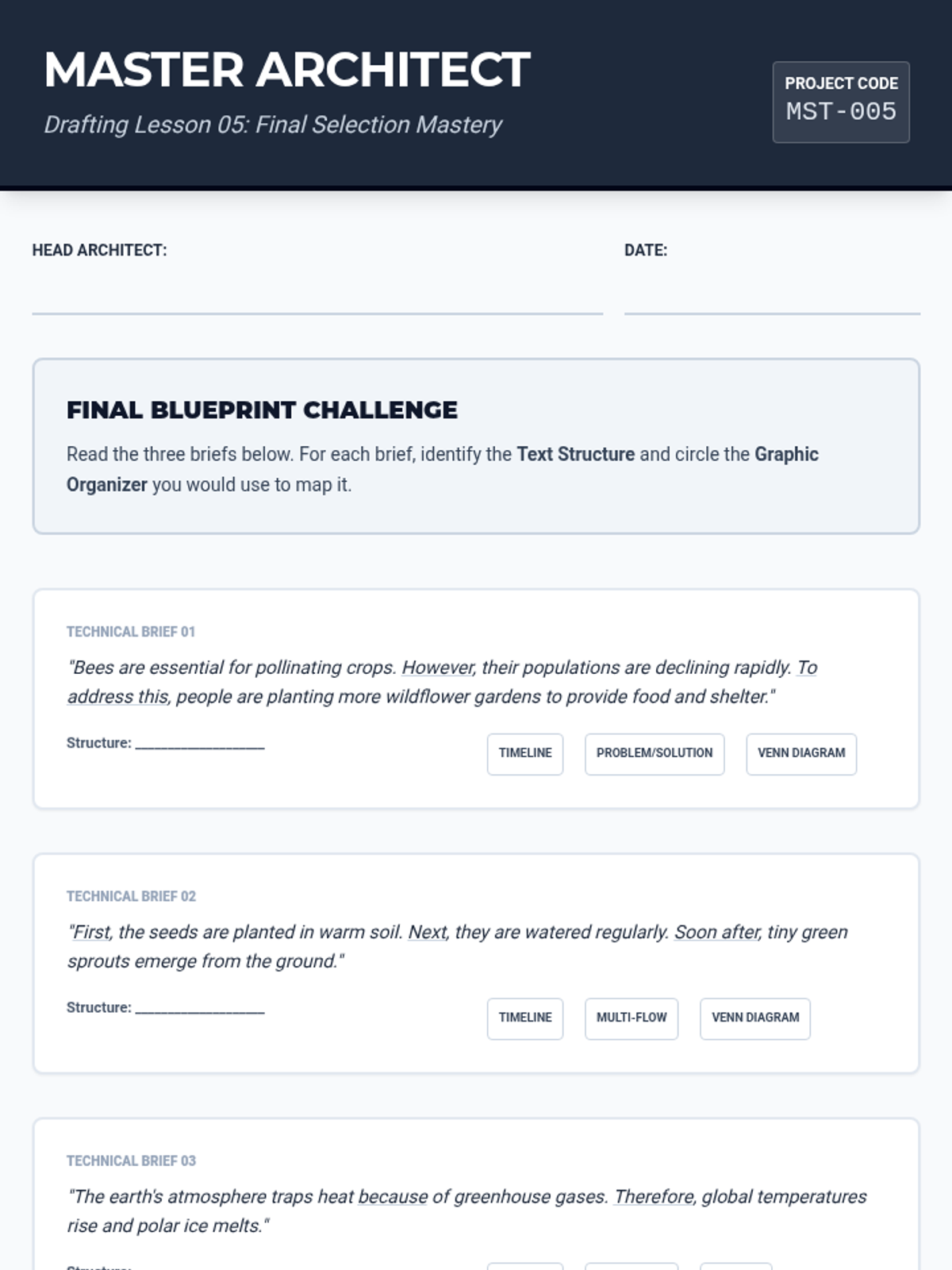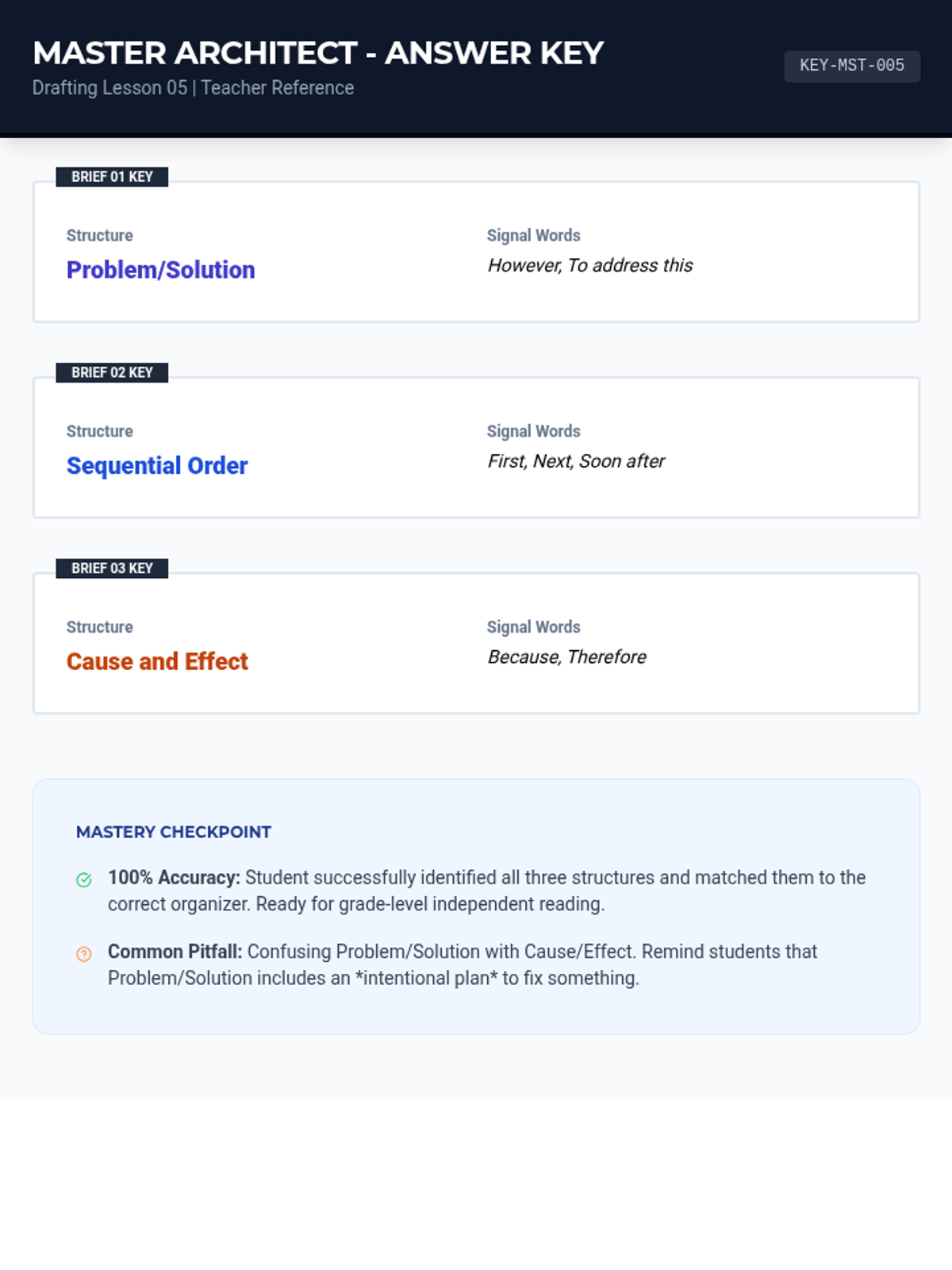 A 5-lesson sequence for 6th-grade students focused on identifying informational text structures (sequence, comparison, cause/effect, problem/solution) and mapping them onto specific graphic organizers to improve comprehension.