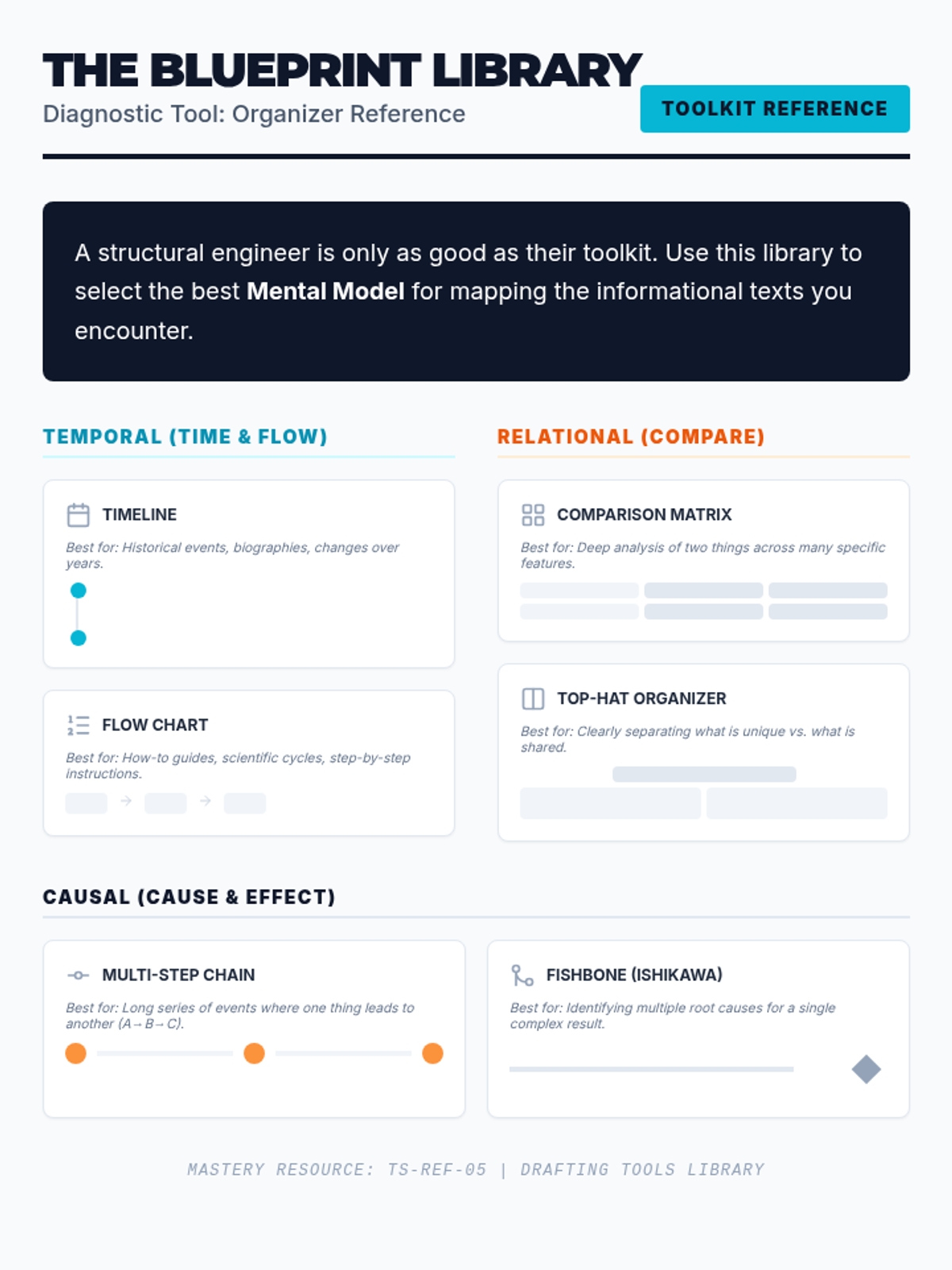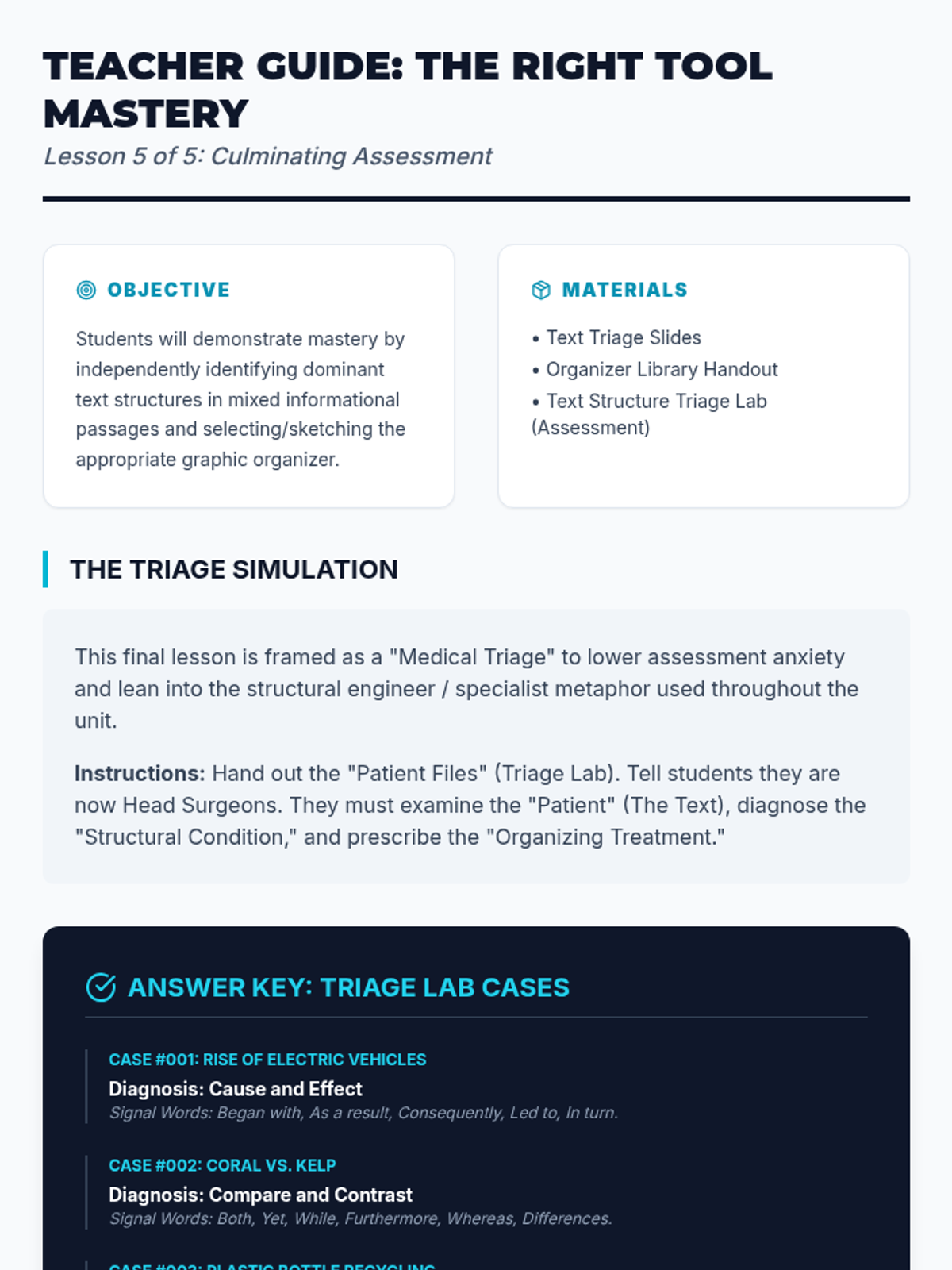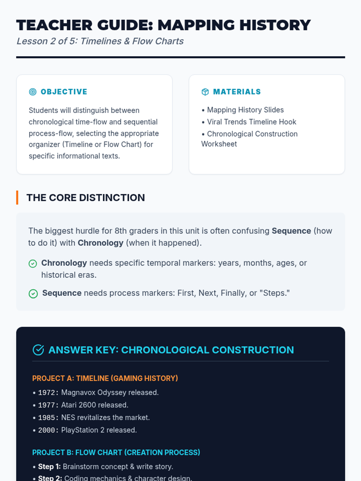 This sequence teaches 8th-grade students to identify and map informational text structures using visual scaffolds. Students learn signal words and practice using chronological, compare-contrast, and cause-effect graphic organizers to improve reading comprehension and information retention.