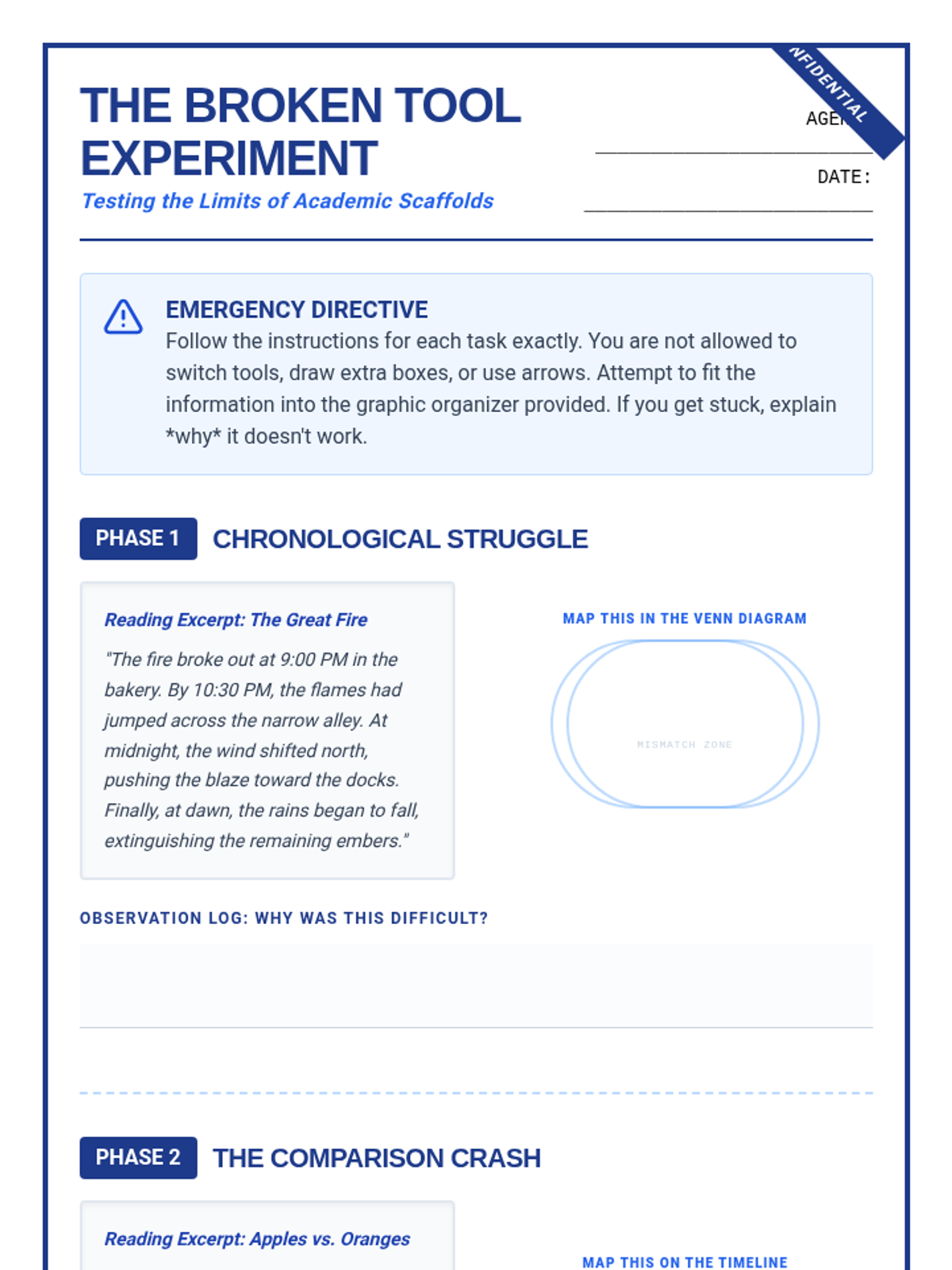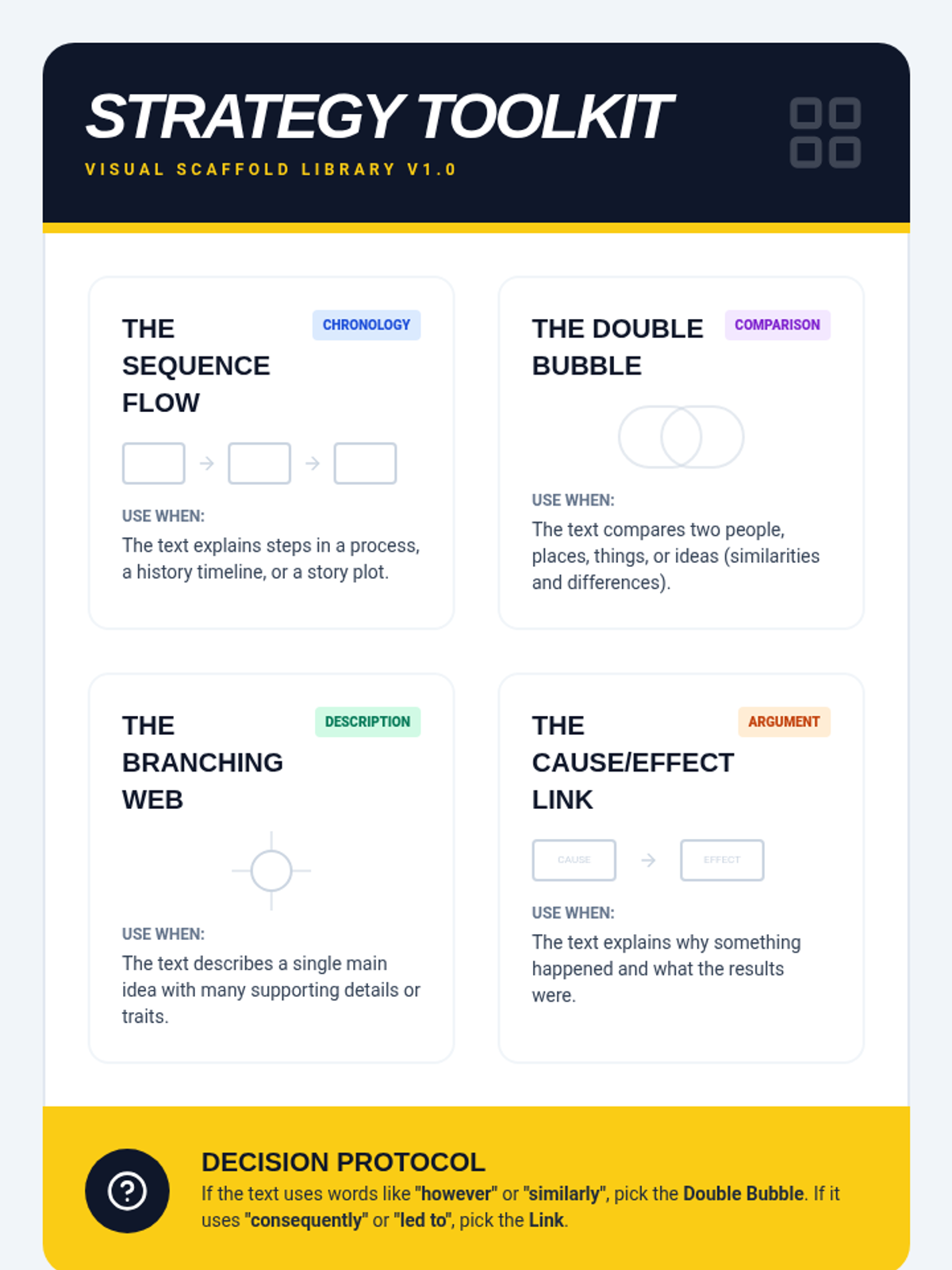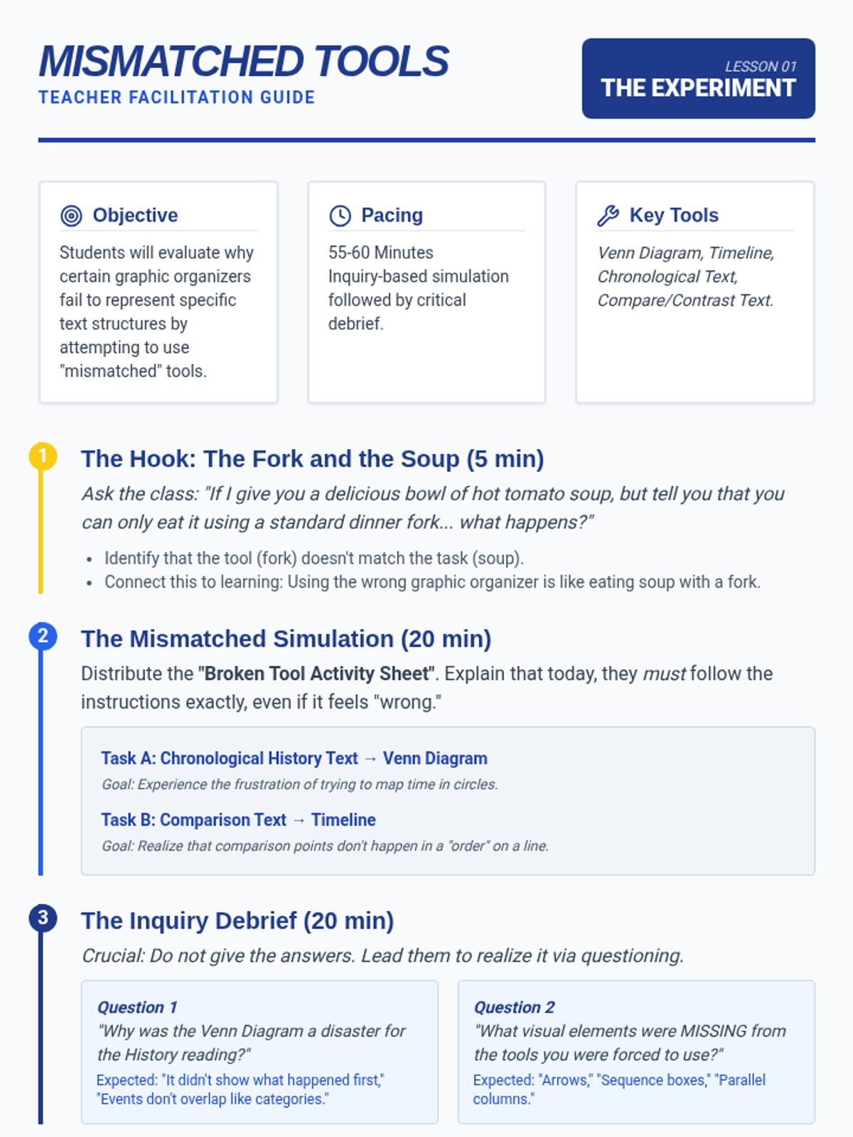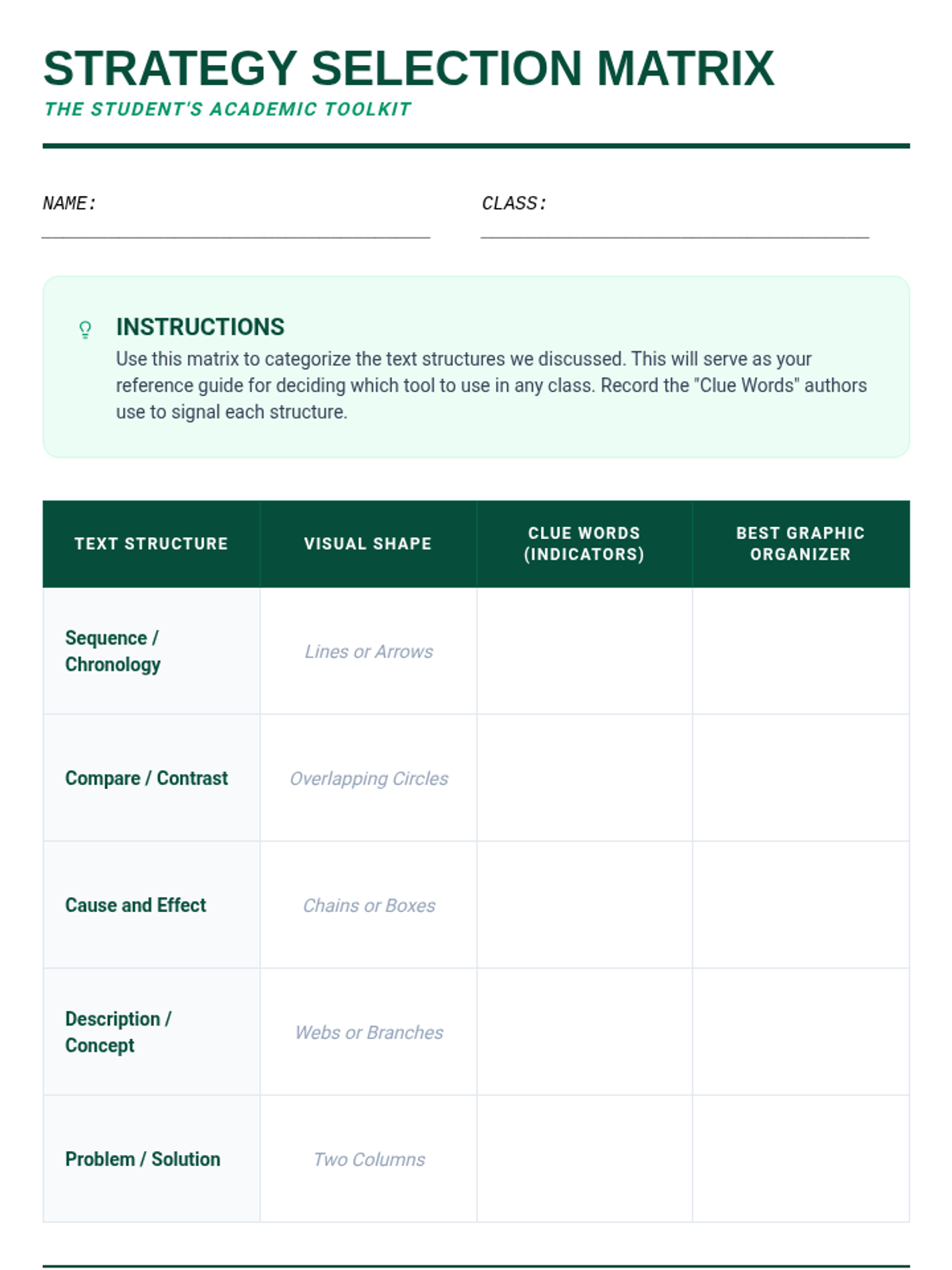 A metacognitive exploration of text structures where 10th-grade students experiment with different graphic organizers to determine which visual scaffolds best support specific academic tasks. Students move from controlled experiments with 'mismatched' tools to independent strategic selection, building a personalized toolkit for general education success.