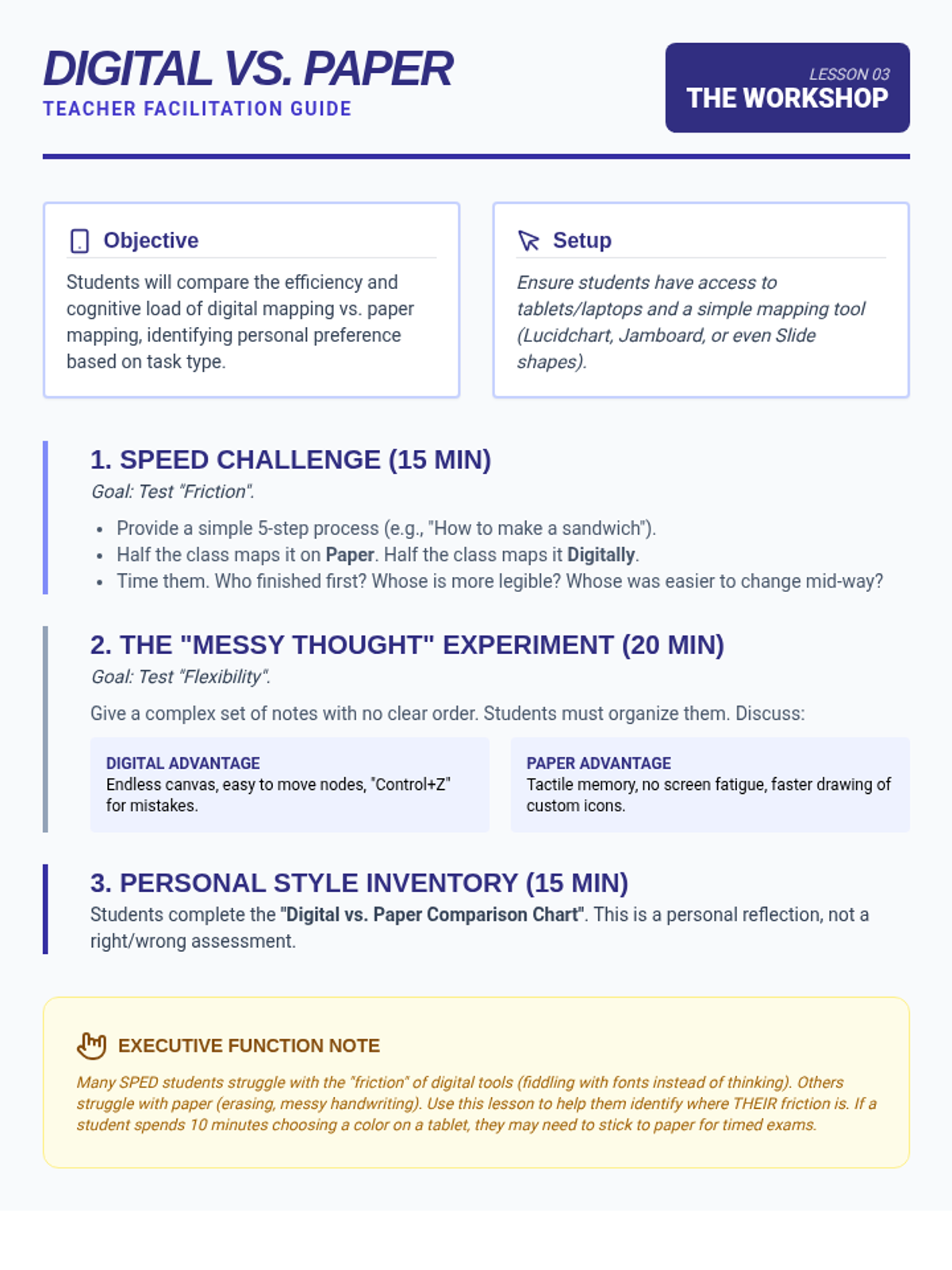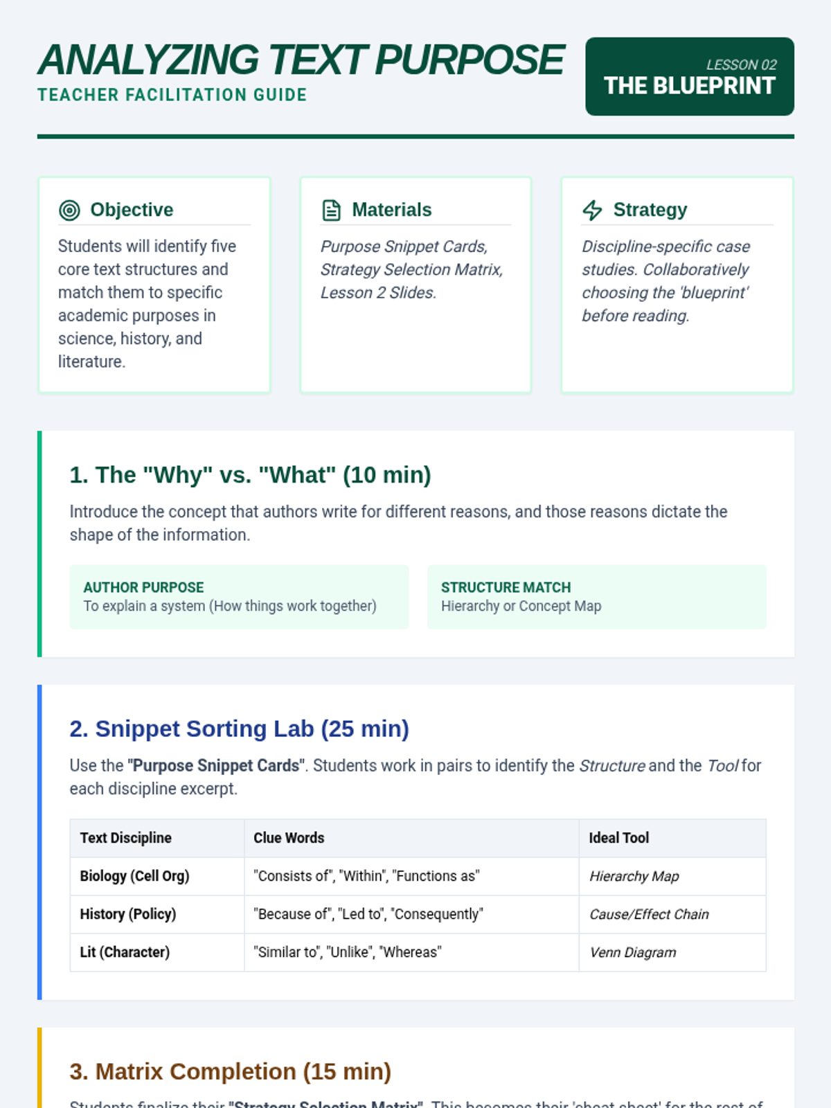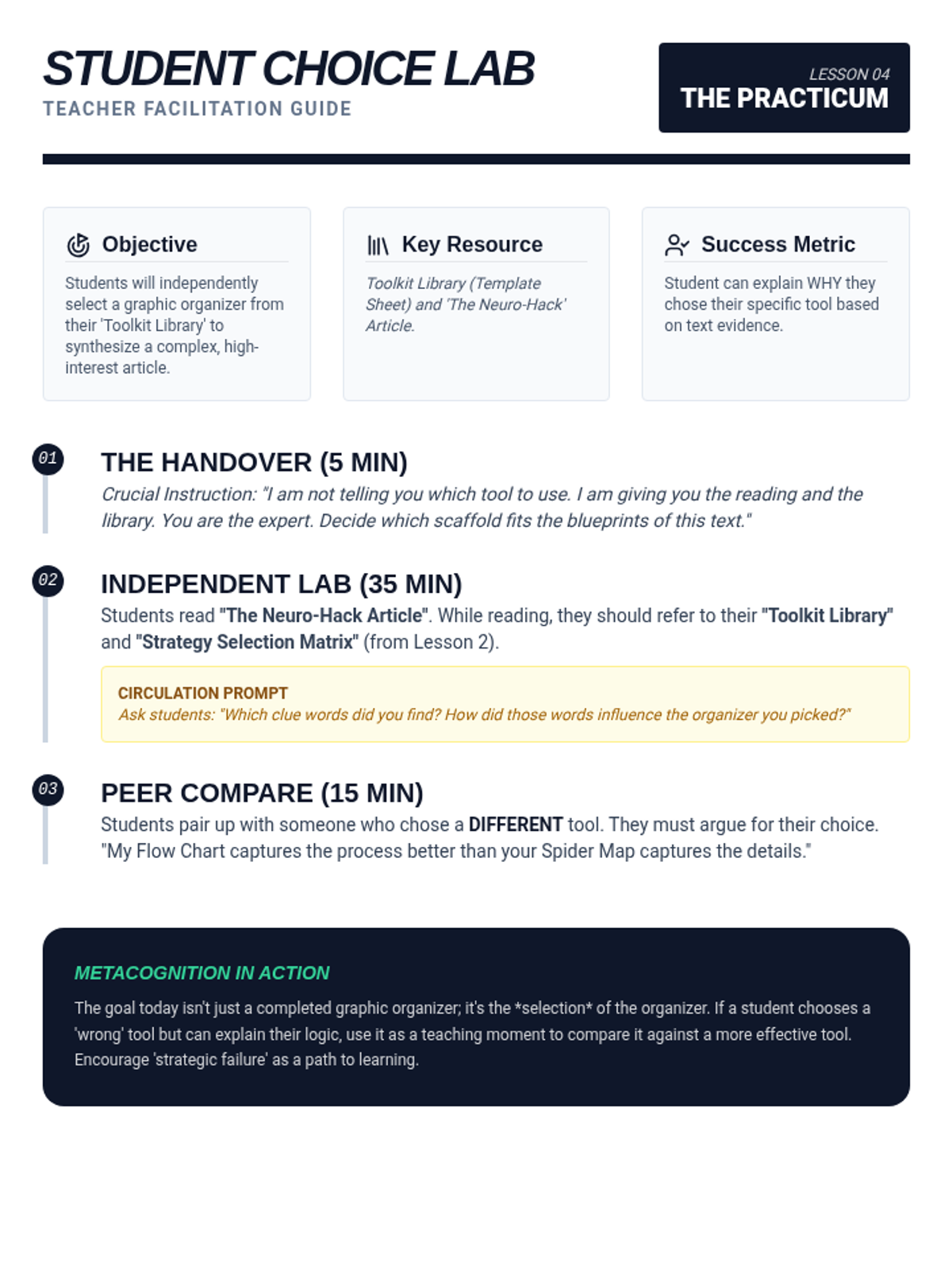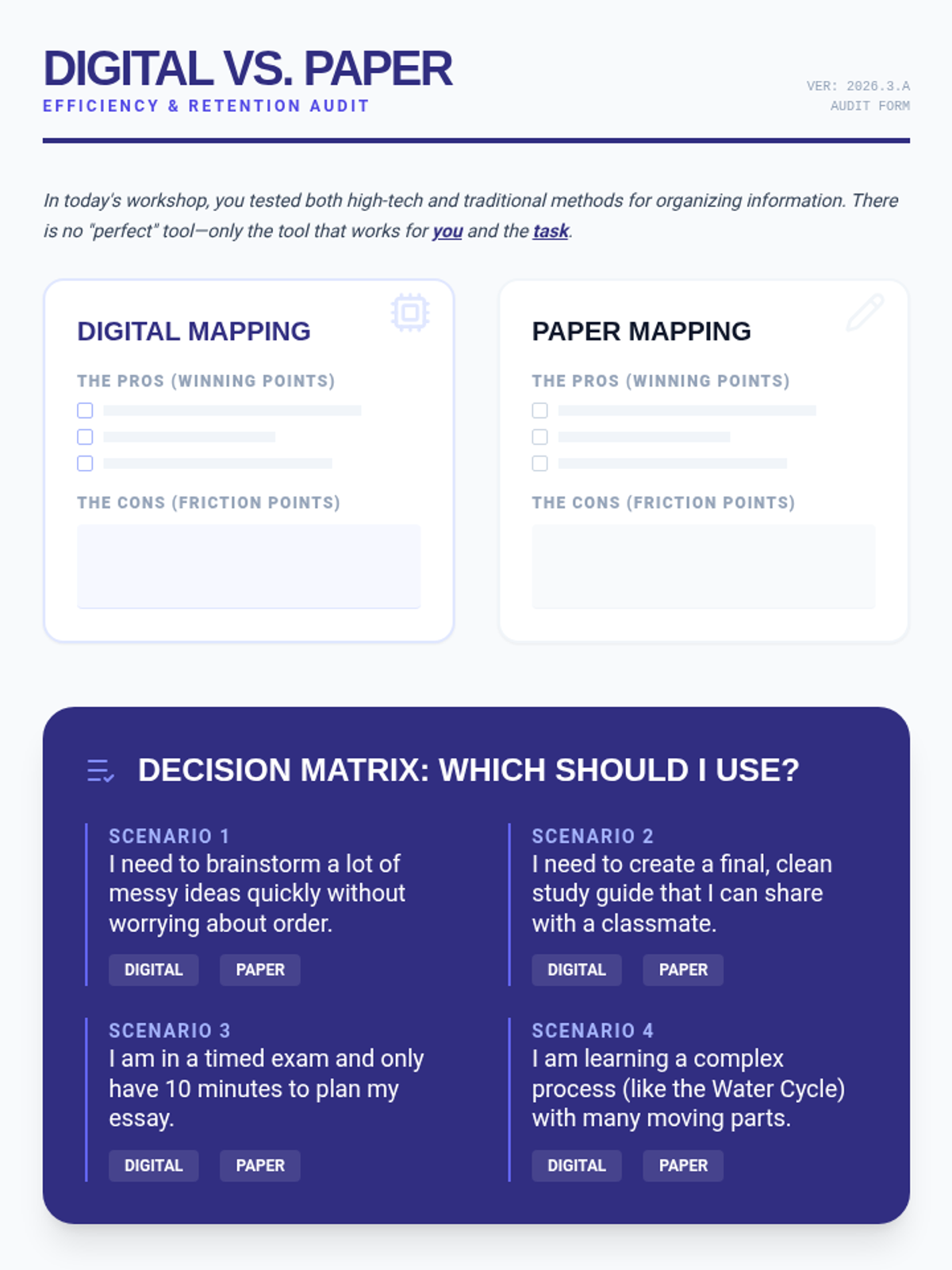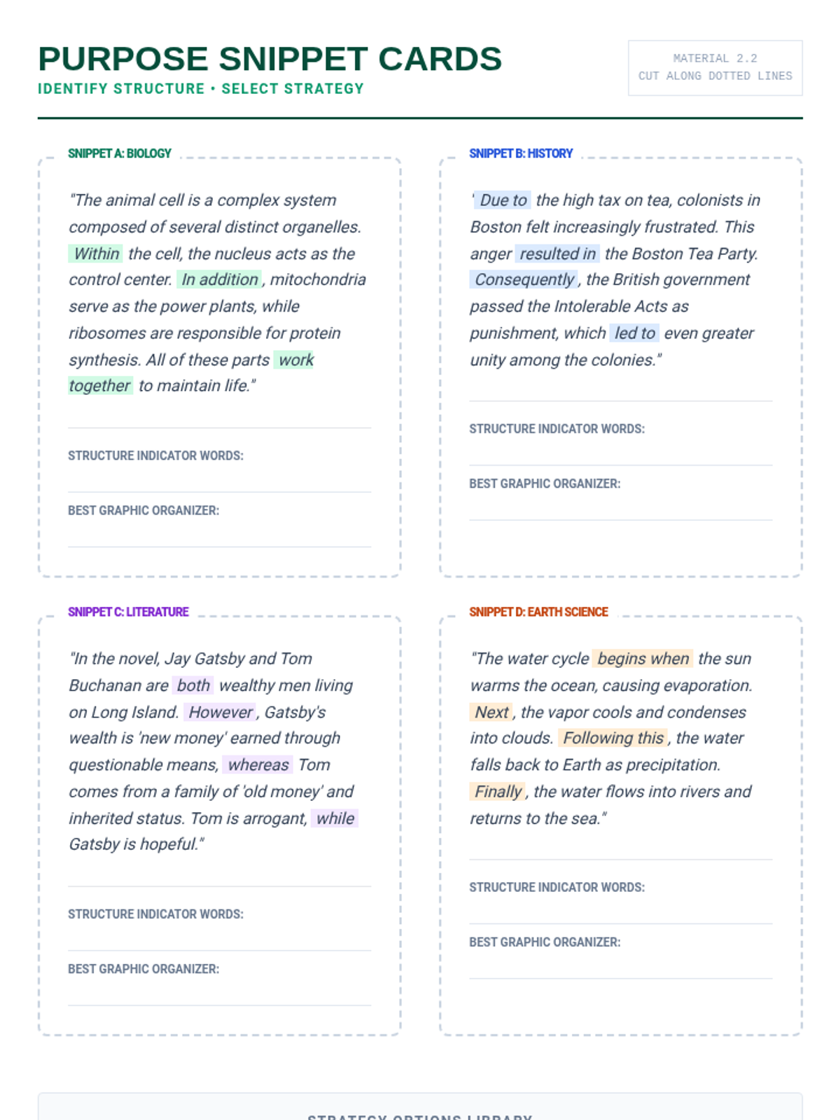 A metacognitive exploration of text structures where 10th-grade students experiment with different graphic organizers to determine which visual scaffolds best support specific academic tasks. Students move from controlled experiments with 'mismatched' tools to independent strategic selection, building a personalized toolkit for general education success.