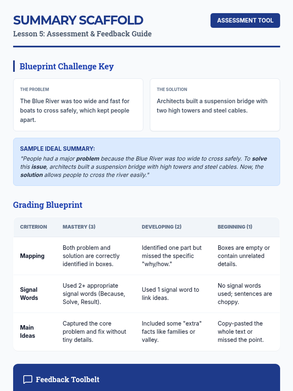 A 5-lesson sequence for 7th-grade students focusing on identifying informational text structures through signal words and mapping them using specific graphic organizers to improve comprehension and summary writing.