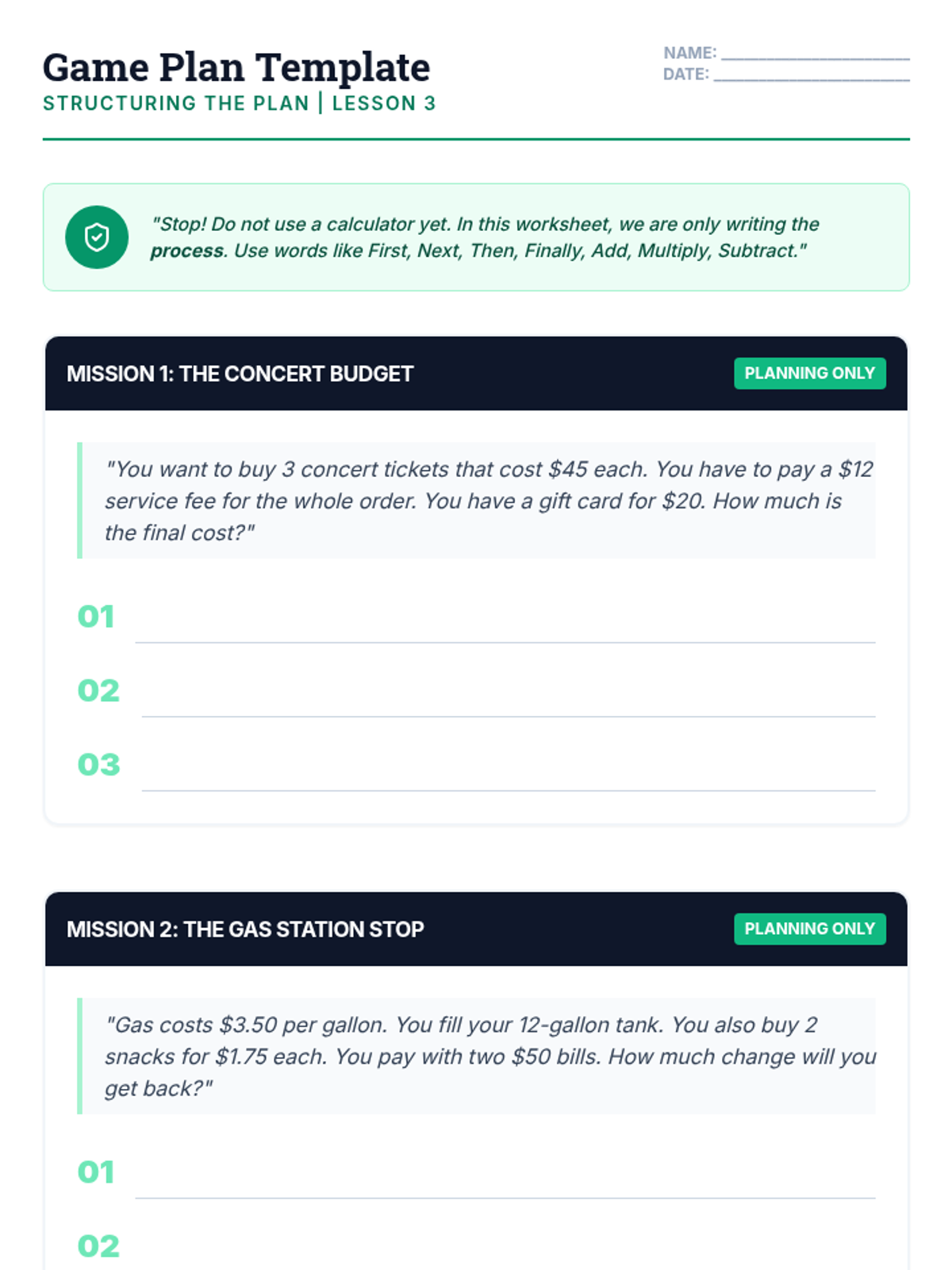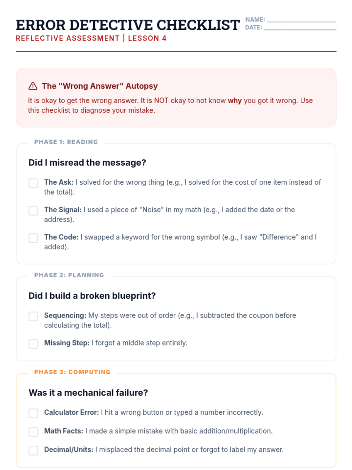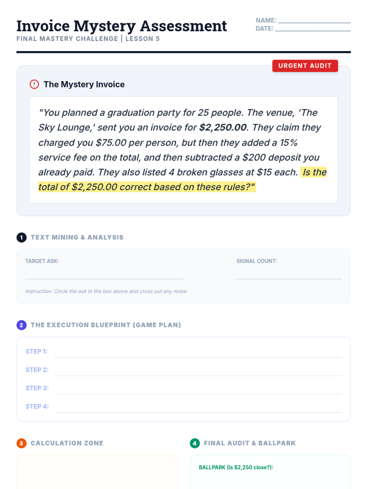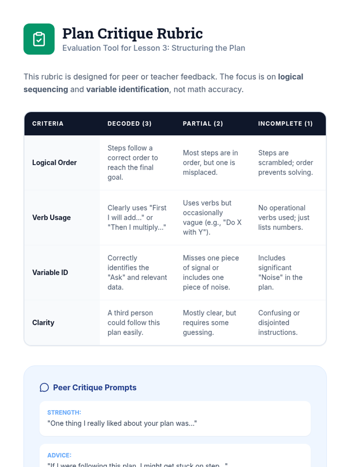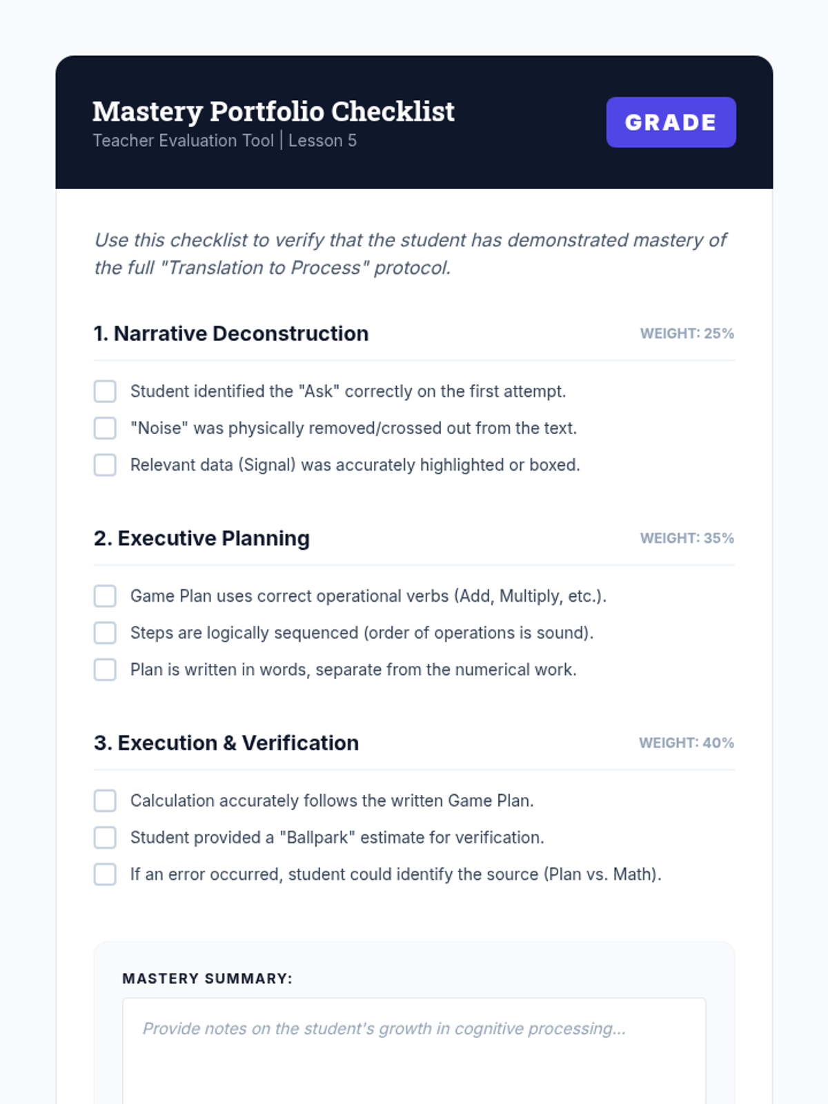 A specialized sequence for 12th-grade students with learning disabilities, focusing on breaking down complex math word problems through linguistic translation, executive planning, and systematic execution. Students learn to strip away narrative noise and build logical blueprints before calculating.