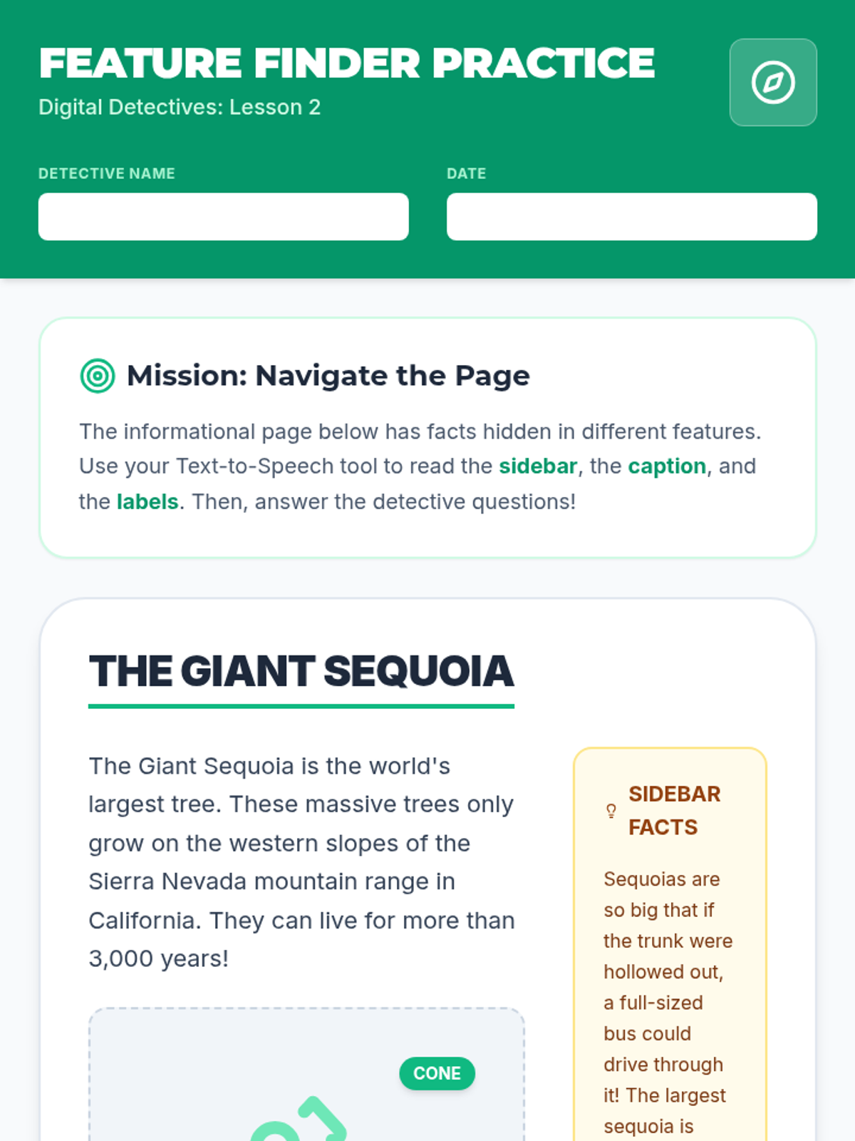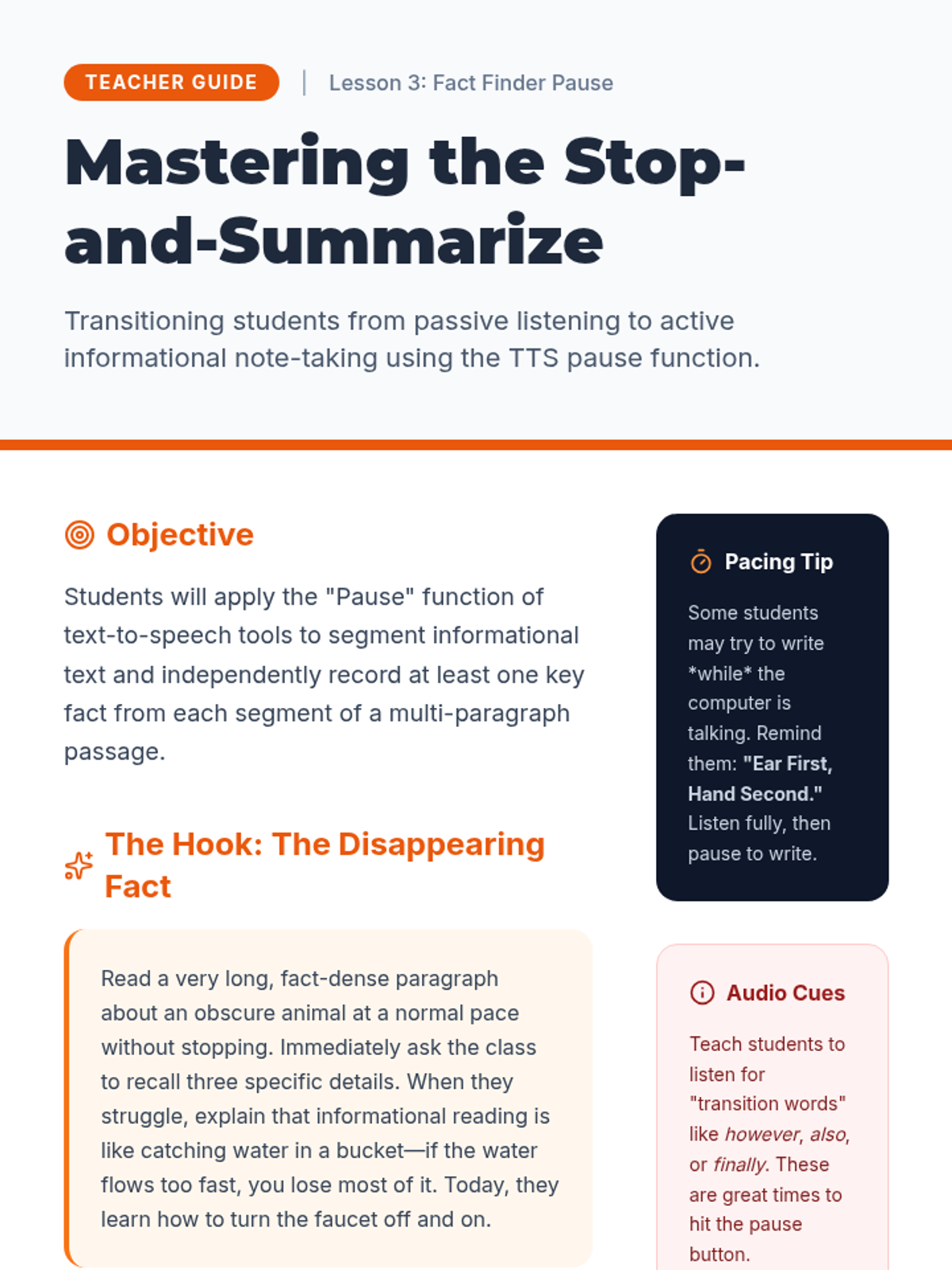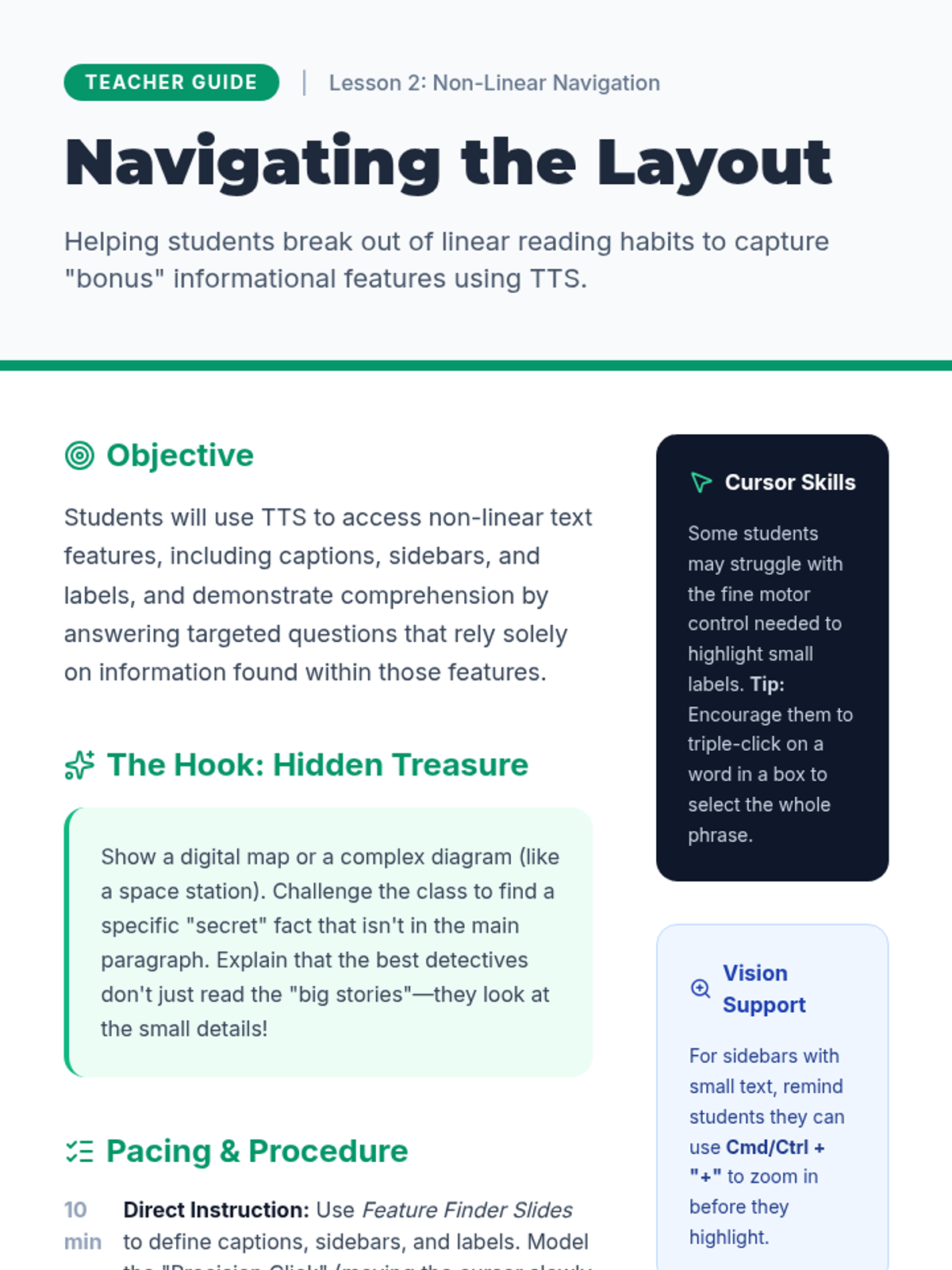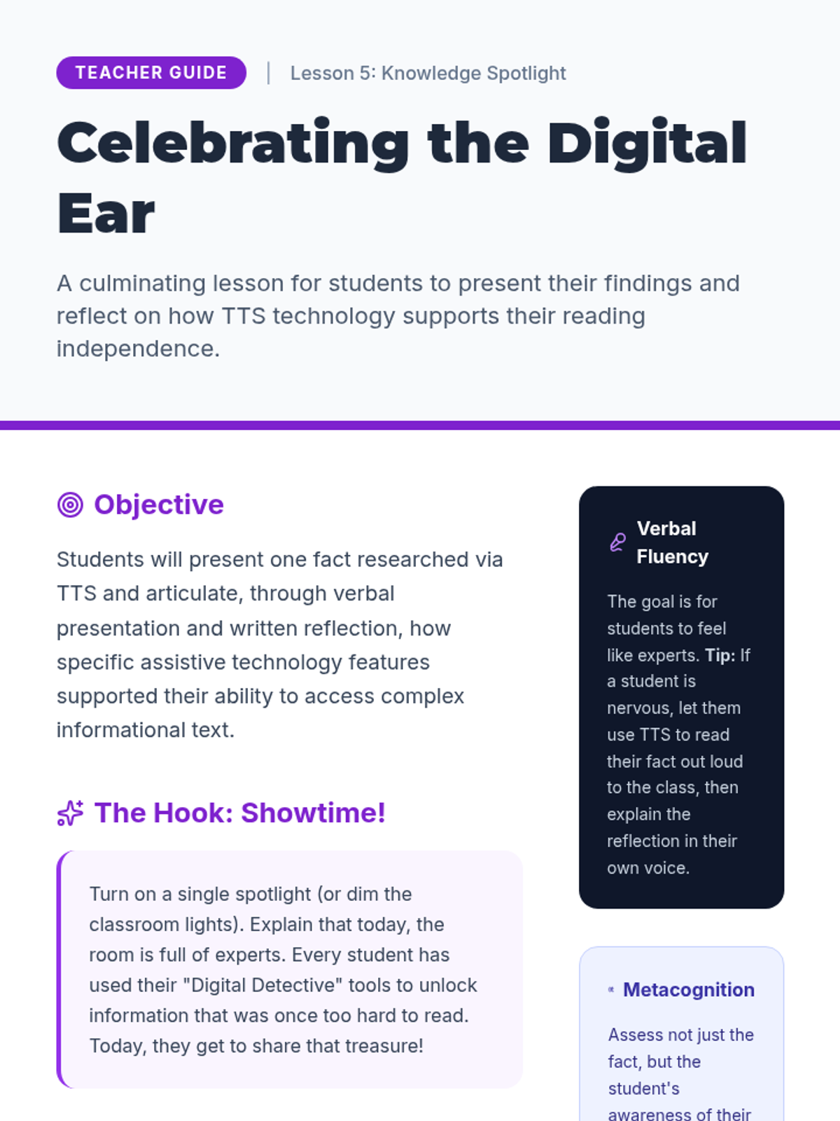 A 5-lesson sequence designed for 3rd-grade students to master the use of text-to-speech (TTS) technology for decoding informational texts, academic vocabulary, and non-linear text features like captions and sidebars. Students progress from decoding individual words to synthesizing information from multiple sources for research and presentation.