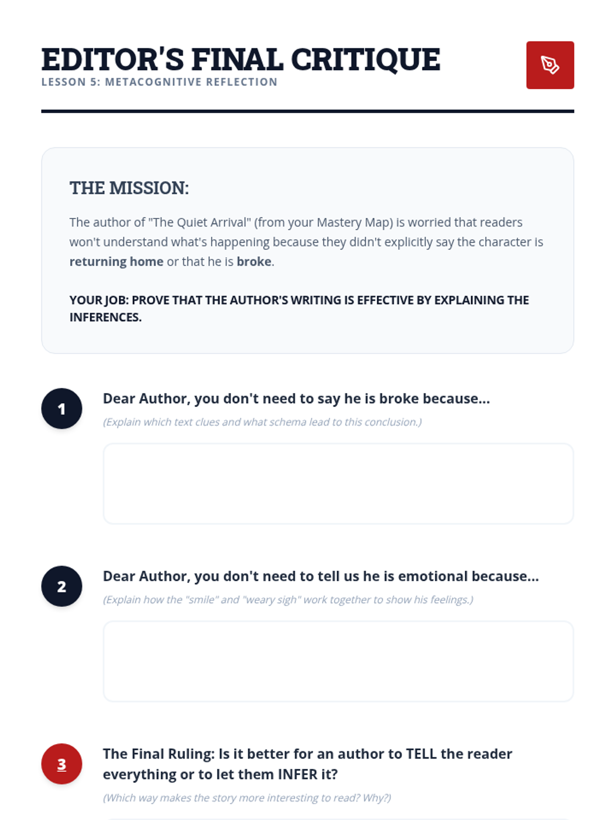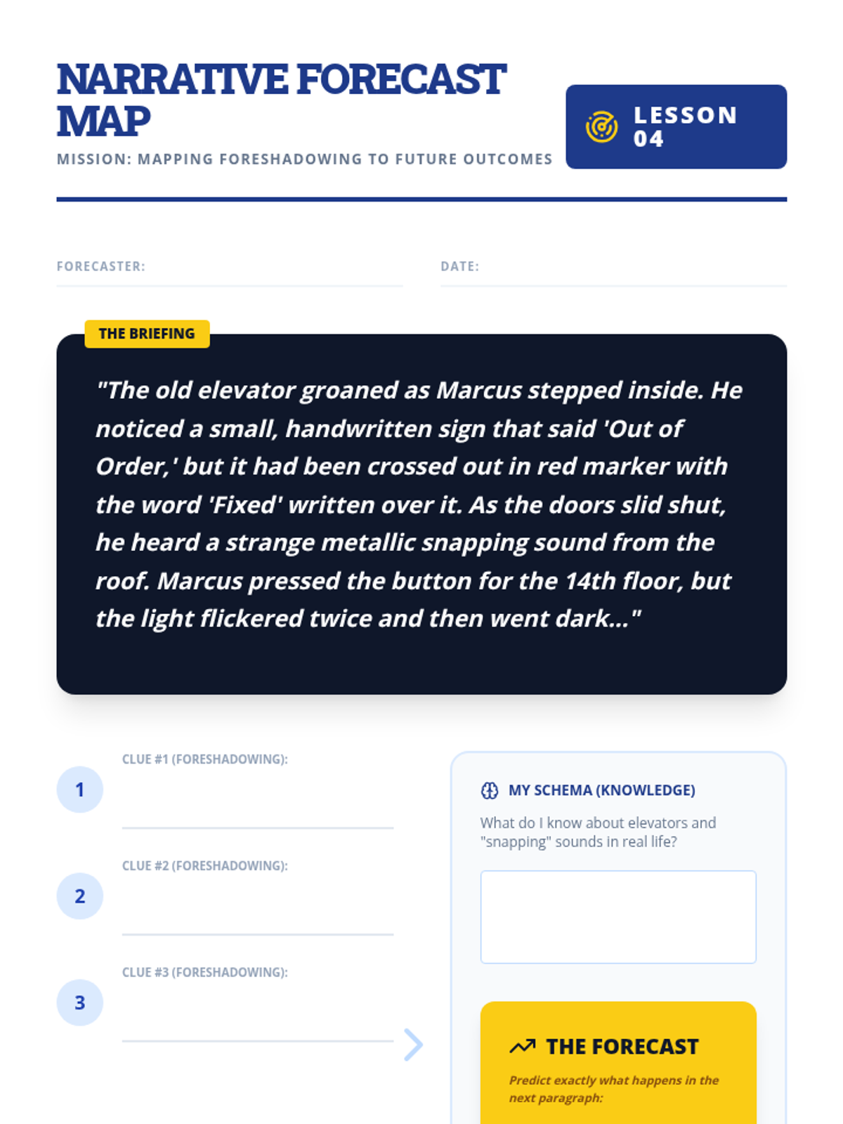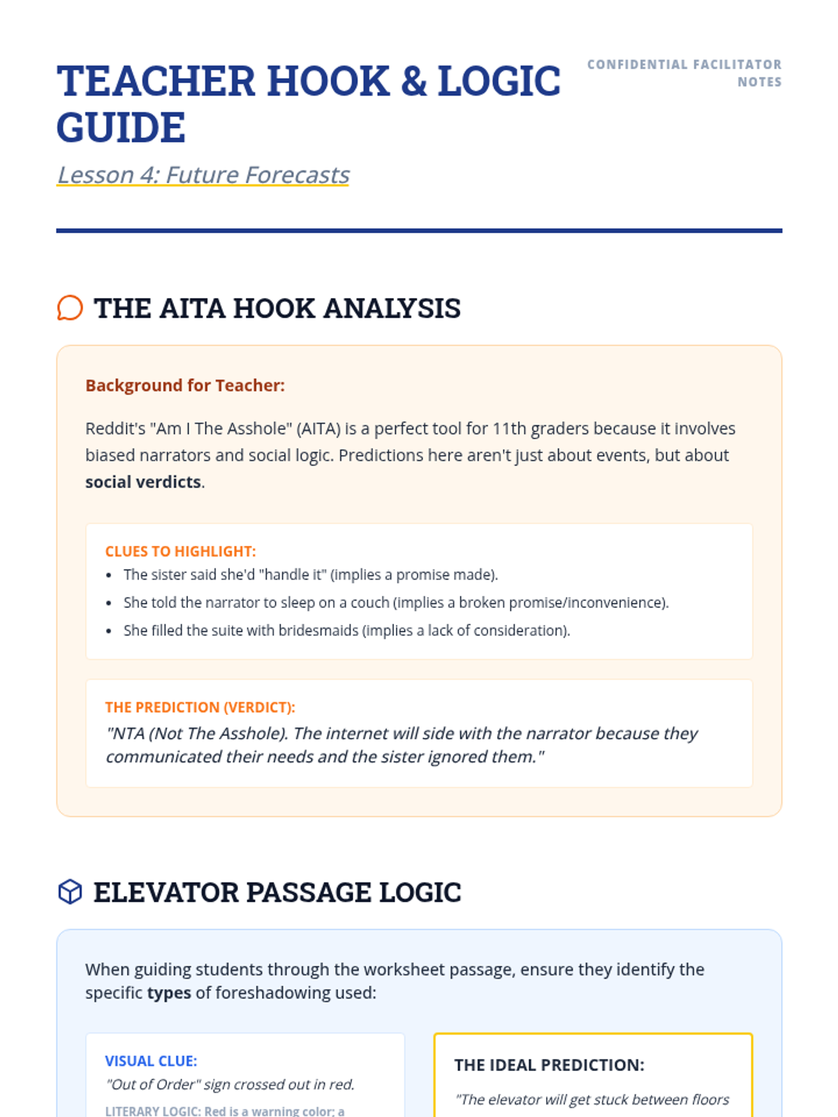 A structured ELA workshop sequence for 11th-grade academic support, focusing on the cognitive process of making inferences and predictions. Students move from visual analysis to complex text synthesis using the 'Evidence + Schema = Inference' equation.