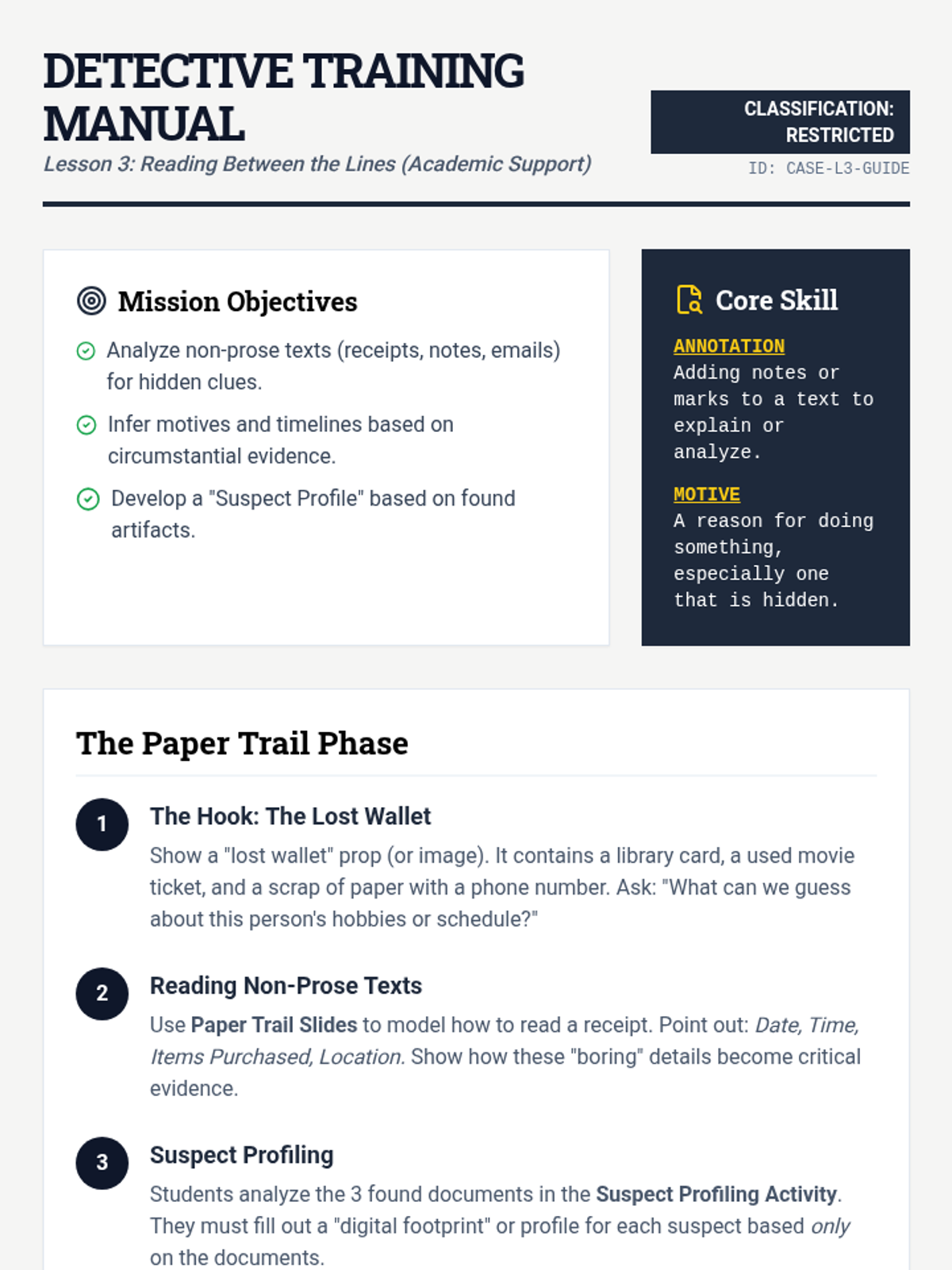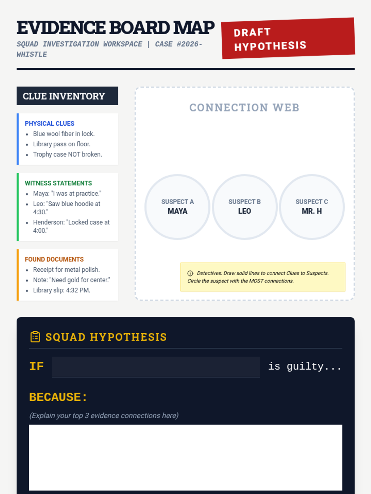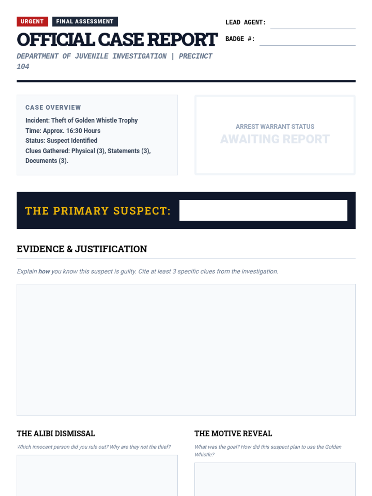 An immersive, gamified mystery sequence where 6th-grade students act as detectives to master predictions and inferences. By analyzing physical clues, witness statements, and found documents, students apply deductive reasoning to solve the 'Case of the Missing Golden Whistle.'