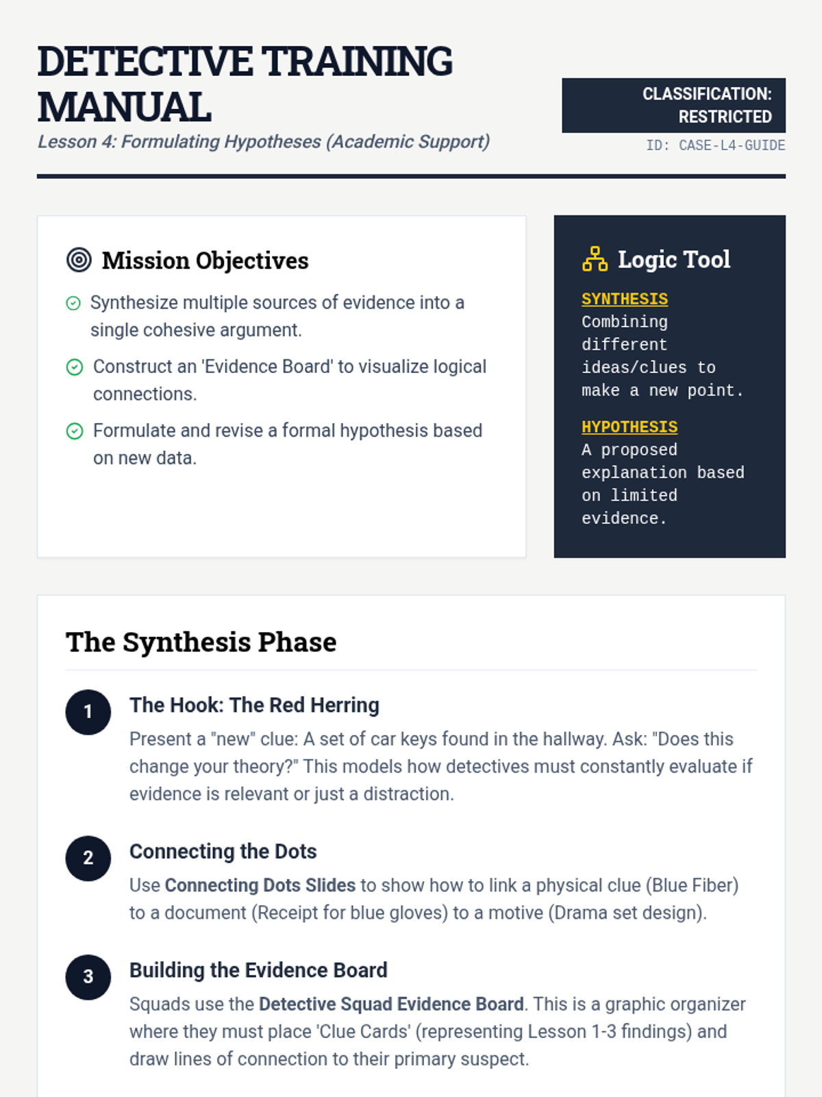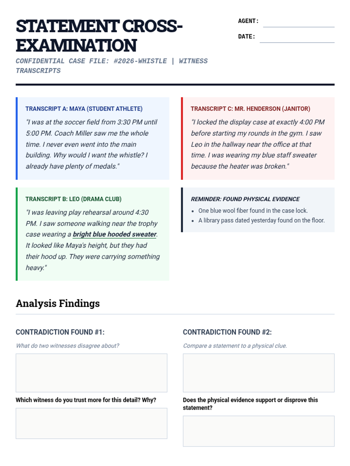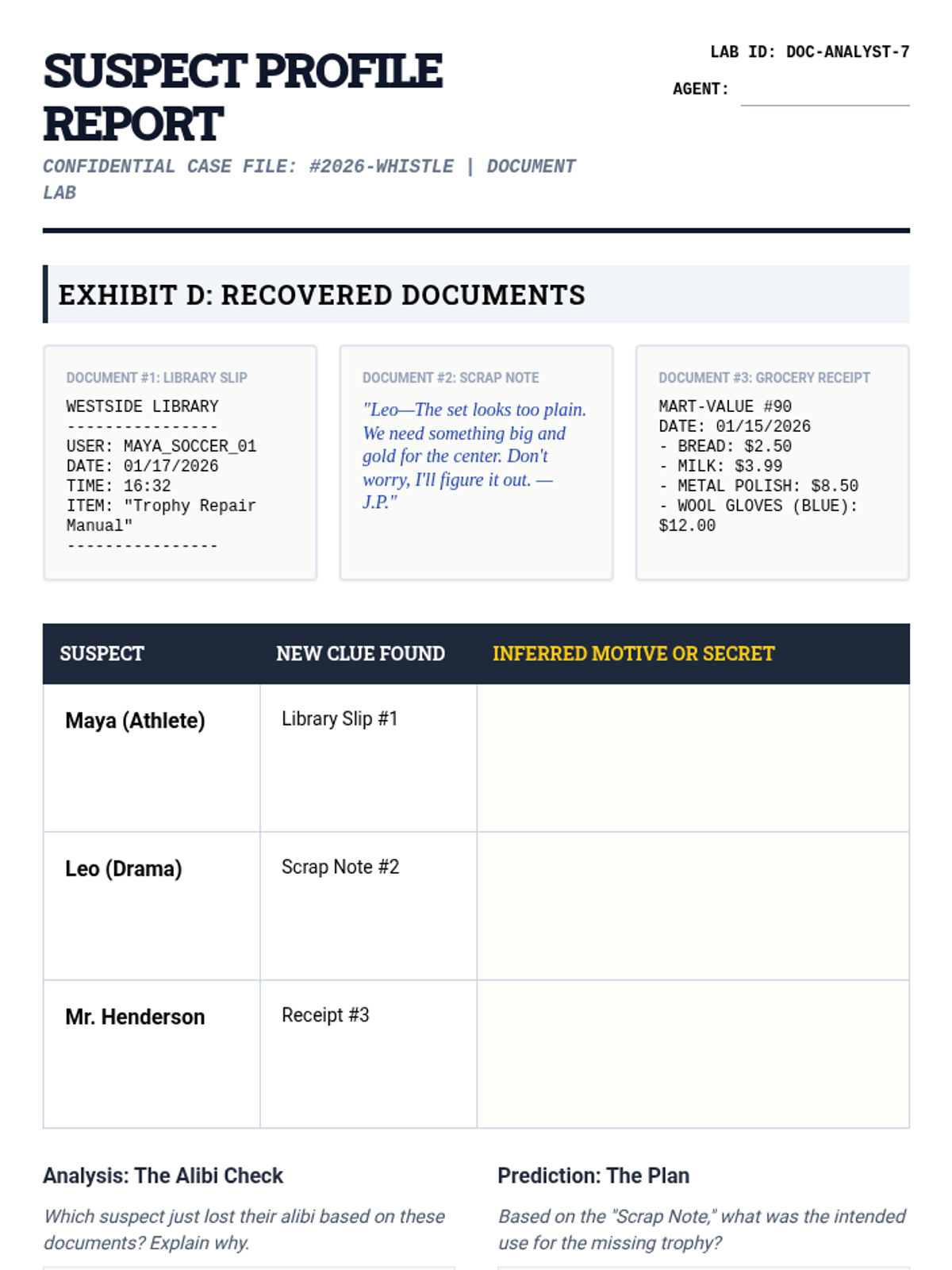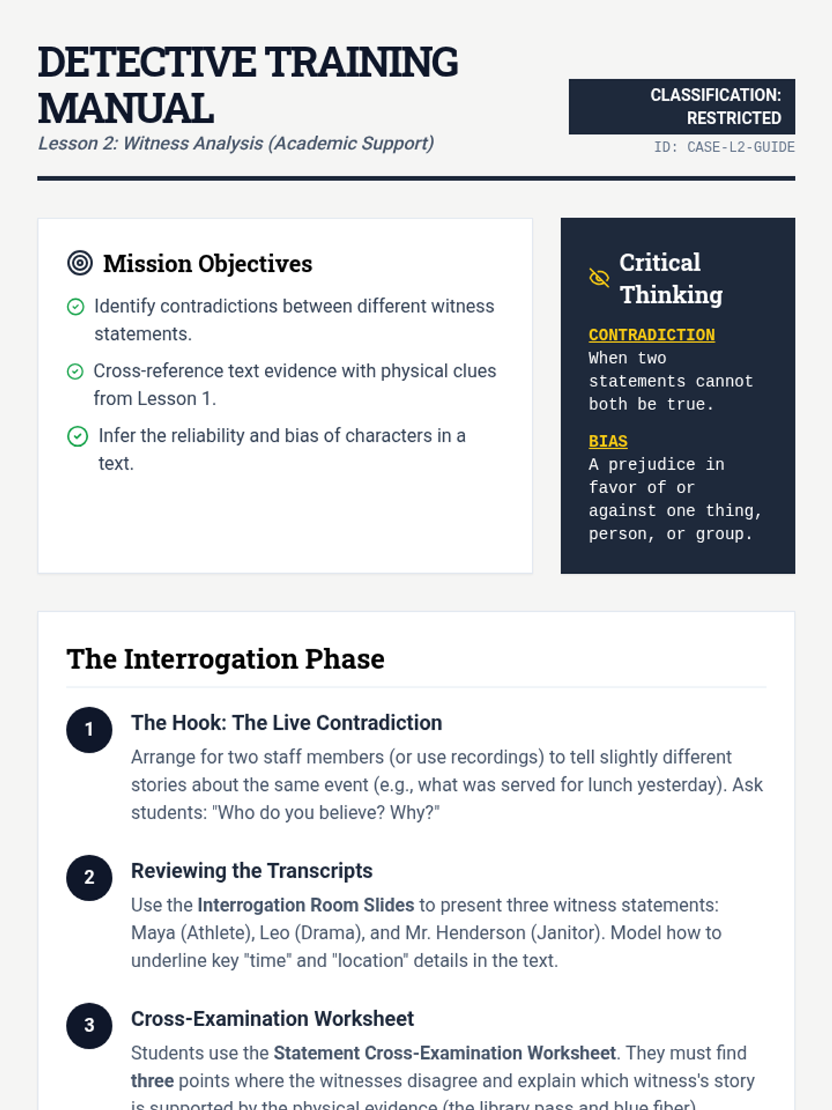 An immersive, gamified mystery sequence where 6th-grade students act as detectives to master predictions and inferences. By analyzing physical clues, witness statements, and found documents, students apply deductive reasoning to solve the 'Case of the Missing Golden Whistle.'