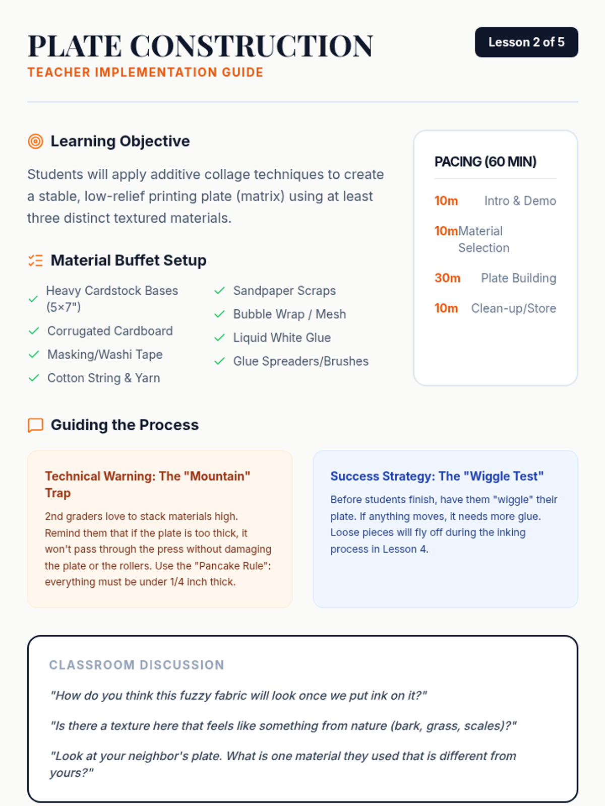 A 5-lesson sequence for 2nd graders exploring tactile textures through frottage, collagraphy, and monoprinting. Students investigate classroom textures, build printing plates from found materials, and experiment with ink transfer techniques.