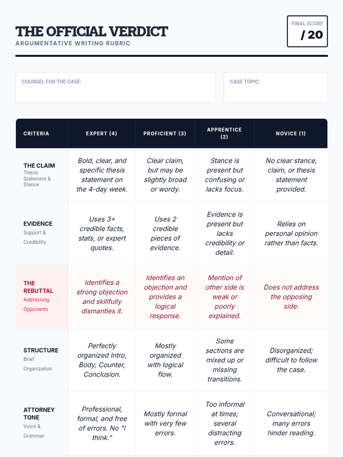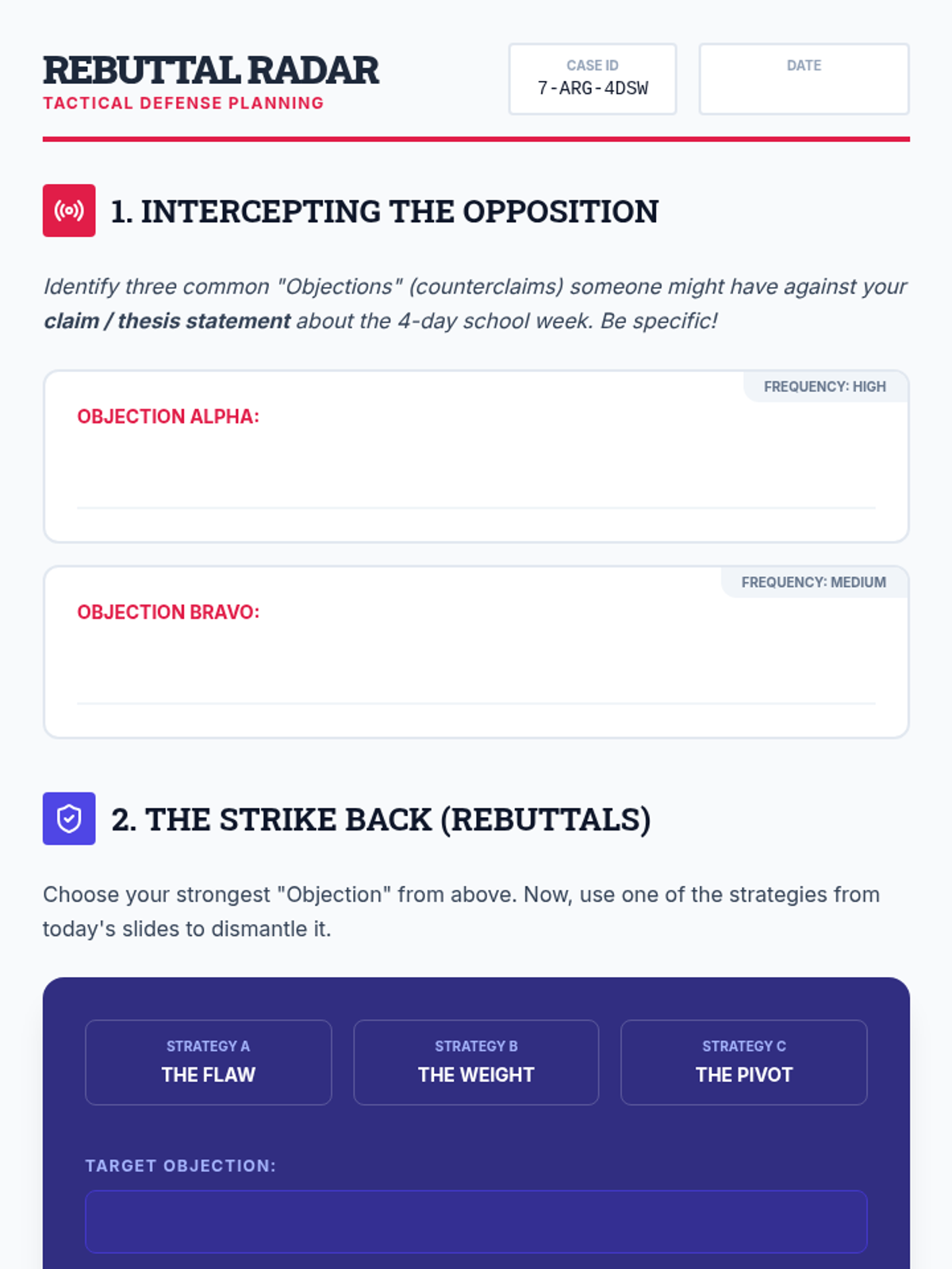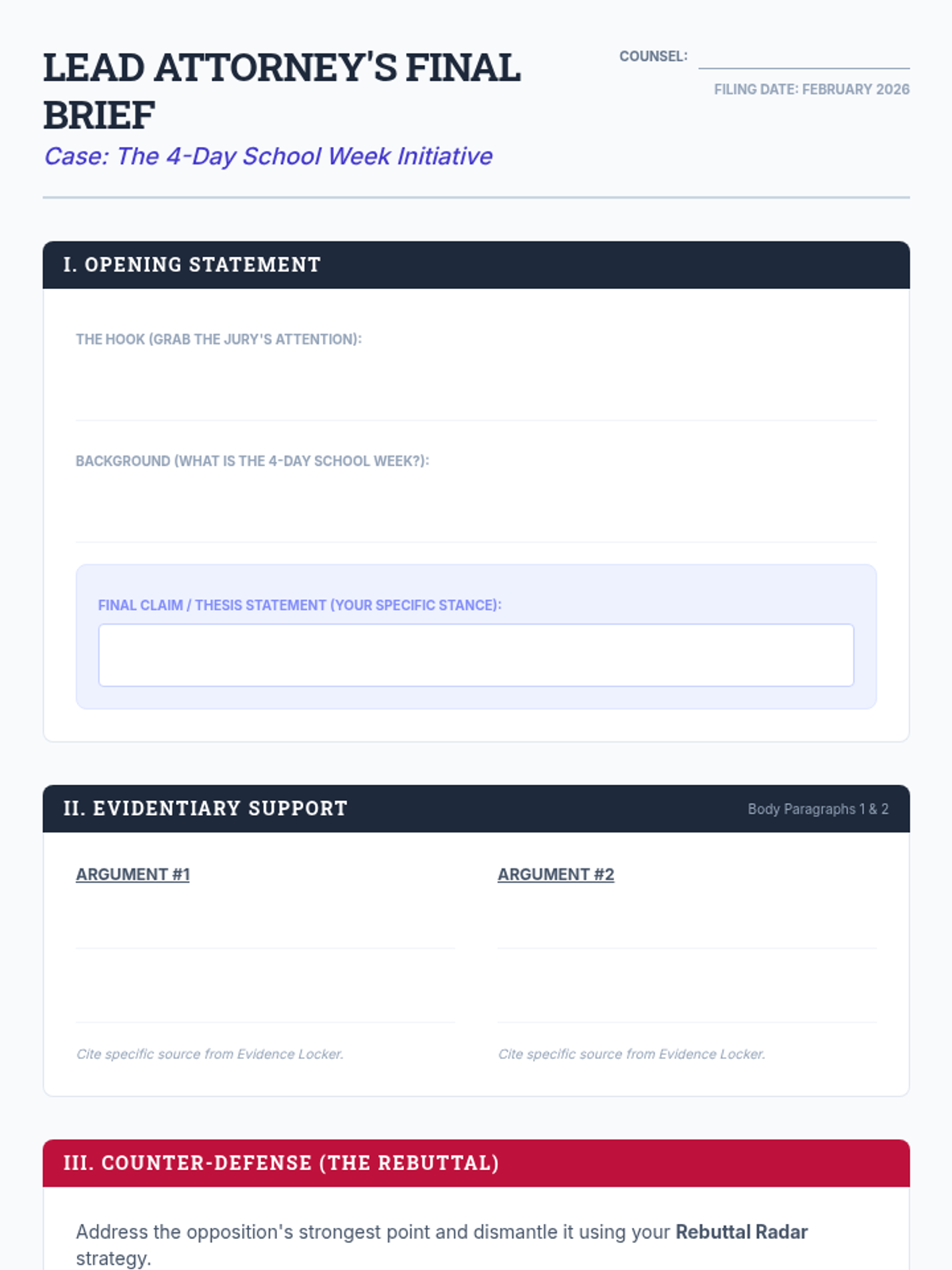 A week-long argumentative writing unit for 7th graders focused on the controversial topic of the 4-day school week. Students act as 'Arguments Attorneys' to research, build claims, and master the art of the rebuttal.