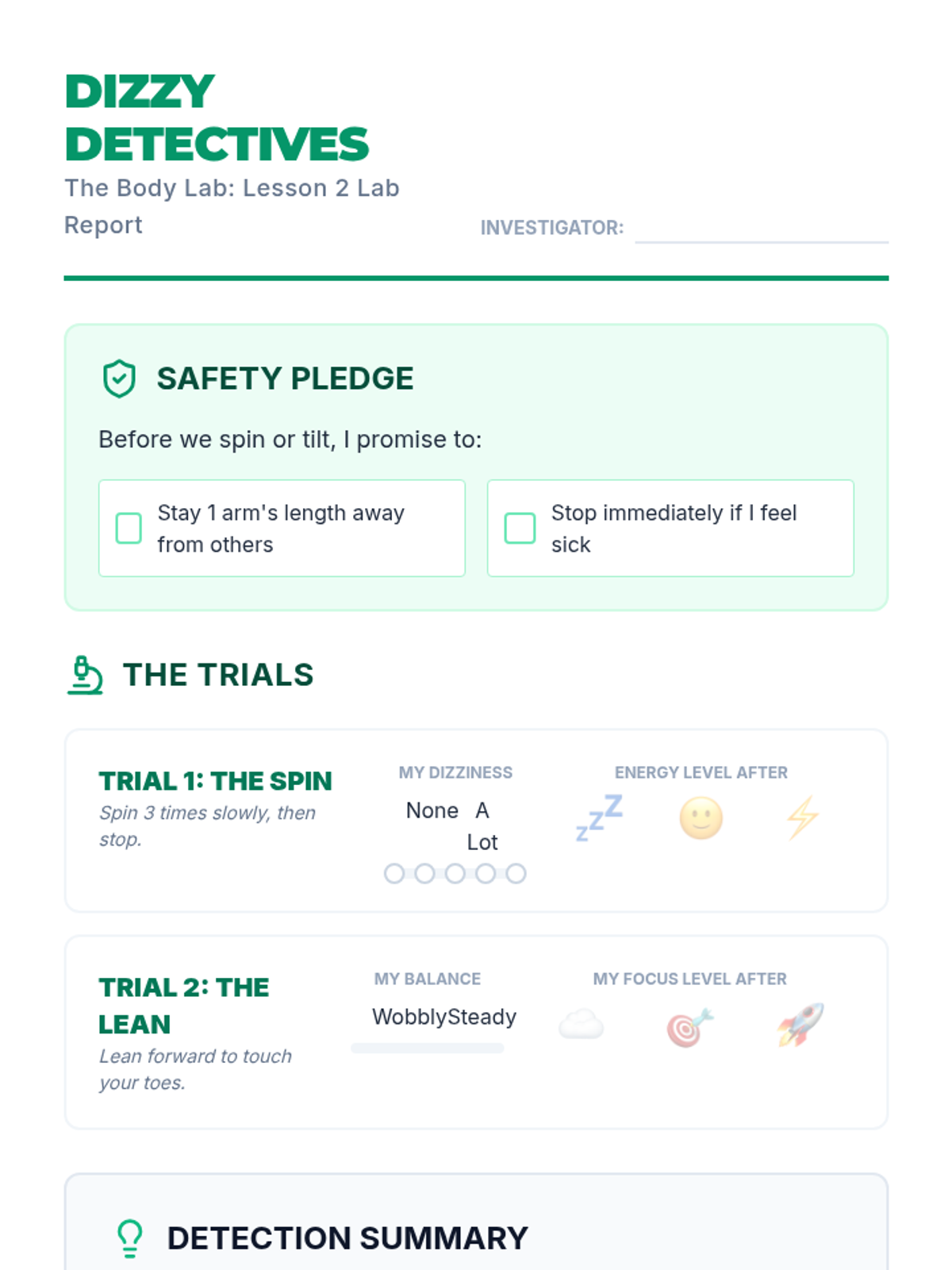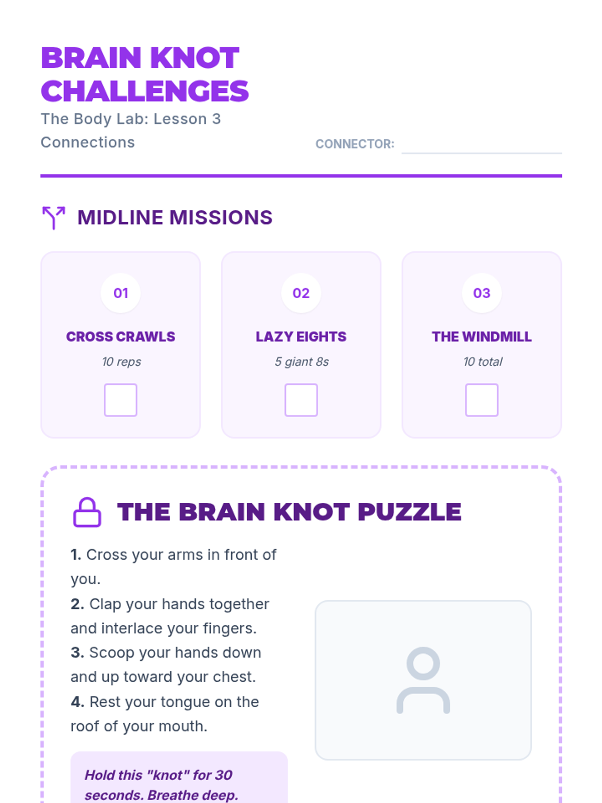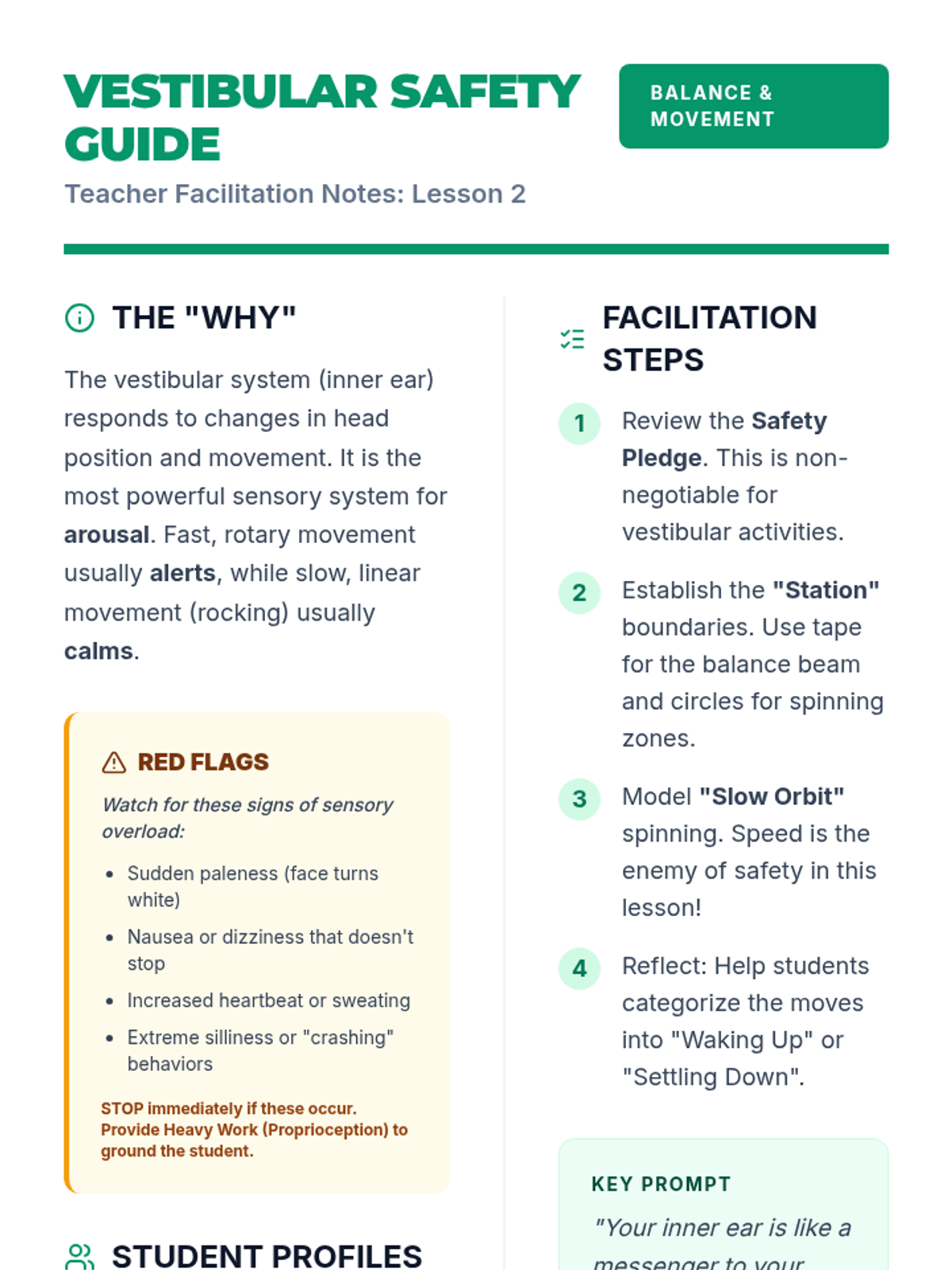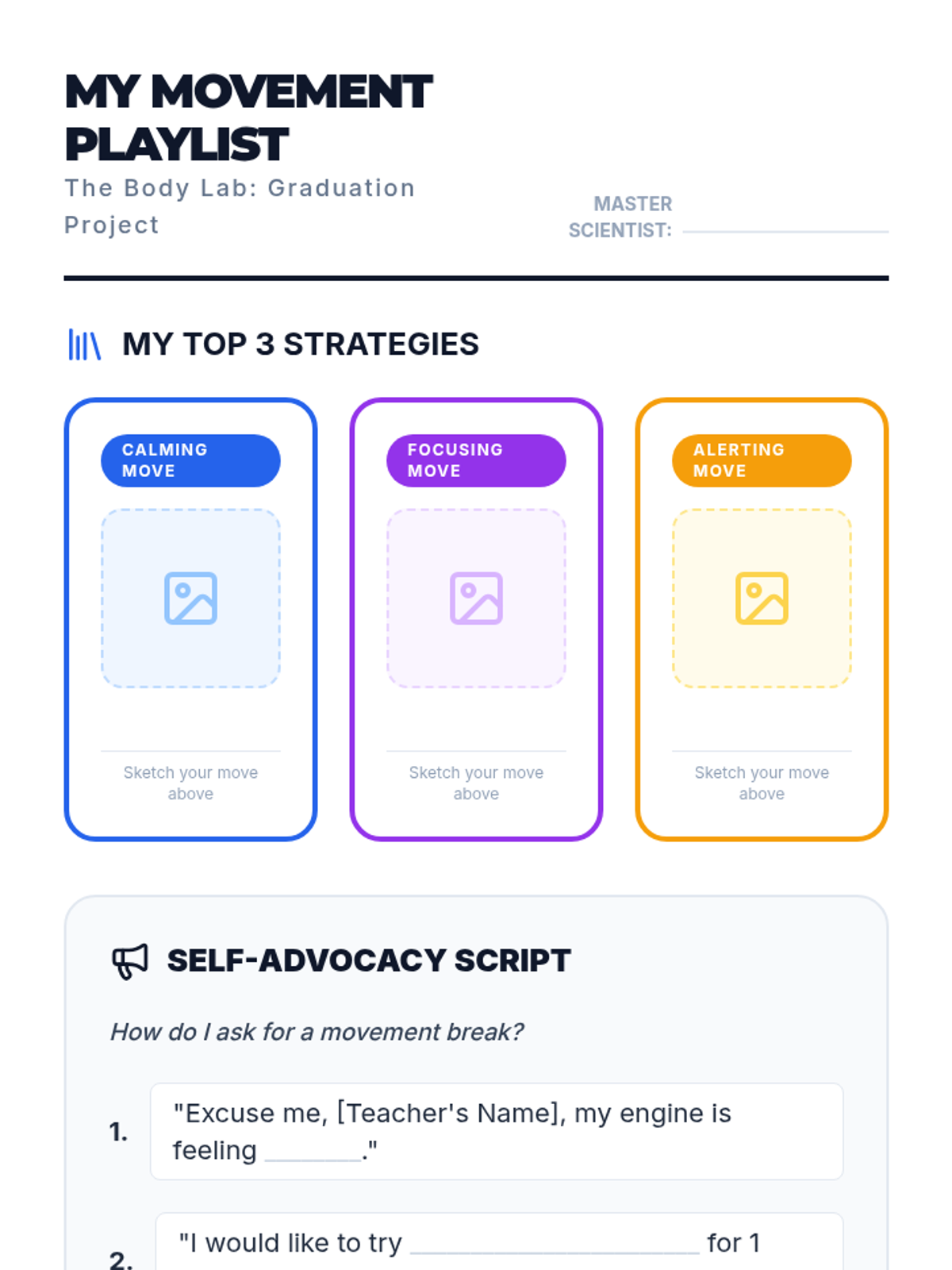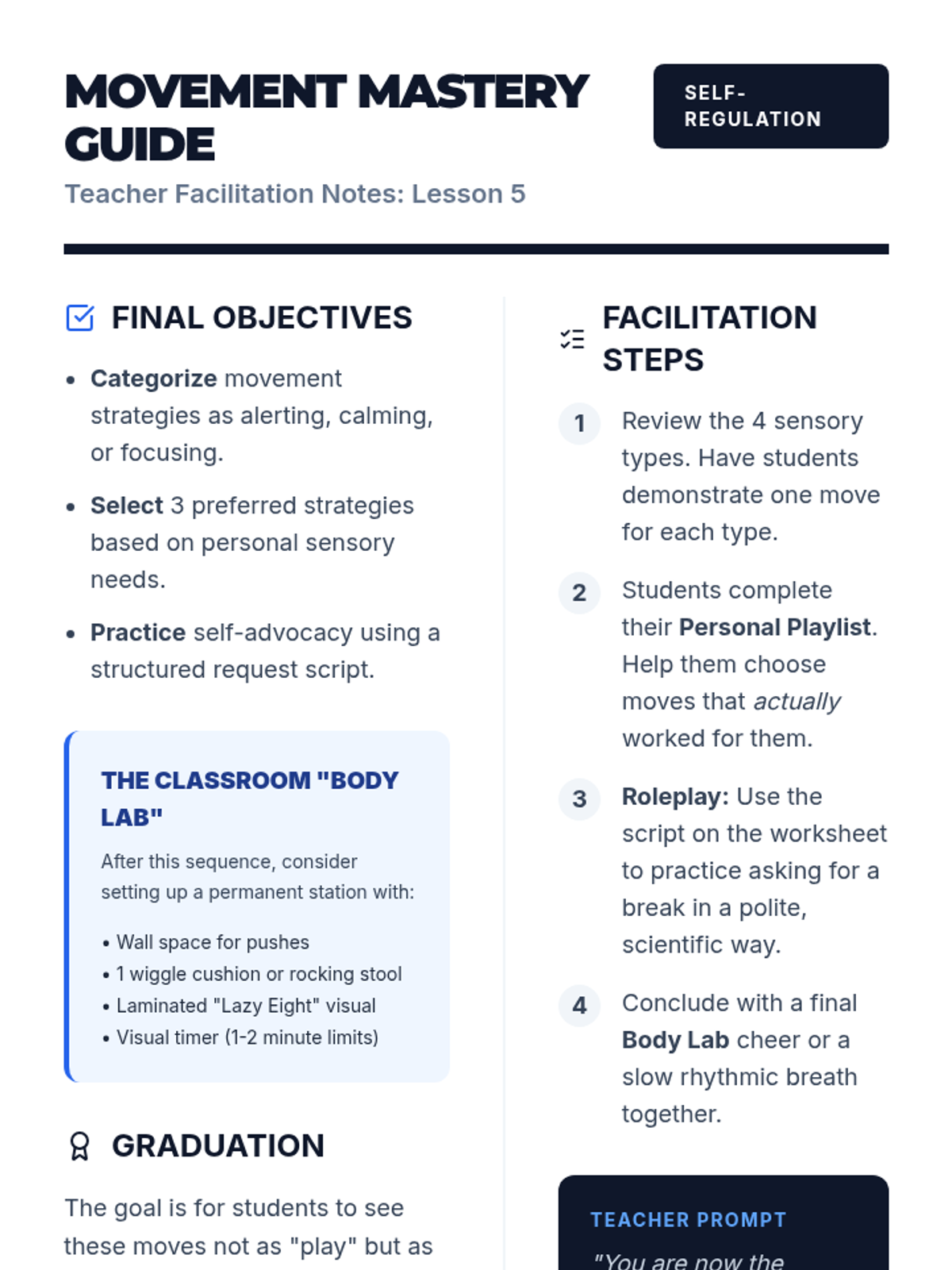 A comprehensive 4th-grade sequence on sensory processing and movement break utilization. Students explore proprioceptive, vestibular, and midline-crossing movements to learn how to self-regulate their energy and focus.