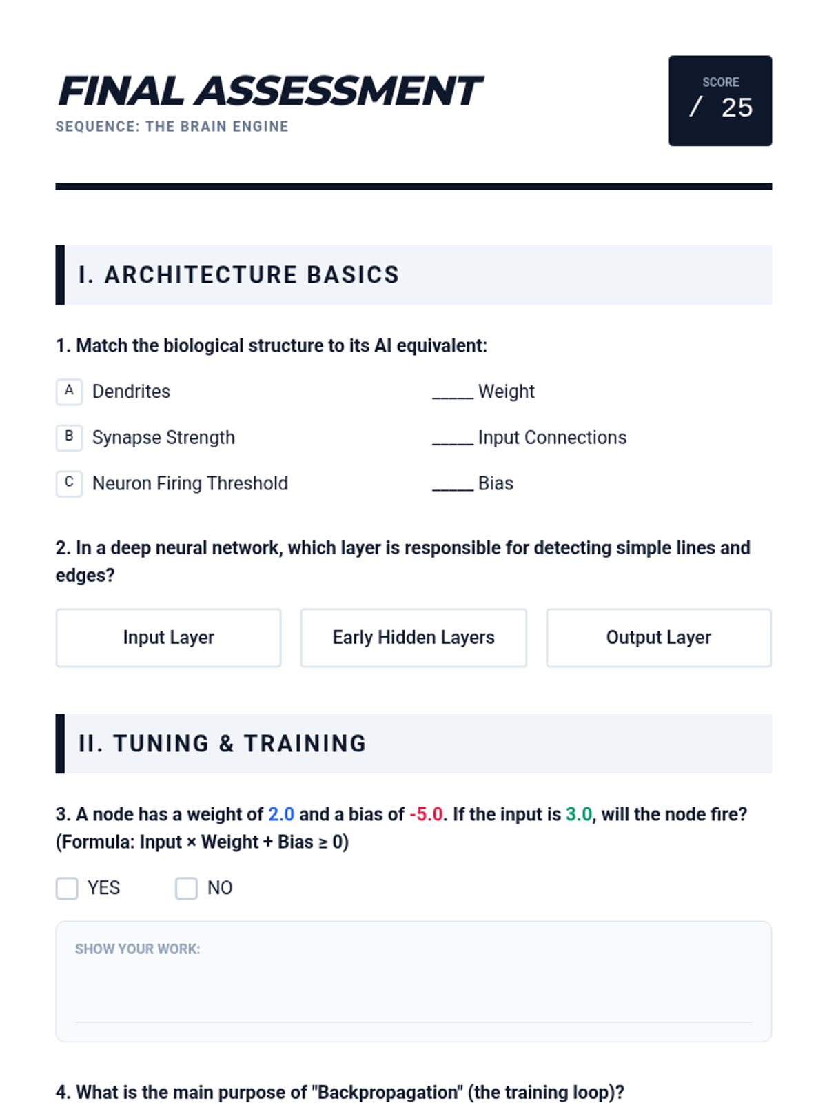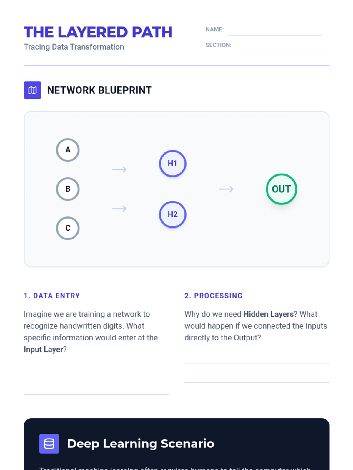 This sequence demystifies Neural Networks and Deep Learning by bridging biological concepts with artificial intelligence. Students explore how the brain's structure inspires machine learning through interactive models, architectural analysis, and hands-on training simulations.