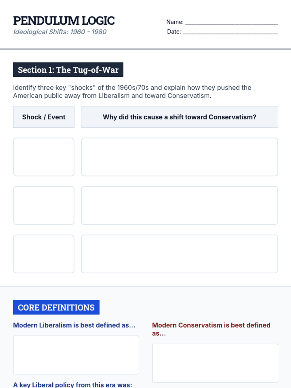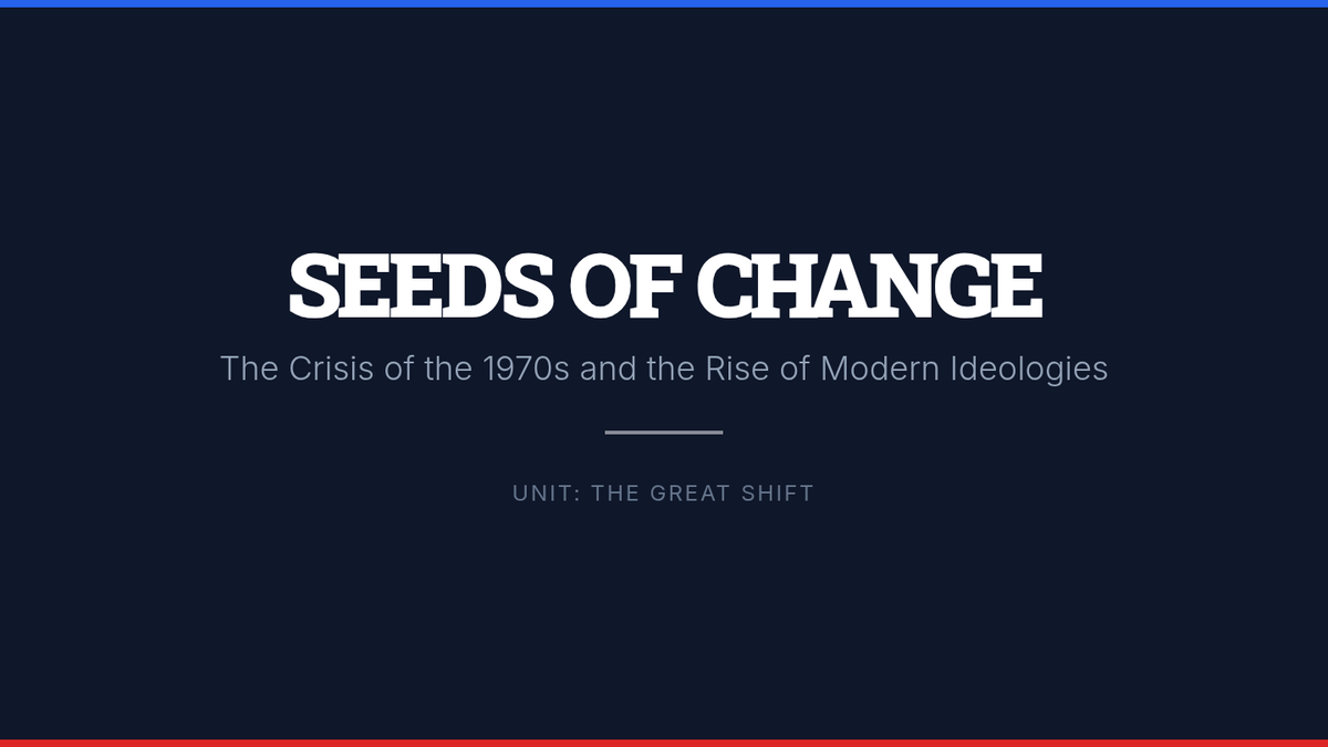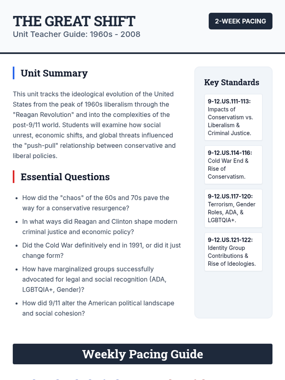 A comprehensive 2-week unit exploring the ideological shifts between conservatism and liberalism from the 1960s to the 2000s. Students analyze the Reagan and Clinton eras, the end of the Cold War, social rights movements, and the impact of 9/11 on American society.