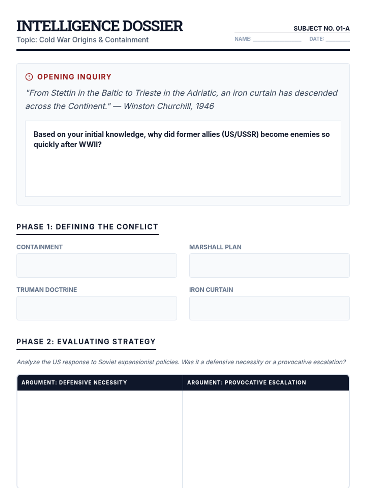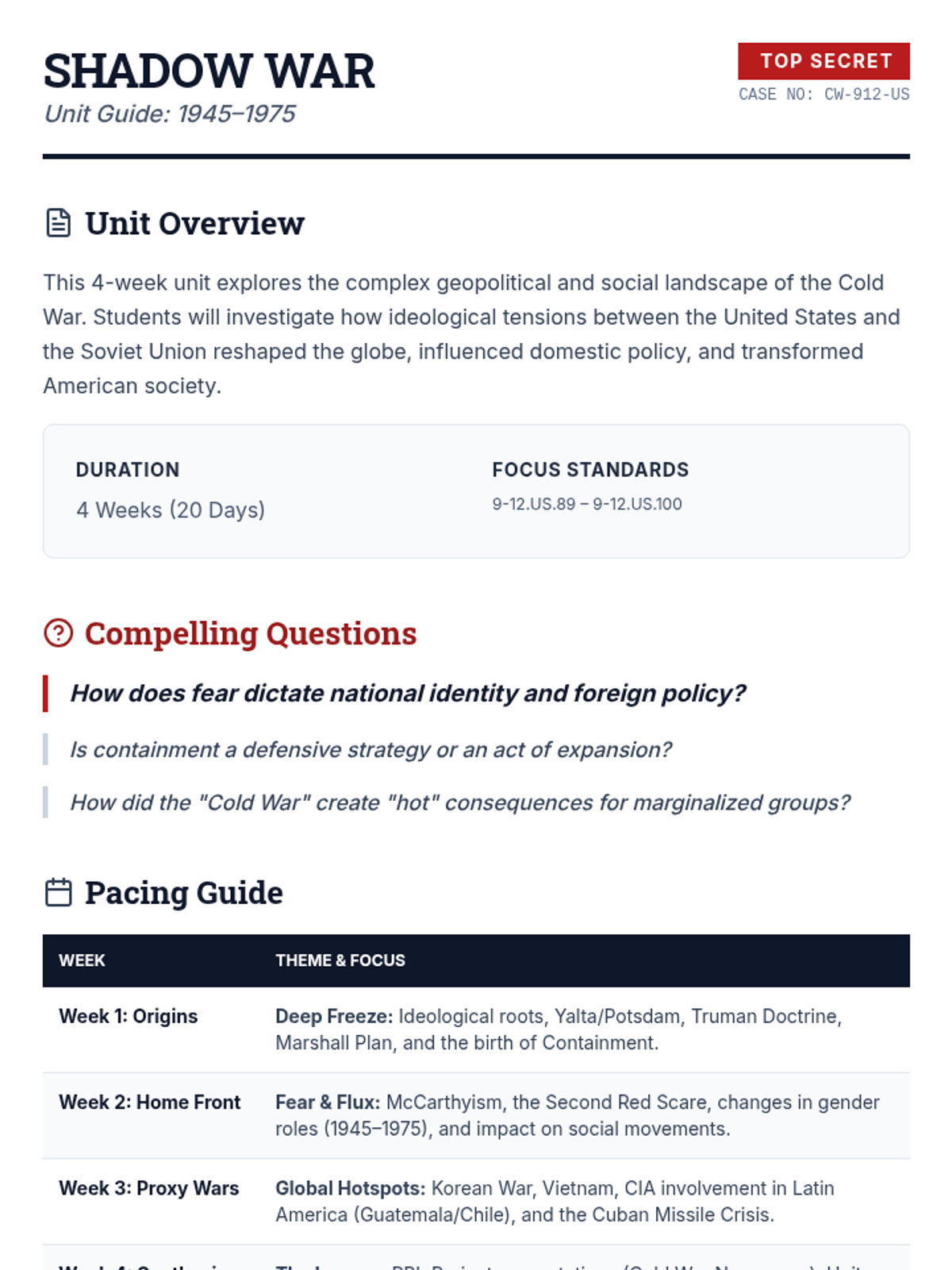 An immersive unit on the Cold War, styled as a series of declassified intelligence briefings exploring the global struggle for power between 1945 and 1991.