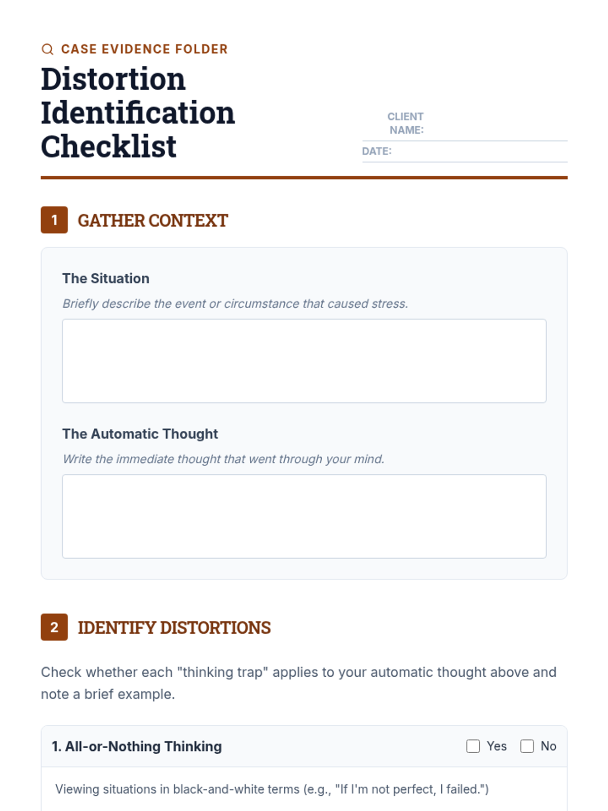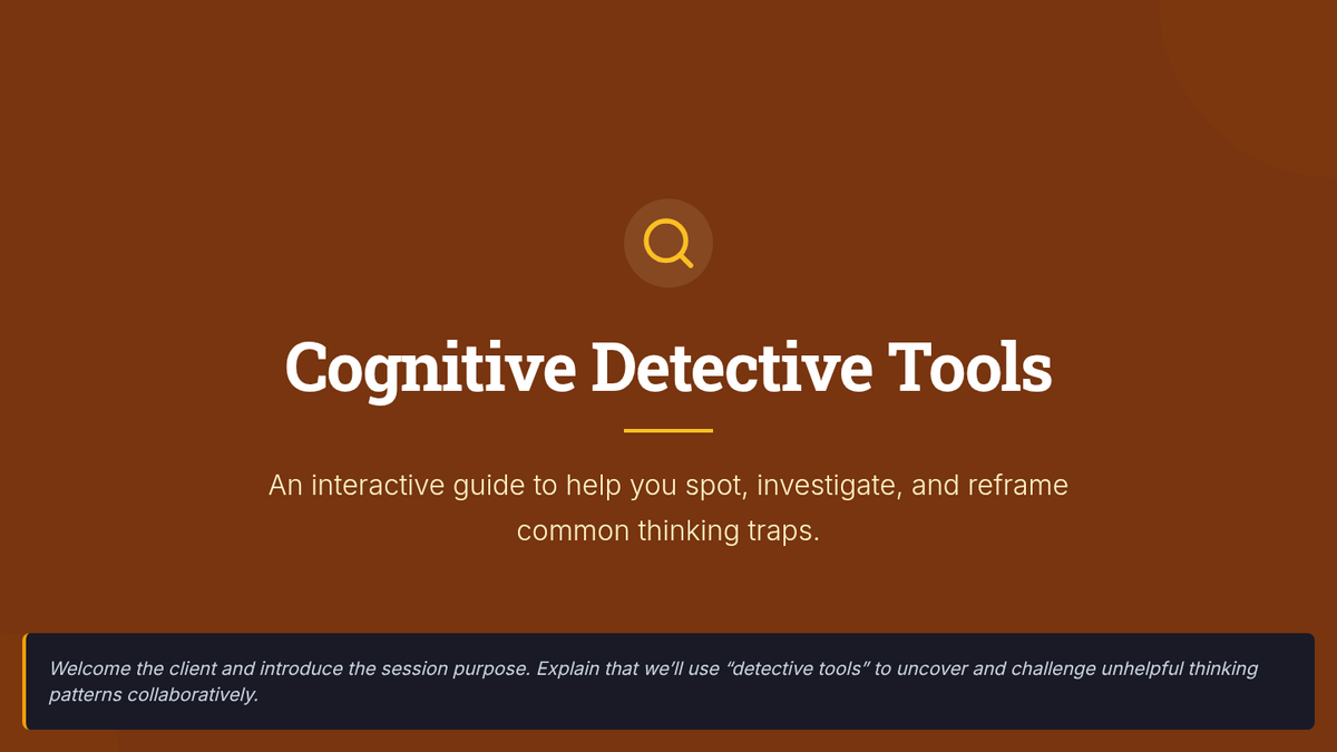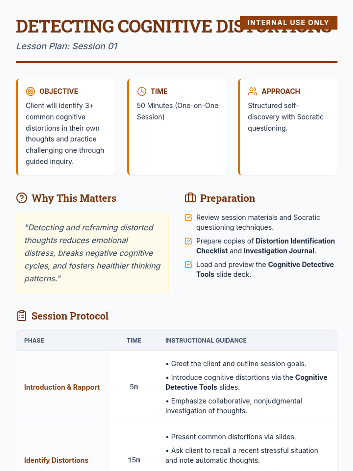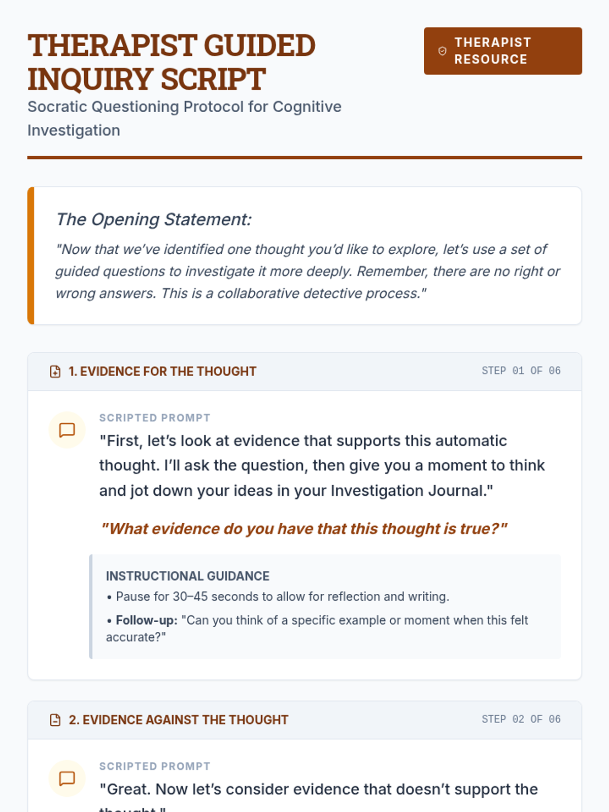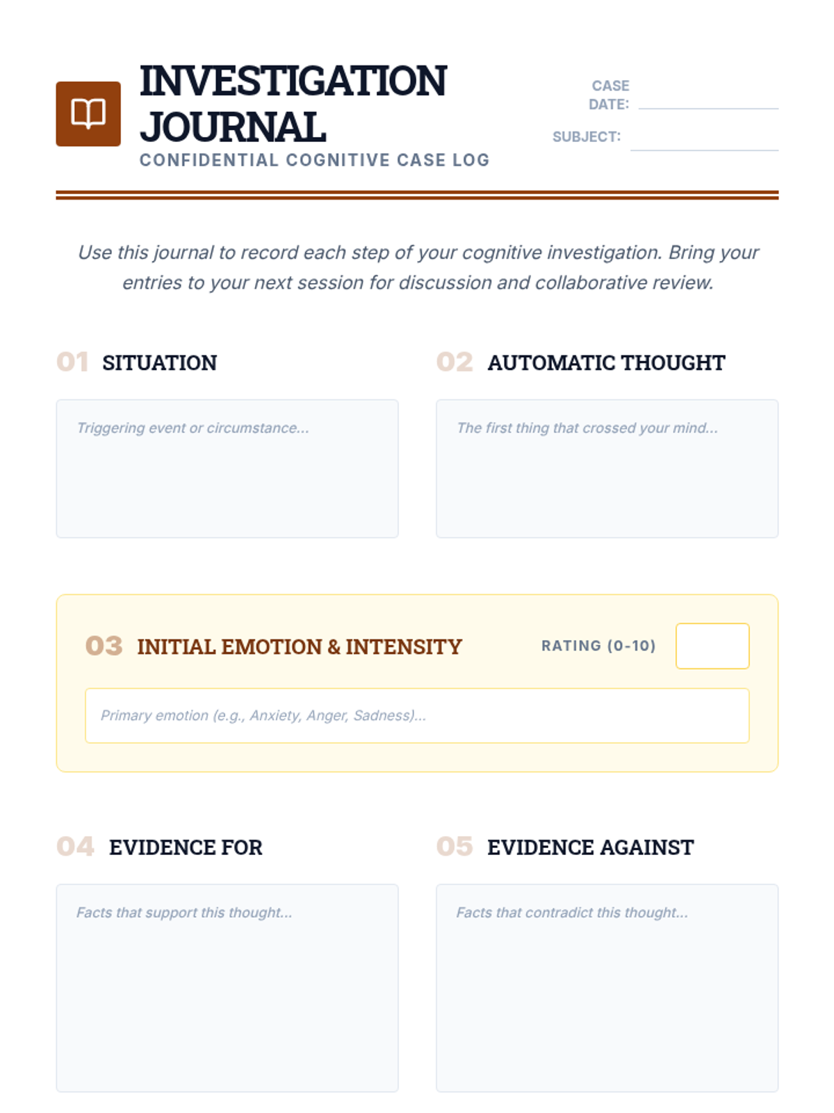 An individualized CBT resource that empowers adult clients to investigate and challenge distorted thinking through guided self-discovery exercises. This Tier 3 program provides structured materials for deep cognitive inquiry.