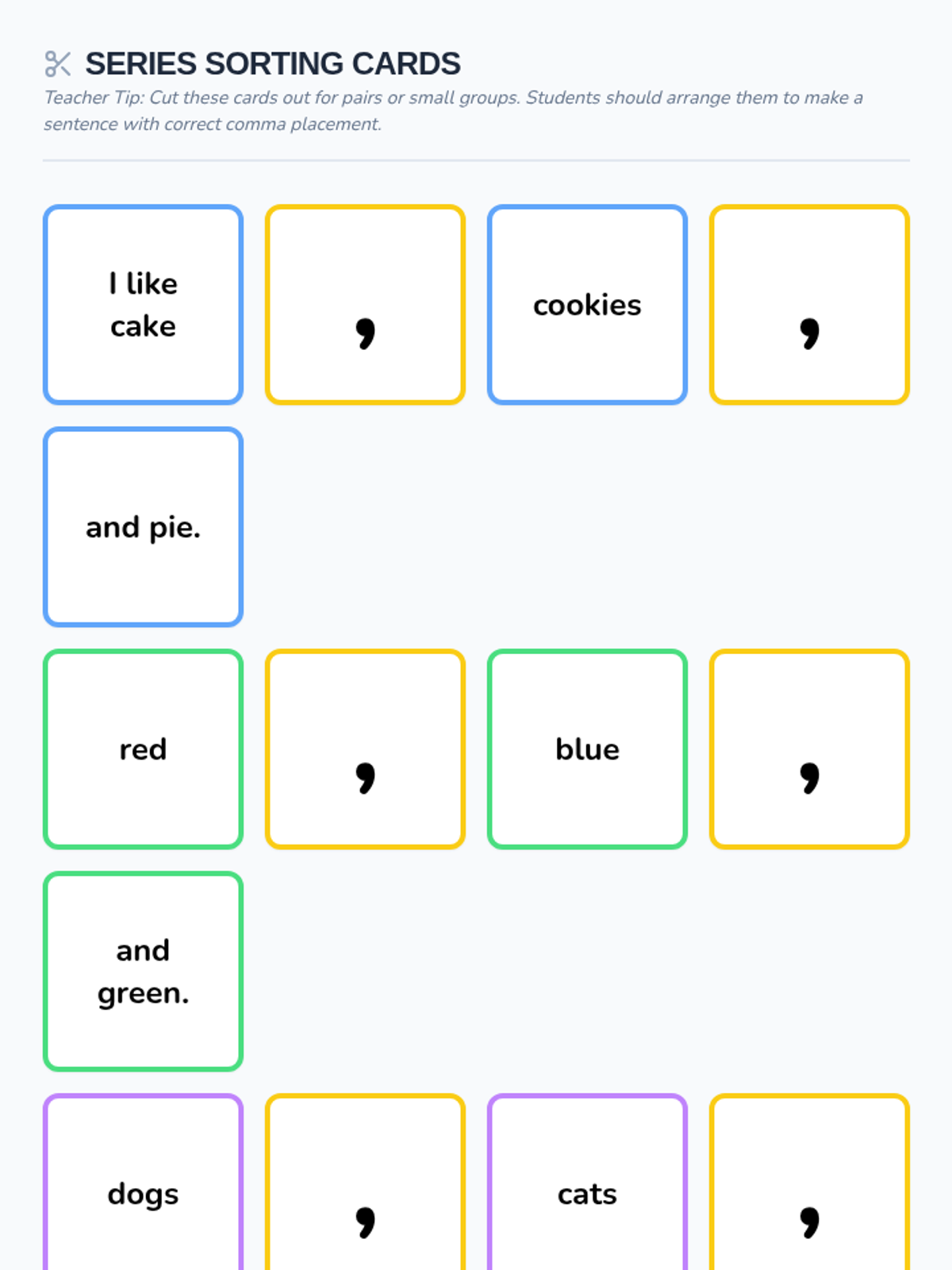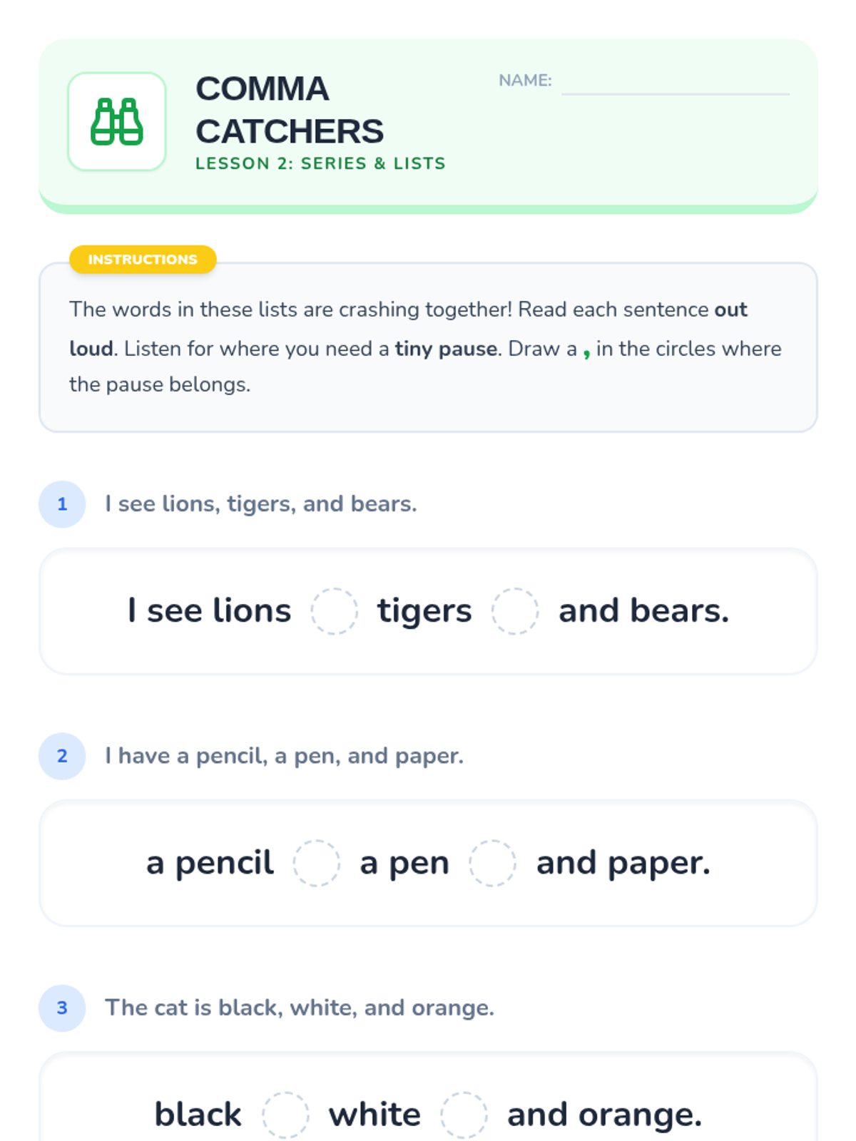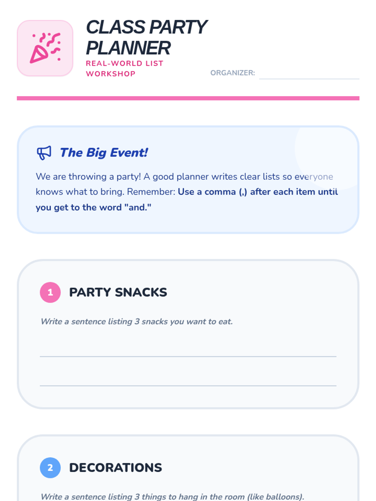 A 1st Grade sequence focused on using commas to separate days from years in dates and items in a series of three or more. Students use a writer's workshop model to observe, practice, and apply comma rules in functional and creative writing tasks.