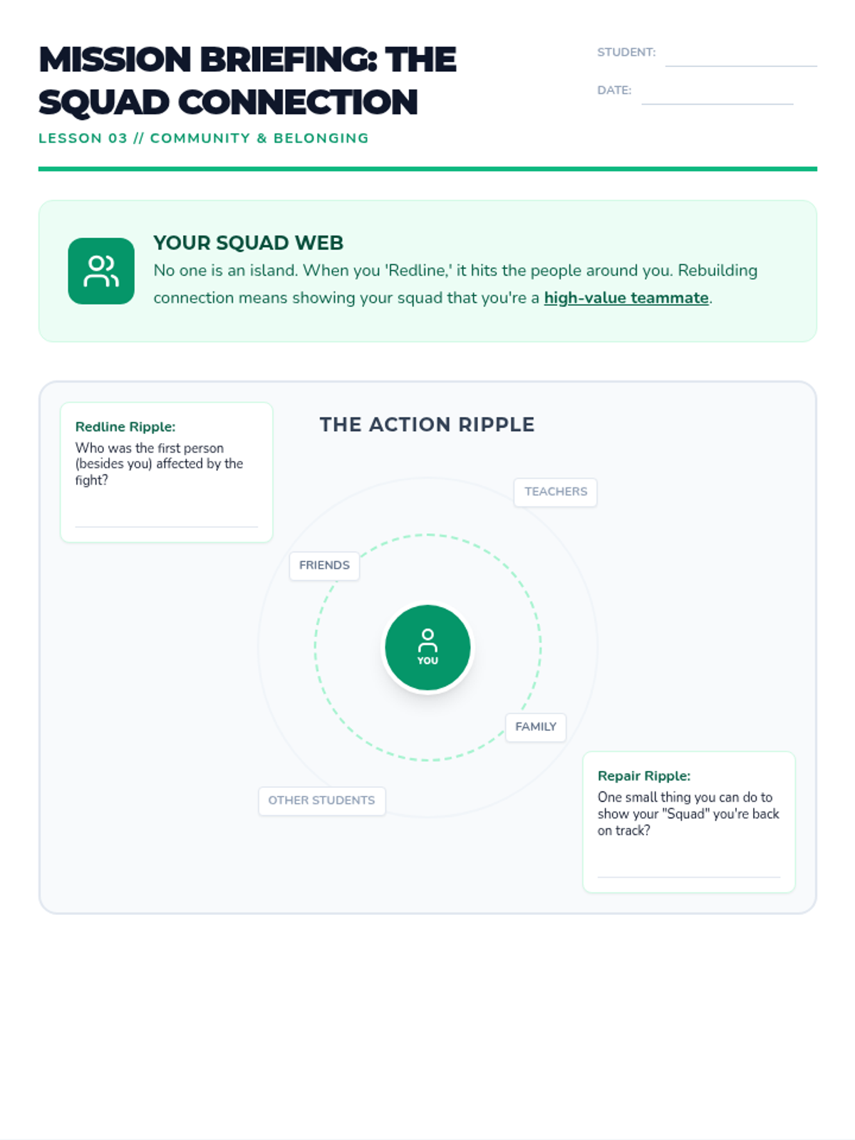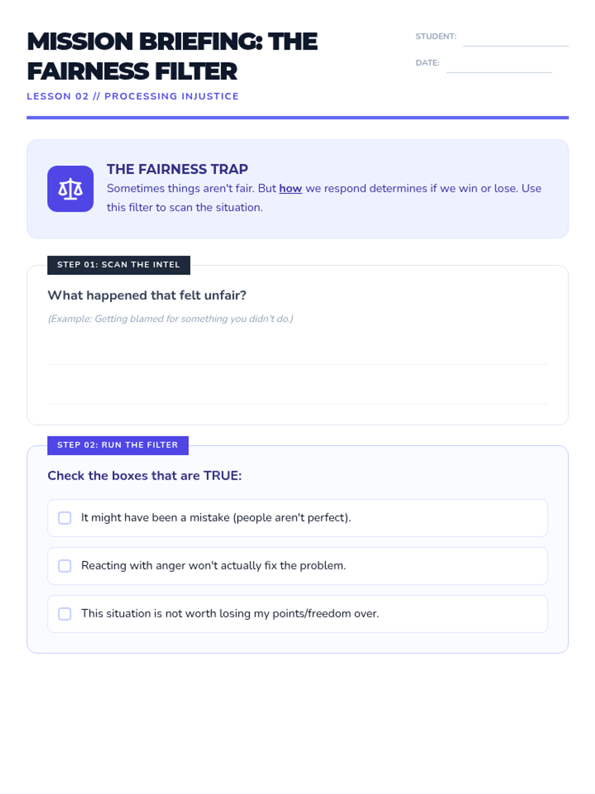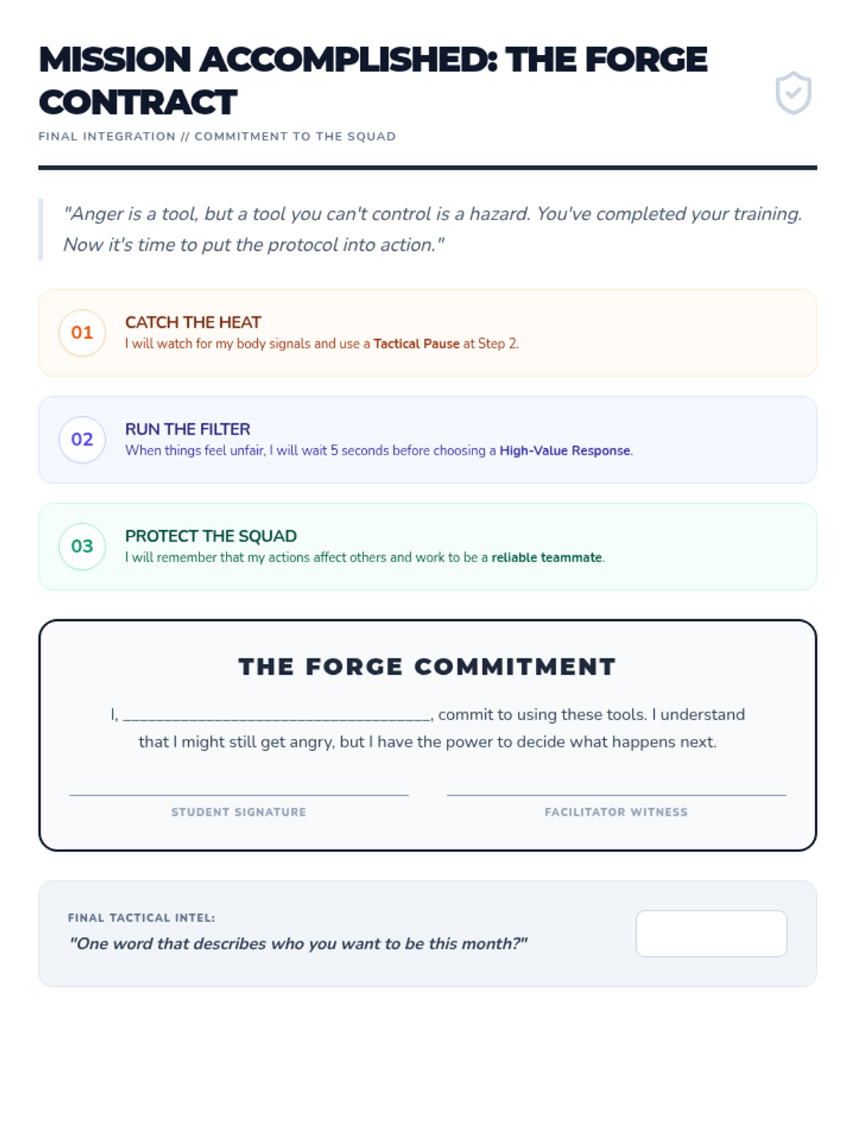 A comprehensive individual anger management curriculum for middle school students, focusing on tactical strategies for managing triggers, navigating feelings of injustice, and rebuilding community connections. The curriculum uses a 'Mission Briefing' aesthetic to engage students through visual mapping and low-writing, conversational activities.