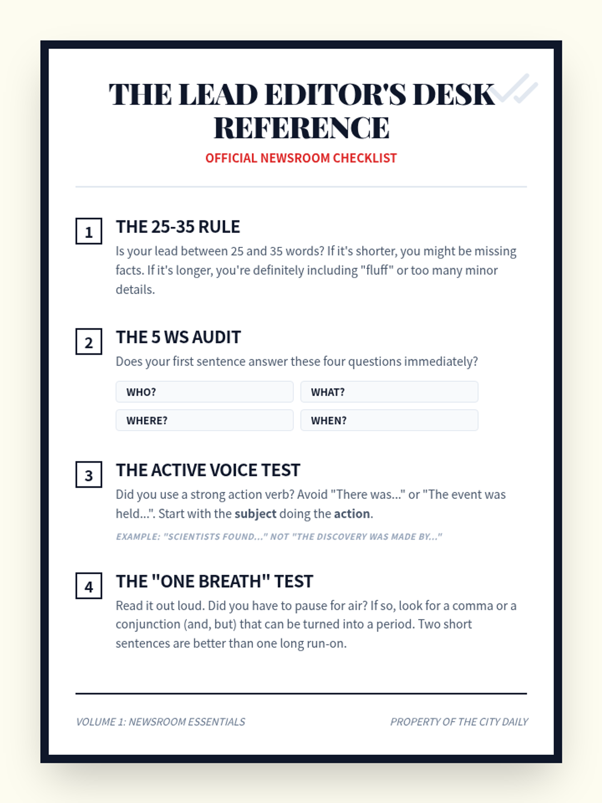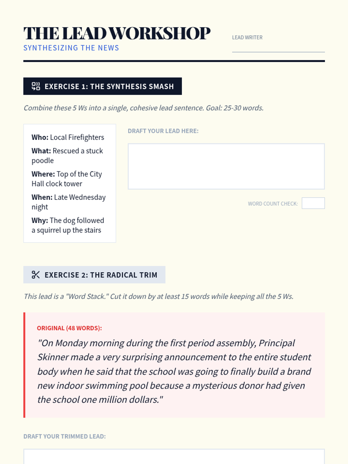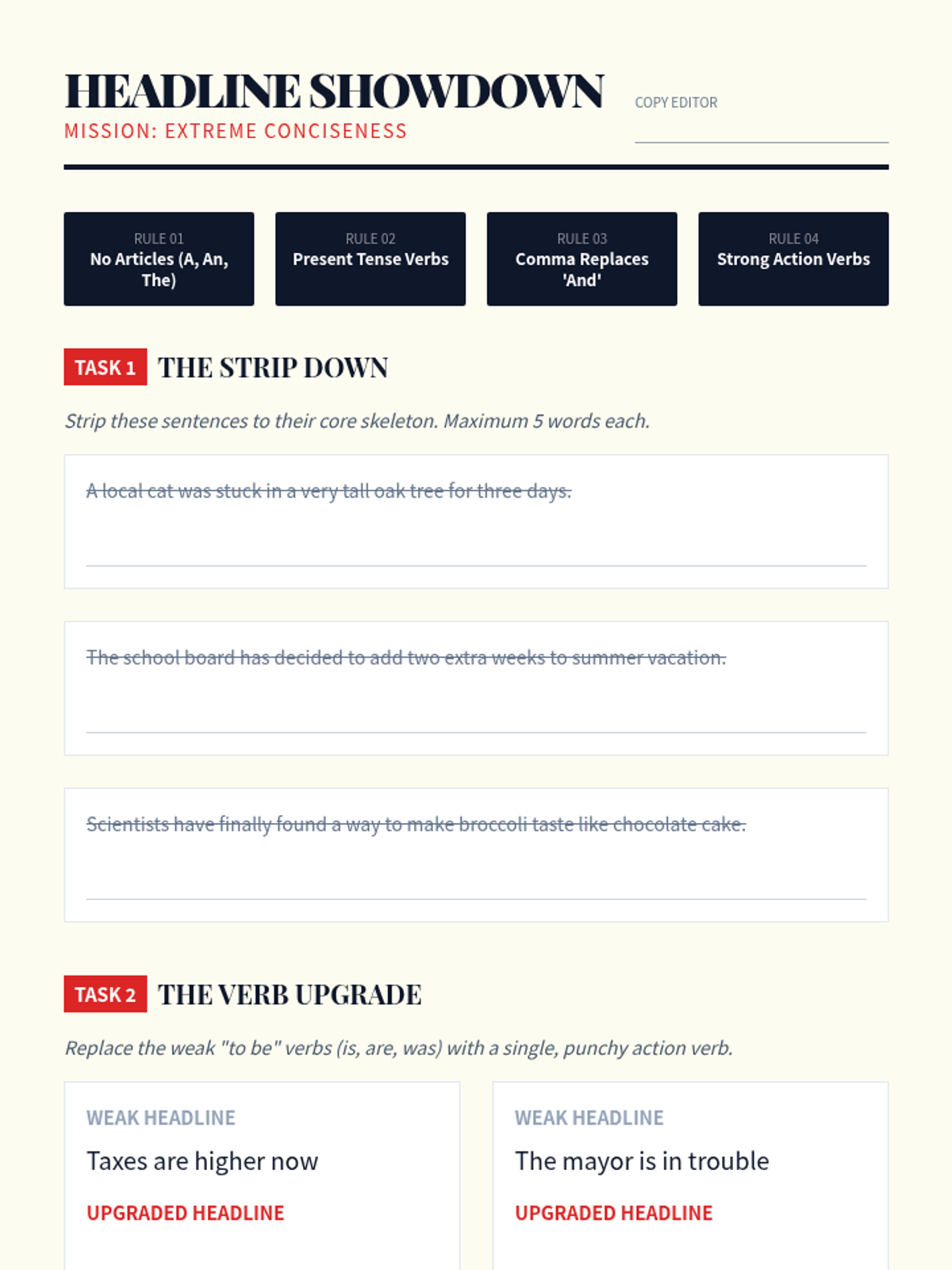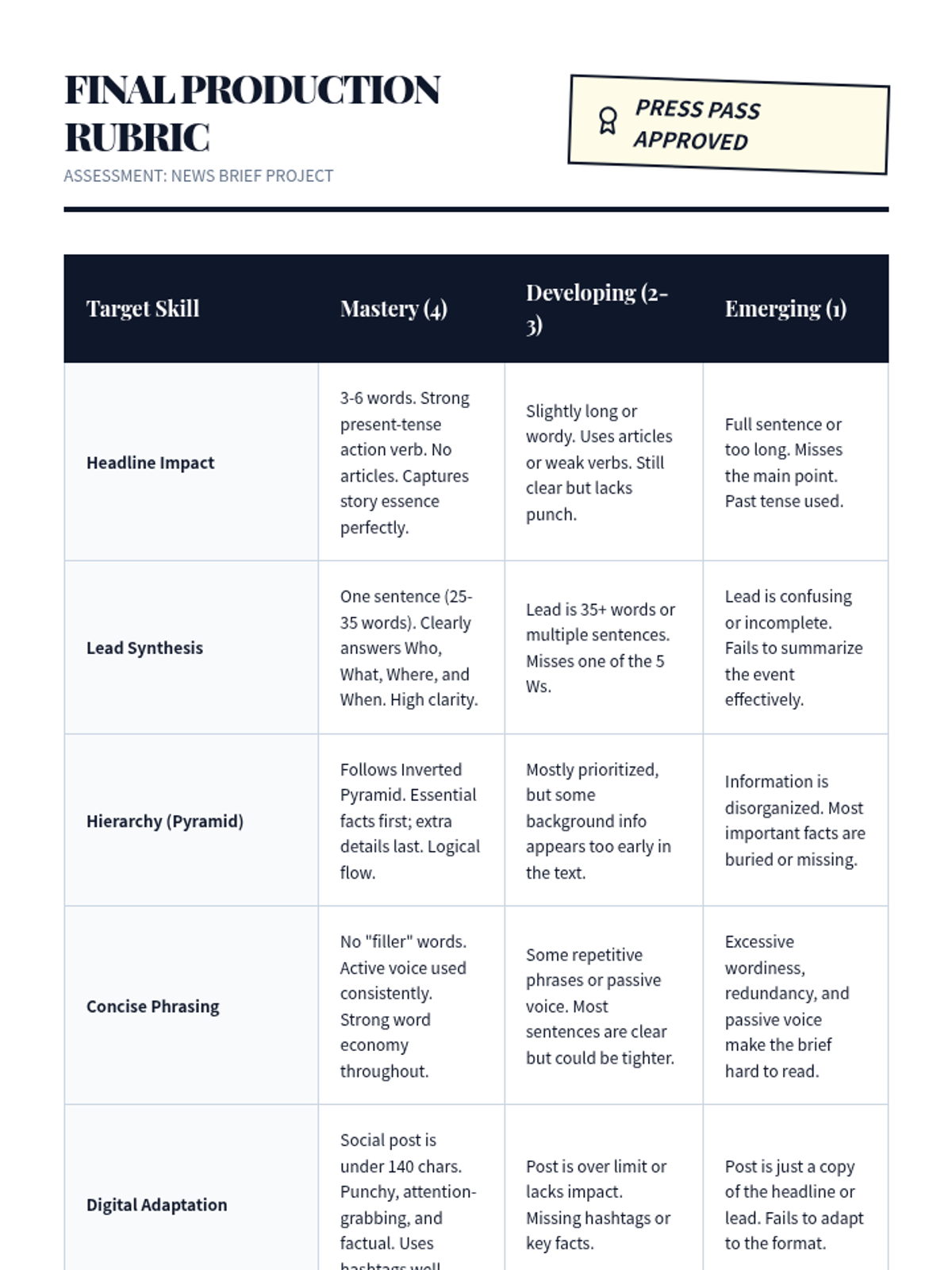A newsroom-themed sequence where 7th-grade students master the art of writing clearly and concisely through journalistic techniques like the inverted pyramid, headline writing, and lead paragraph construction.