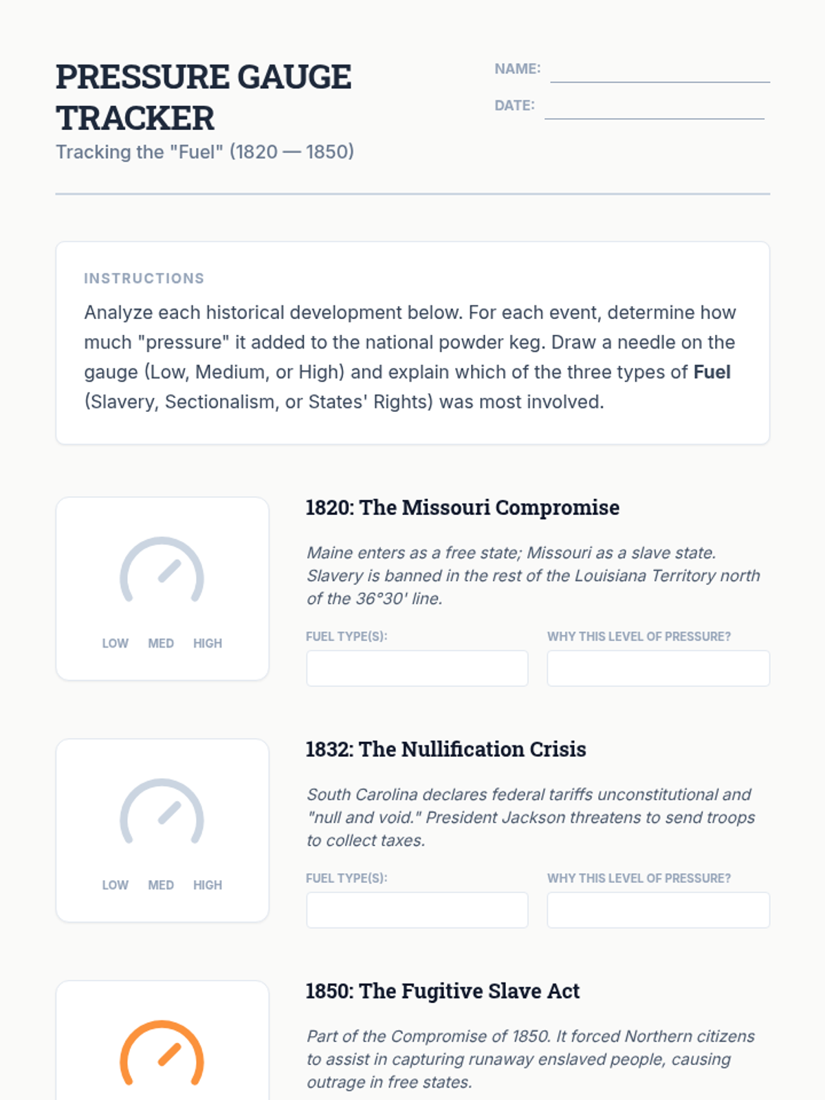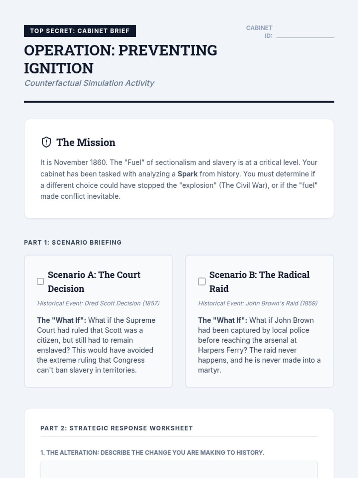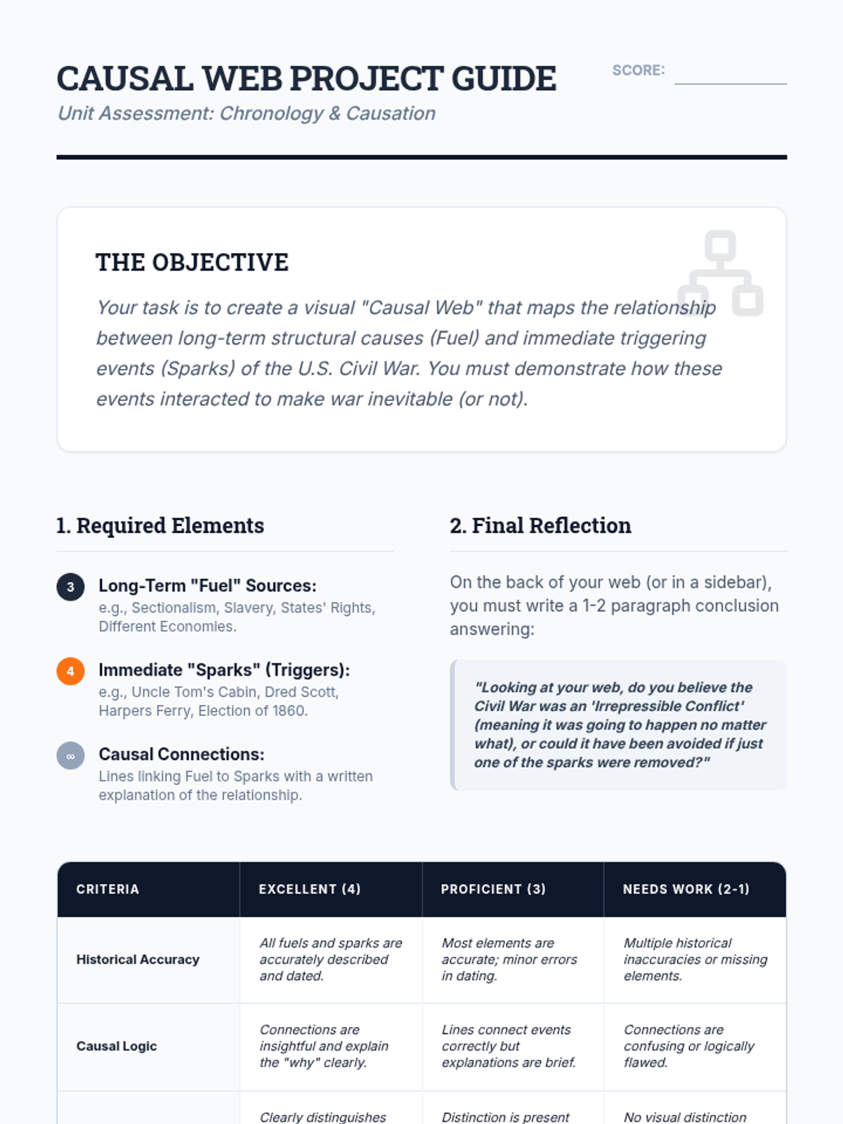 A 5-lesson unit for 8th Grade Social Studies focusing on historical chronology and causation. Students use the 'Powder Keg' analogy to distinguish between long-term structural causes (fuel) and immediate triggering events (sparks) leading up to the U.S. Civil War.