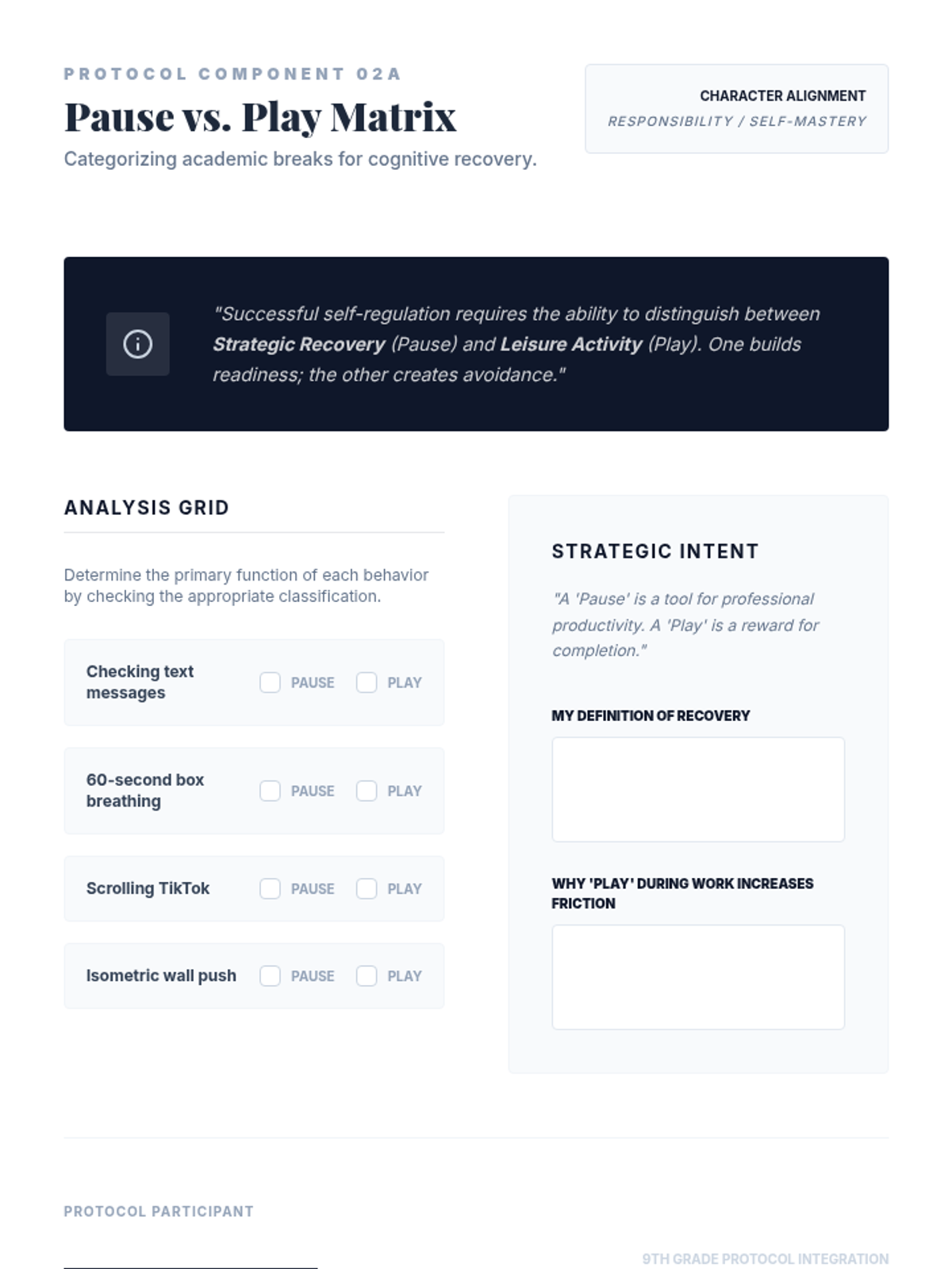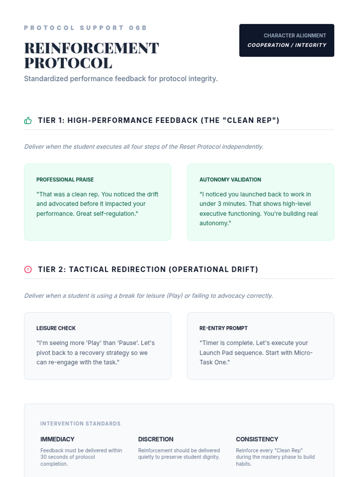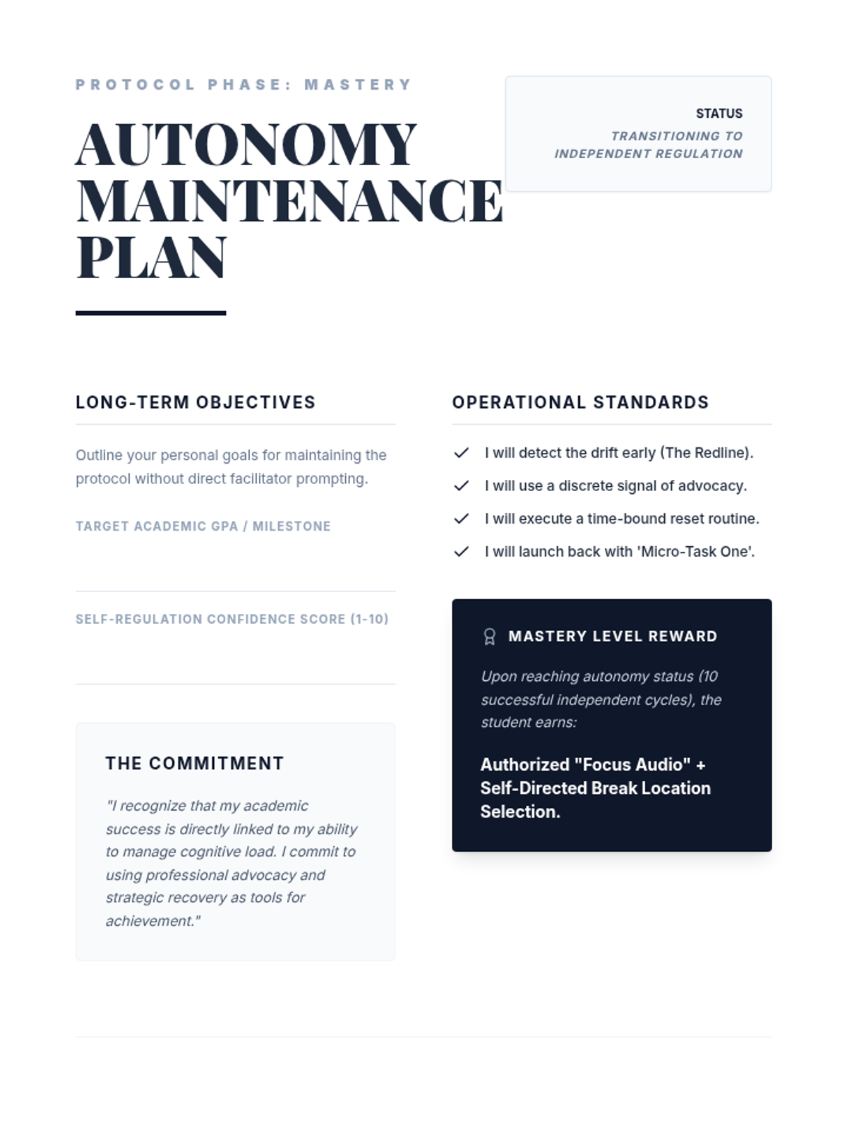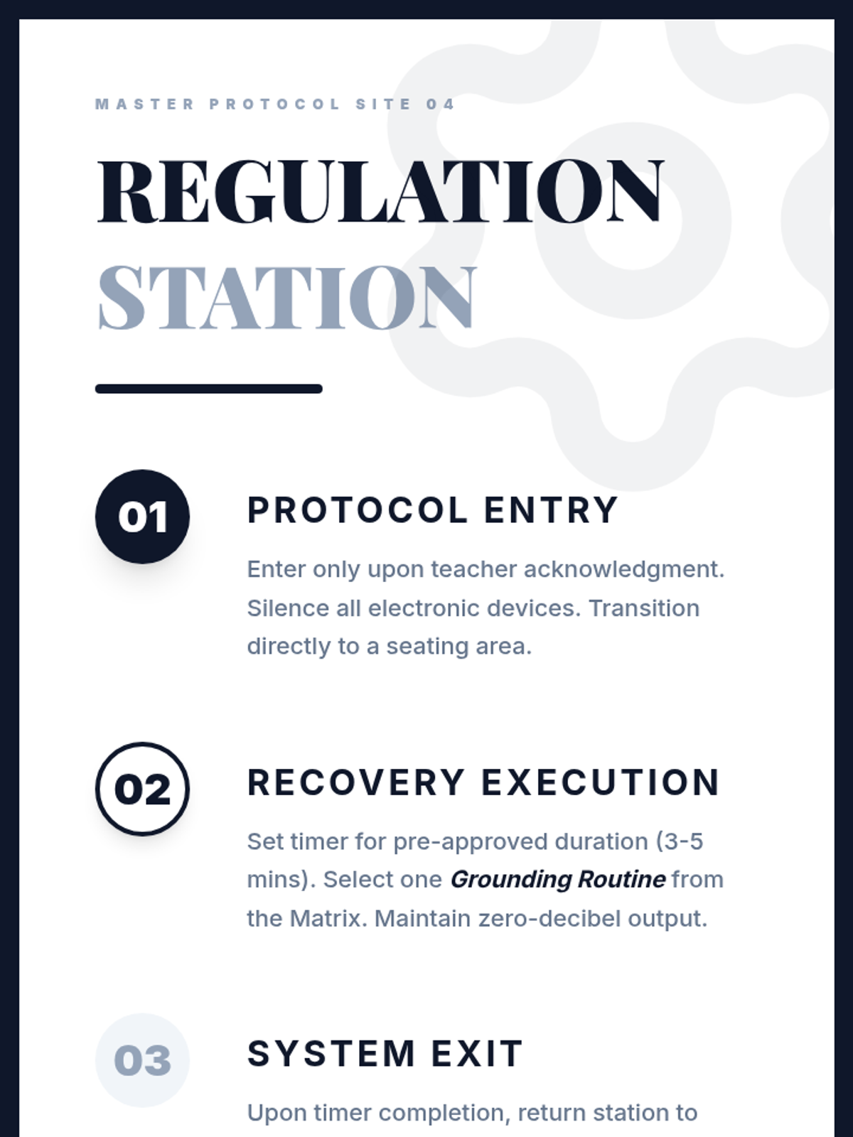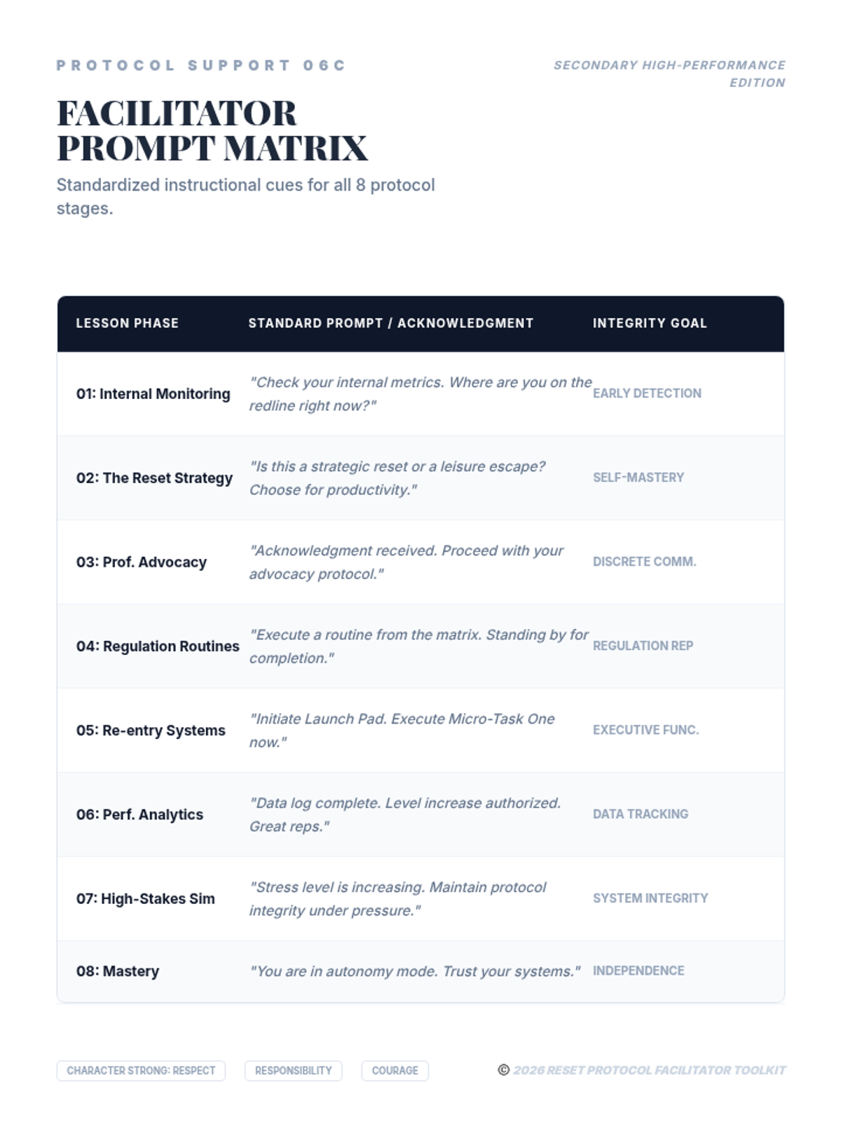 A sophisticated 8-lesson intervention designed for high school students to transition from defiant avoidance to self-regulated resets through professional advocacy and executive functioning strategies.
