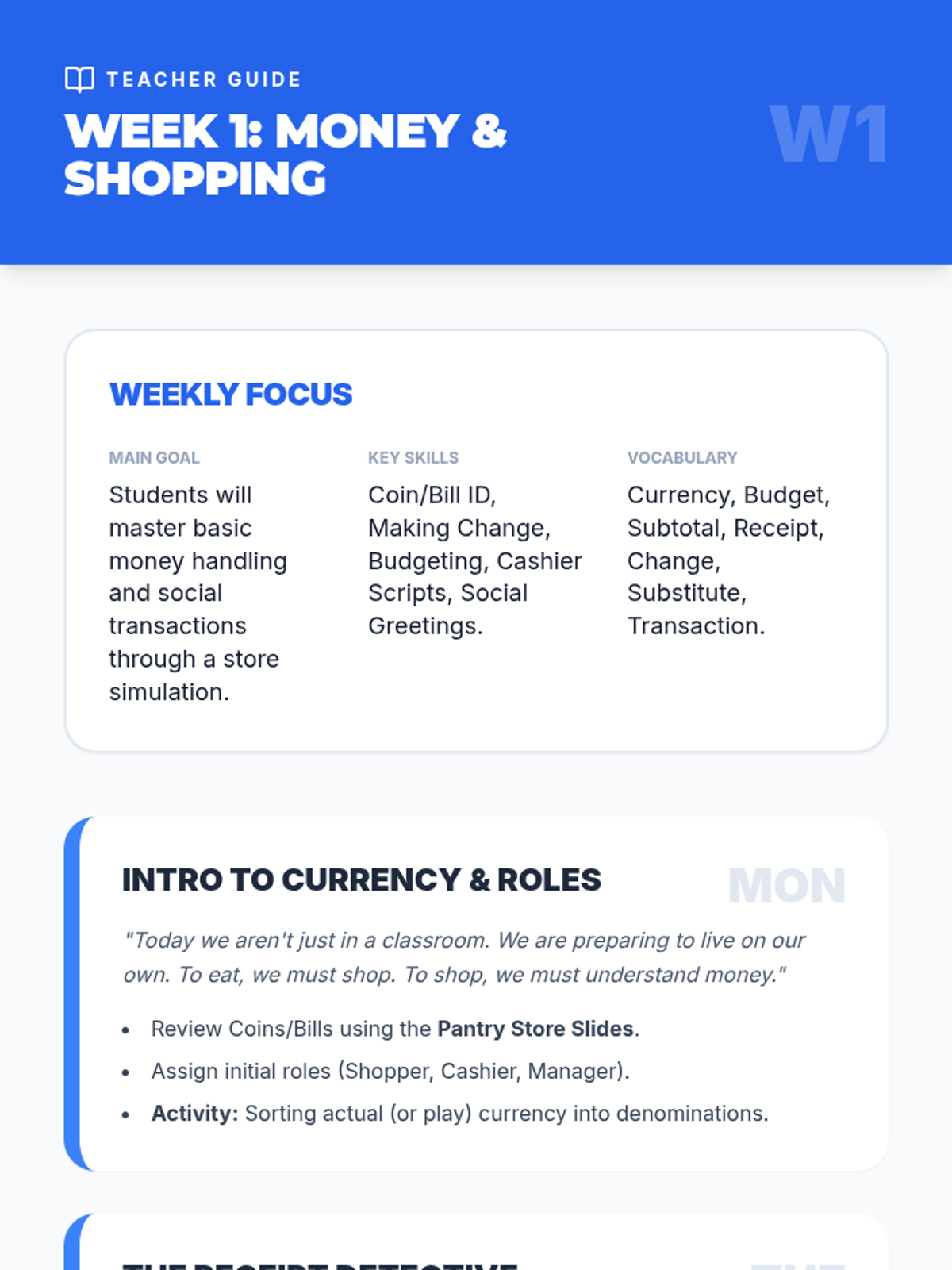 A full-month curriculum focused on developing independence through real-world simulations, role-playing, and practical application of functional life skills.