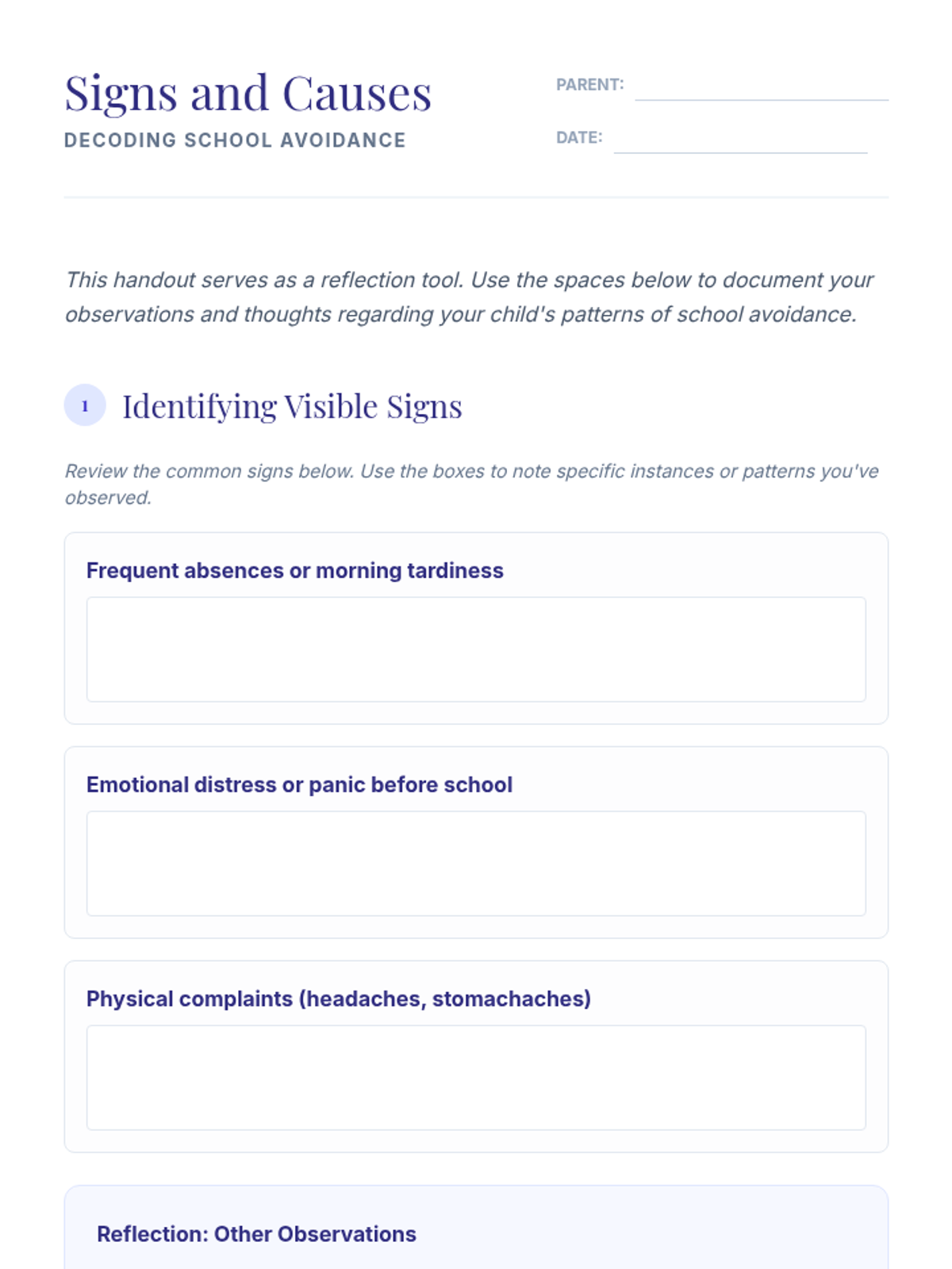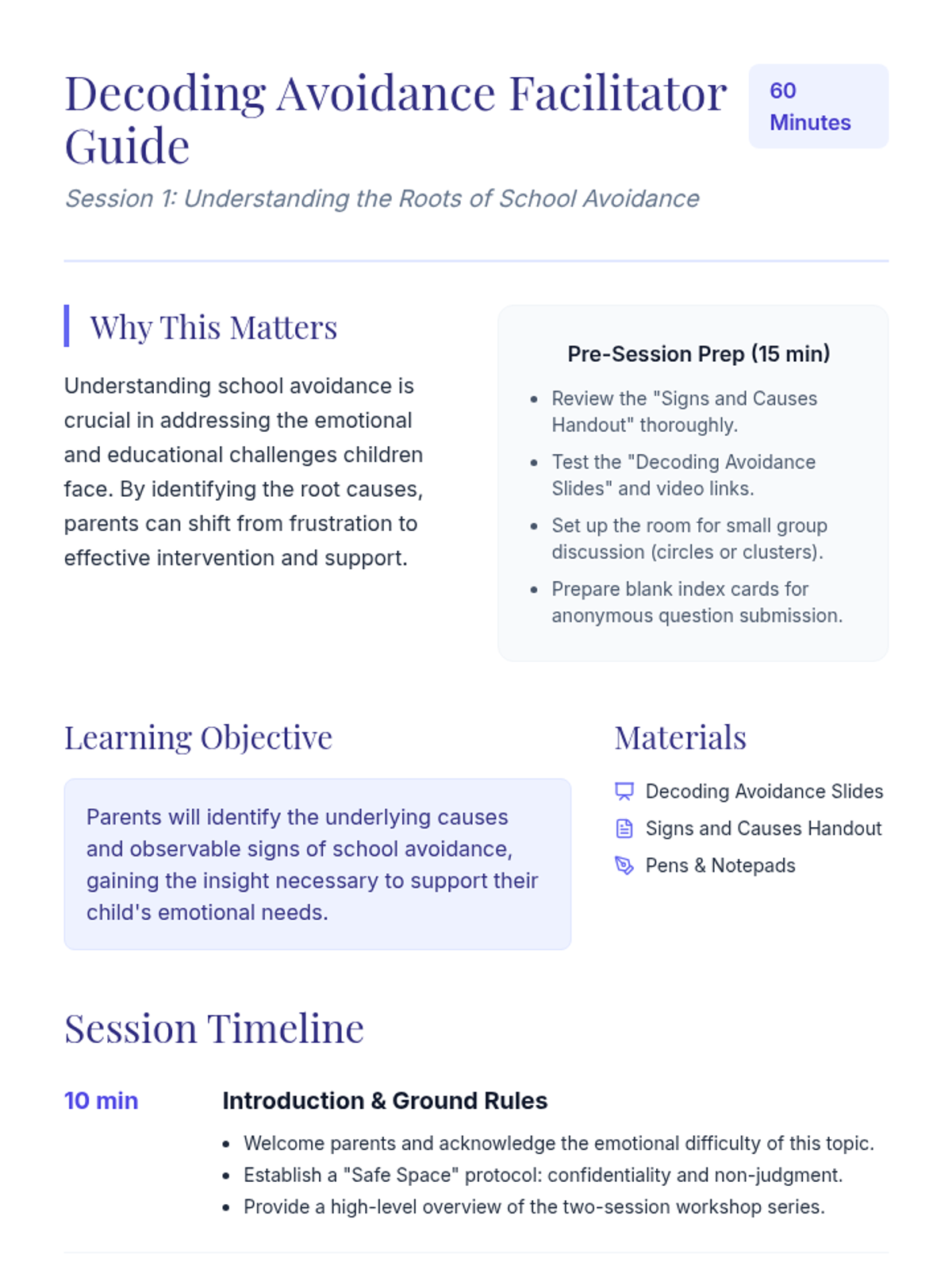 A two-session workshop series for parents to understand the roots of school avoidance and develop collaborative strategies for successful re-engagement.