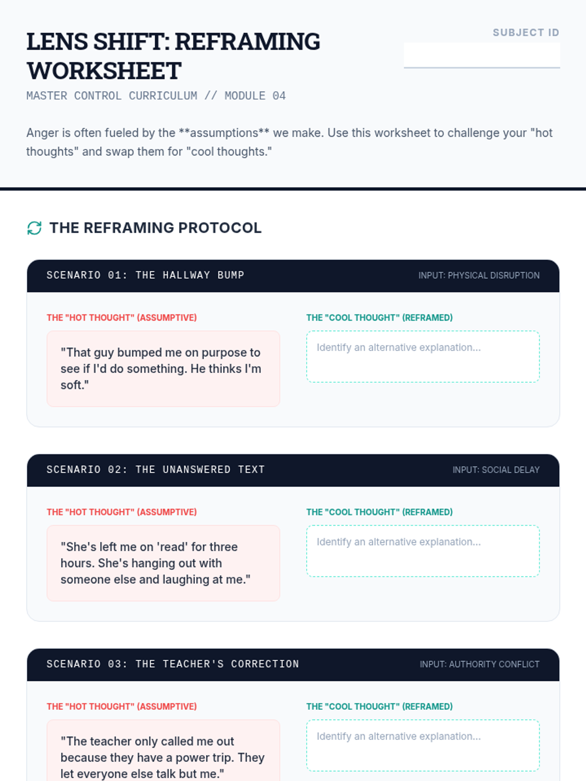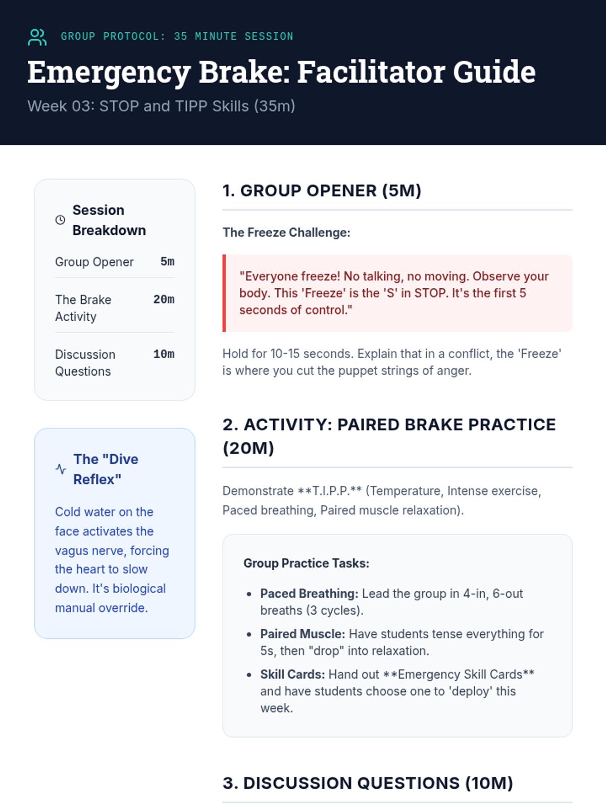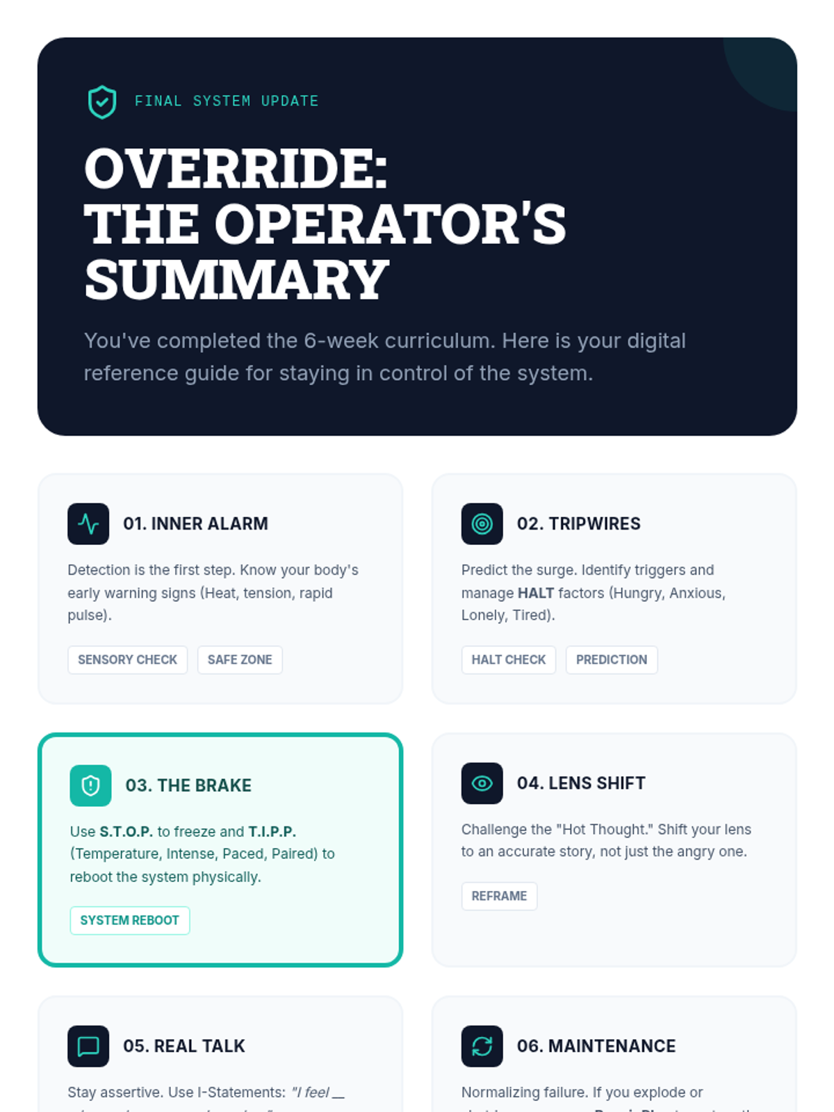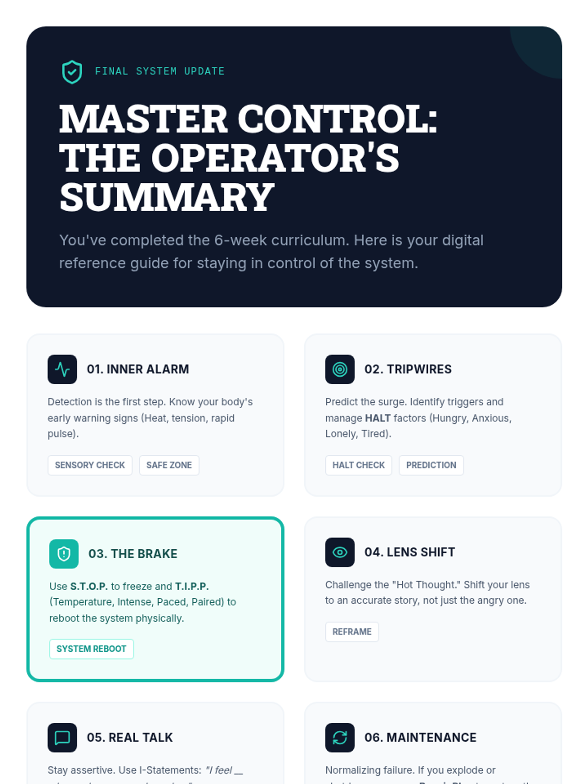 A 6-week evidence-based curriculum for high schoolers focused on shifting from reactive anger (explosion/shutdown) to proactive self-regulation using CBT and DBT skills.