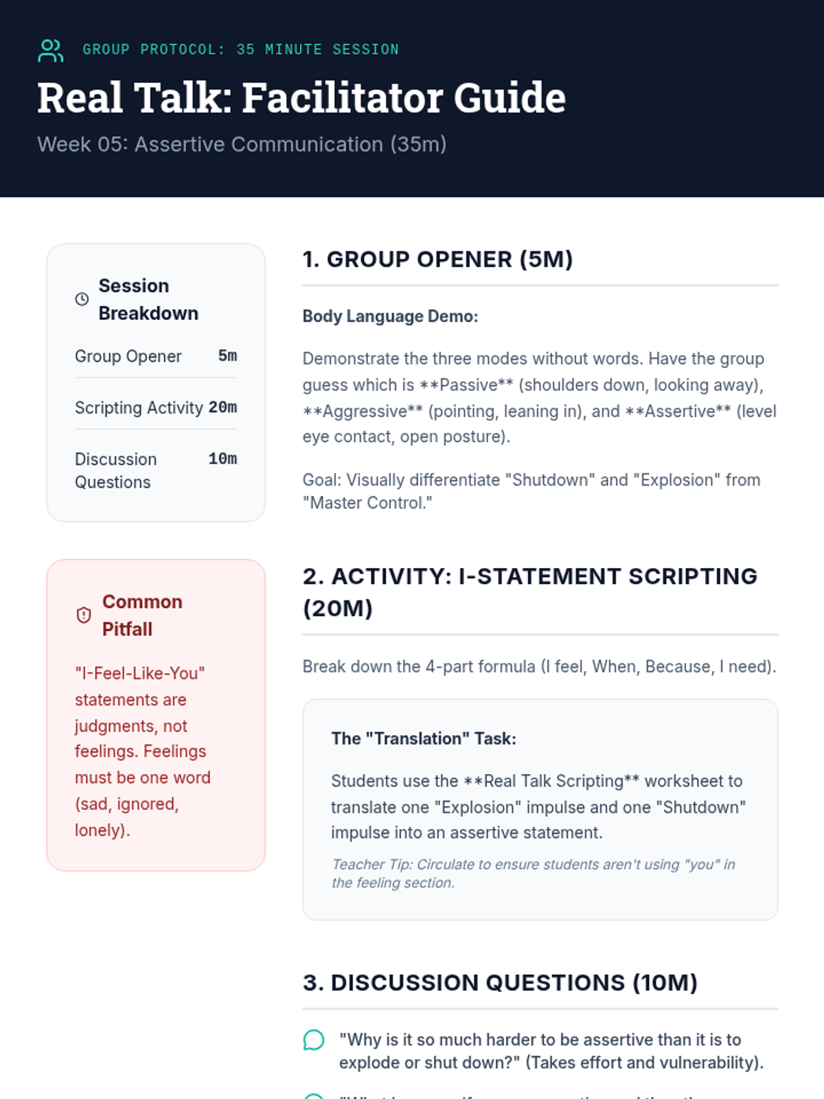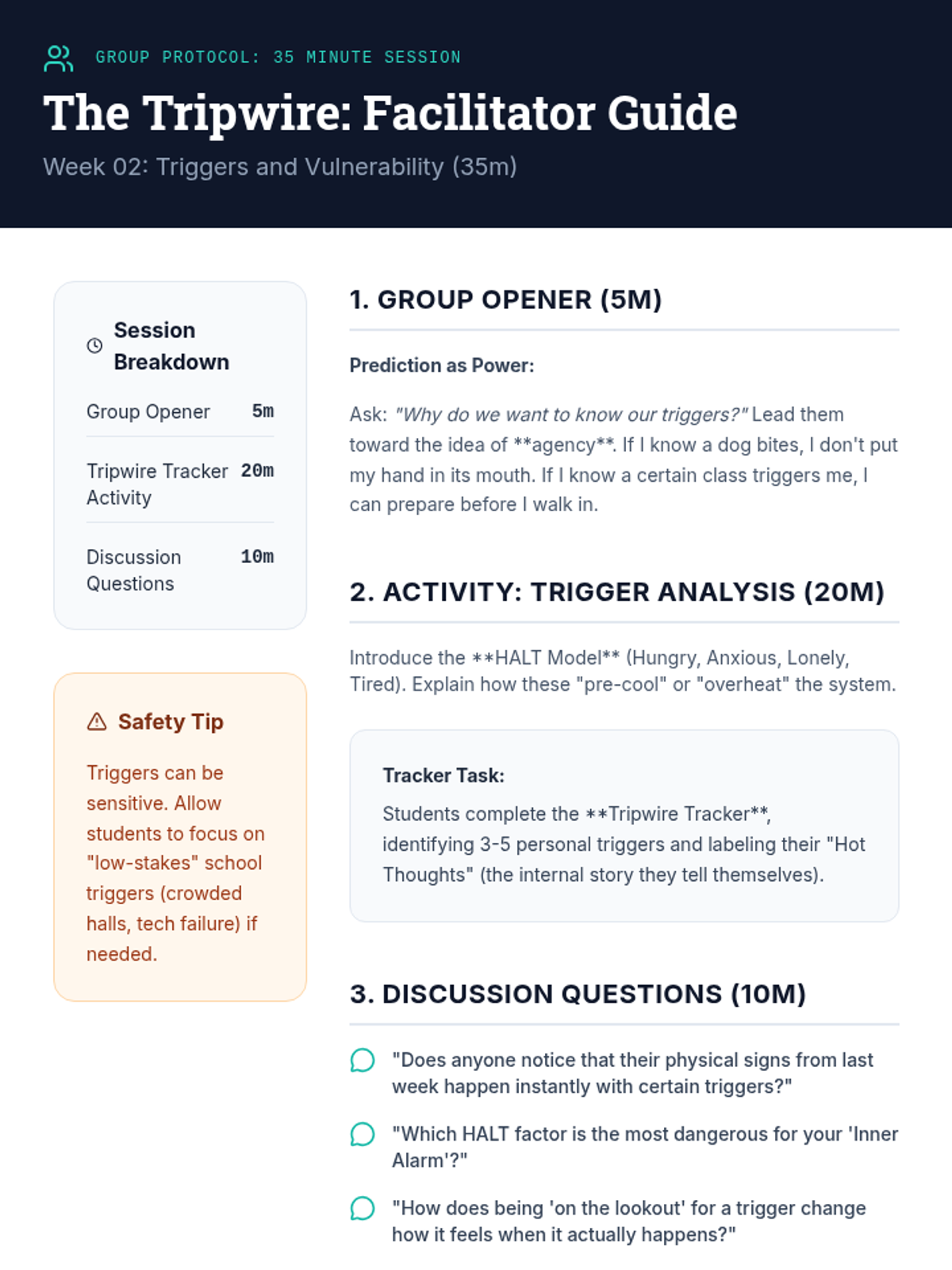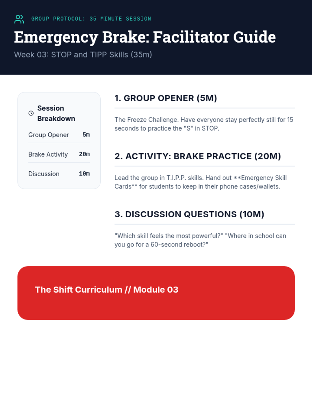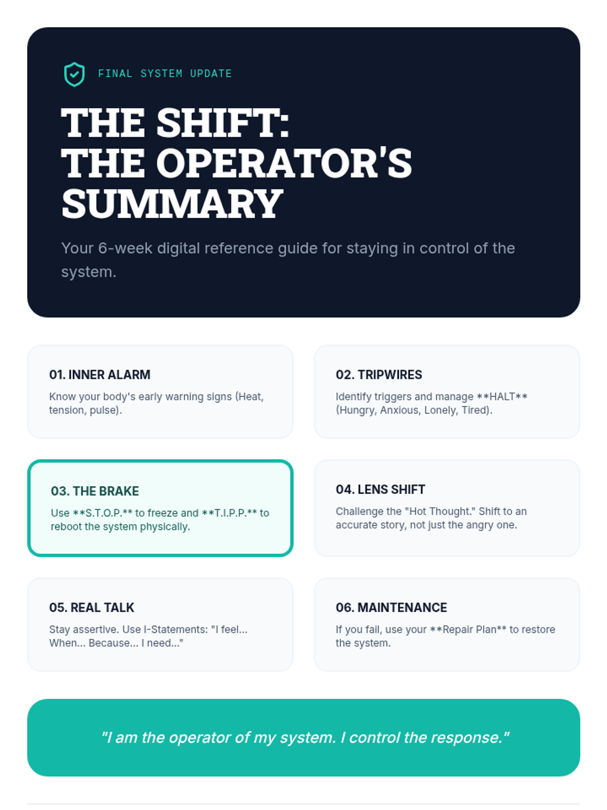 A 6-week evidence-based curriculum for high schoolers focused on shifting from reactive anger (explosion/shutdown) to proactive self-regulation using CBT and DBT skills.