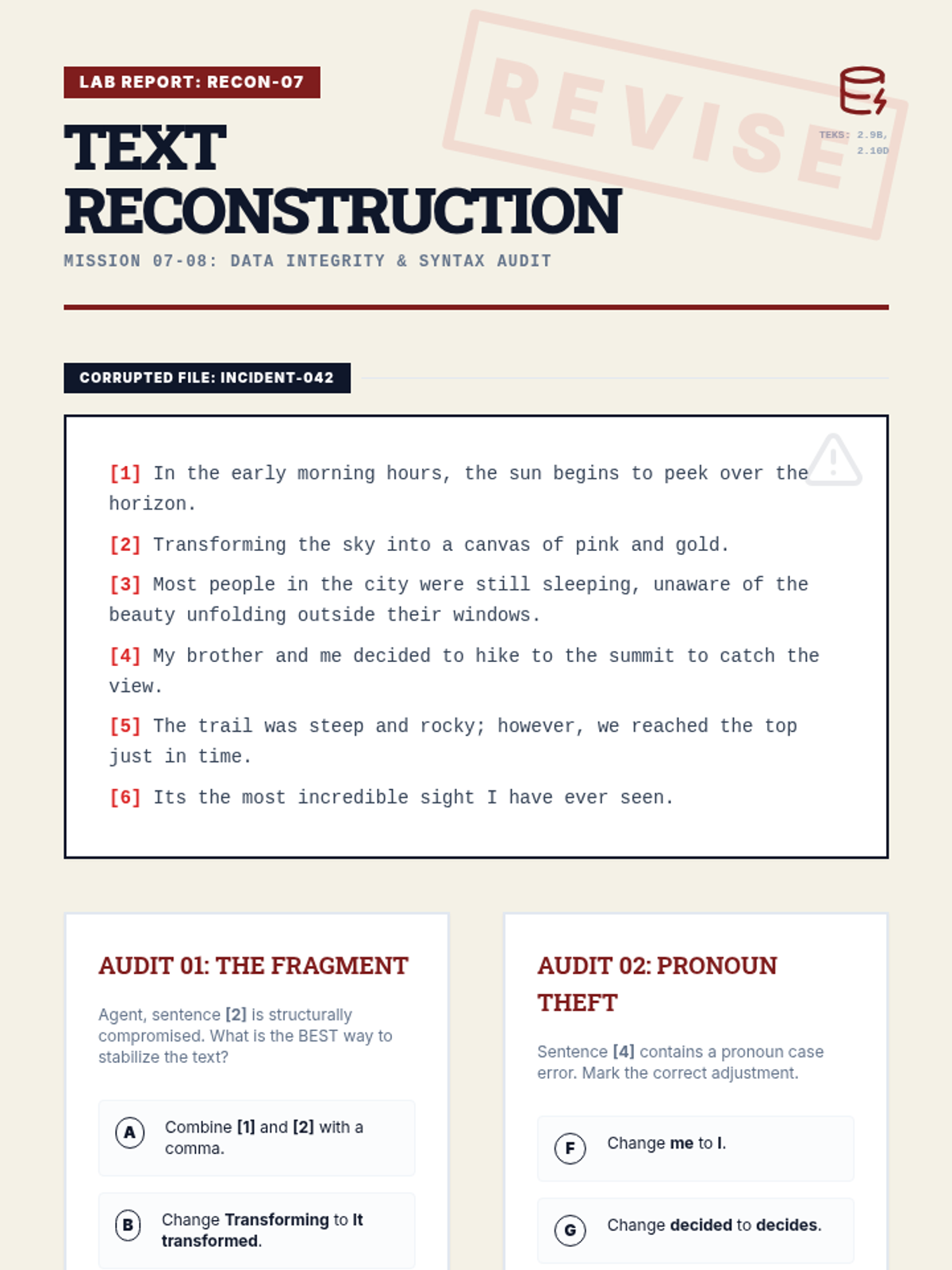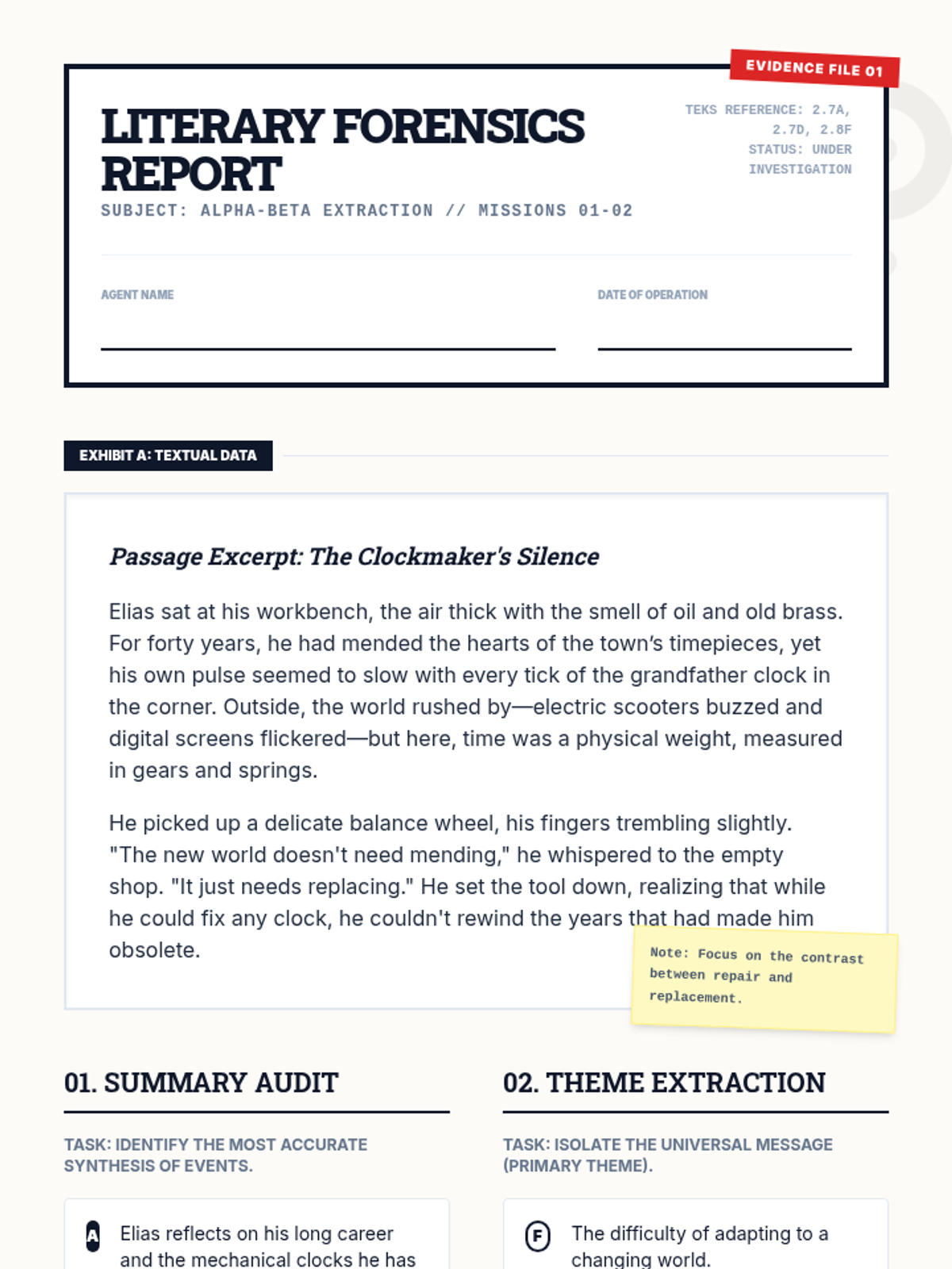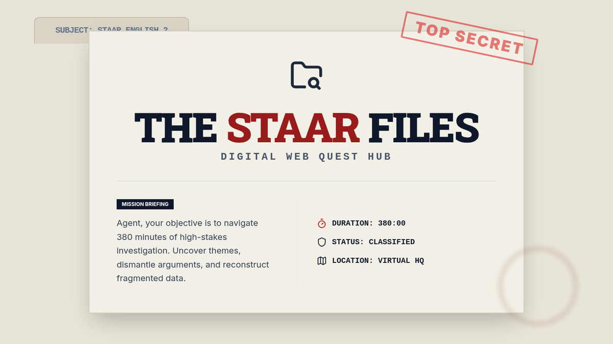 A comprehensive 380-minute digital web quest for STAAR English 2 preparation, divided into 9 high-intensity missions of 45 minutes or less, covering the top five most tested TEKS.