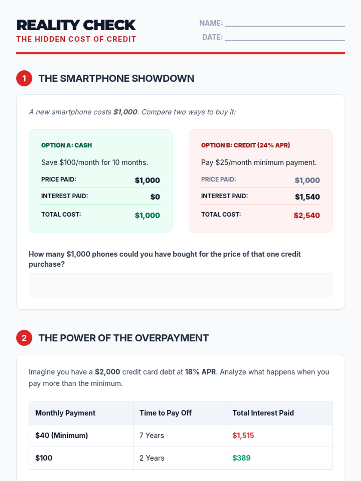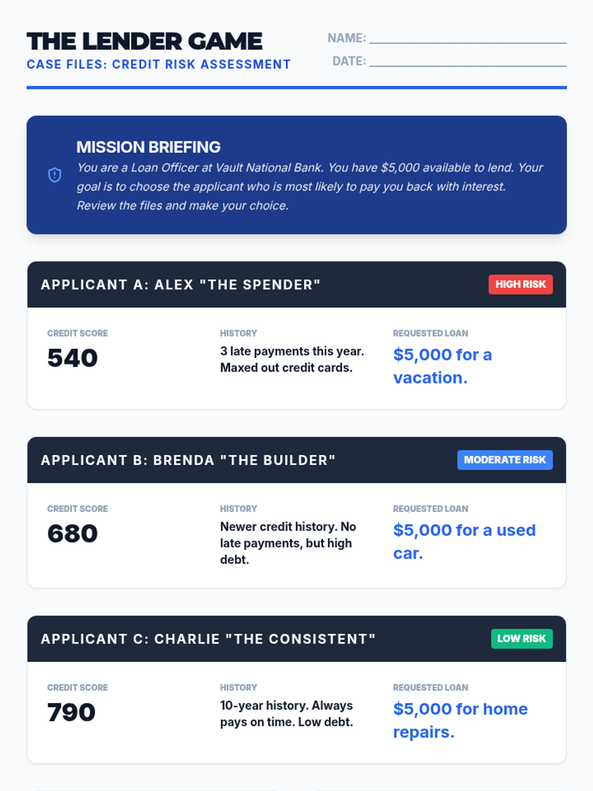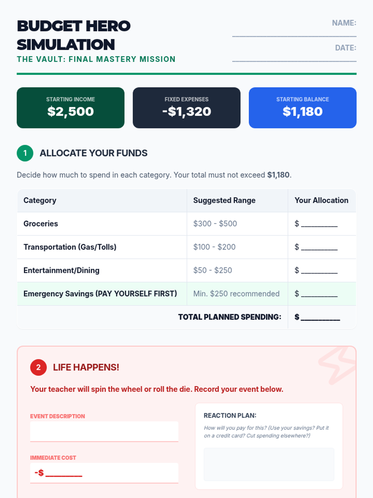 A simulation-based journey where 7th graders step into the role of young adults managing their first finances. They explore bank accounts, the mathematics of compound interest, credit scores, and the real cost of borrowing through gamified challenges and case studies.