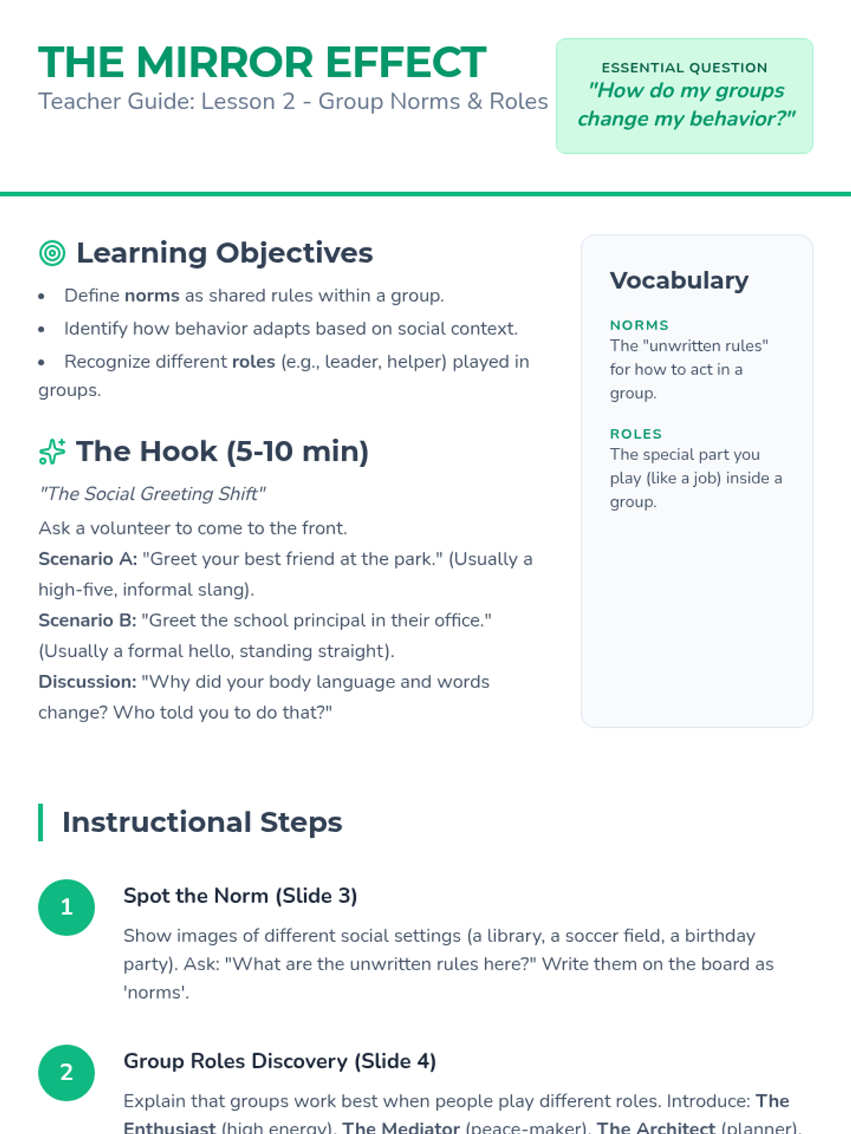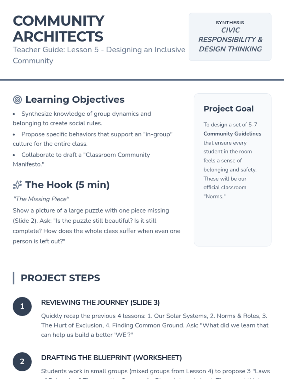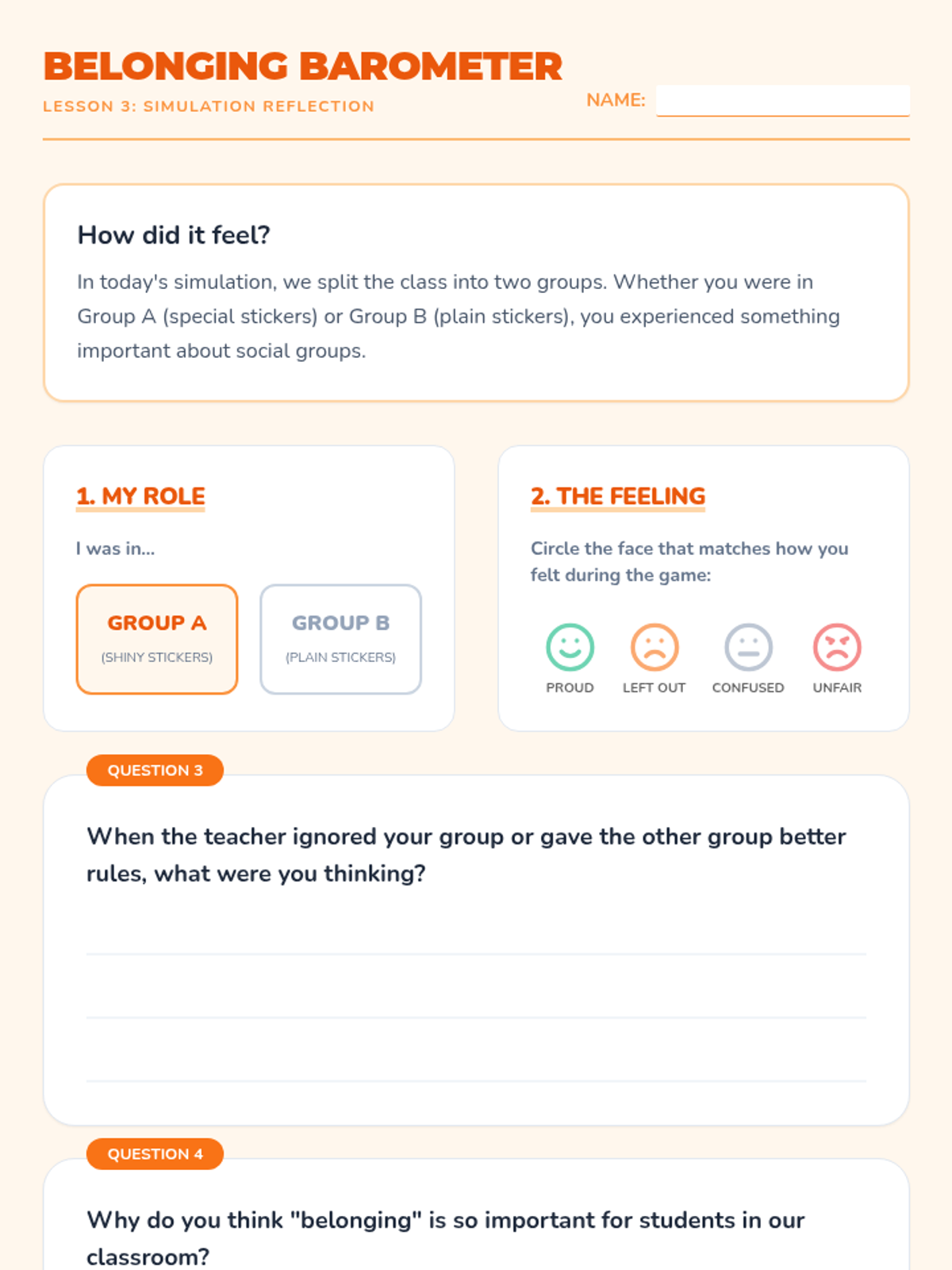 This 3rd-grade sequence explores the psychology of social groups, belonging, and how group membership affects self-perception. Students will navigate from identifying their own social circles to understanding group norms, the emotional impact of inclusion/exclusion, and finally designing an inclusive community.