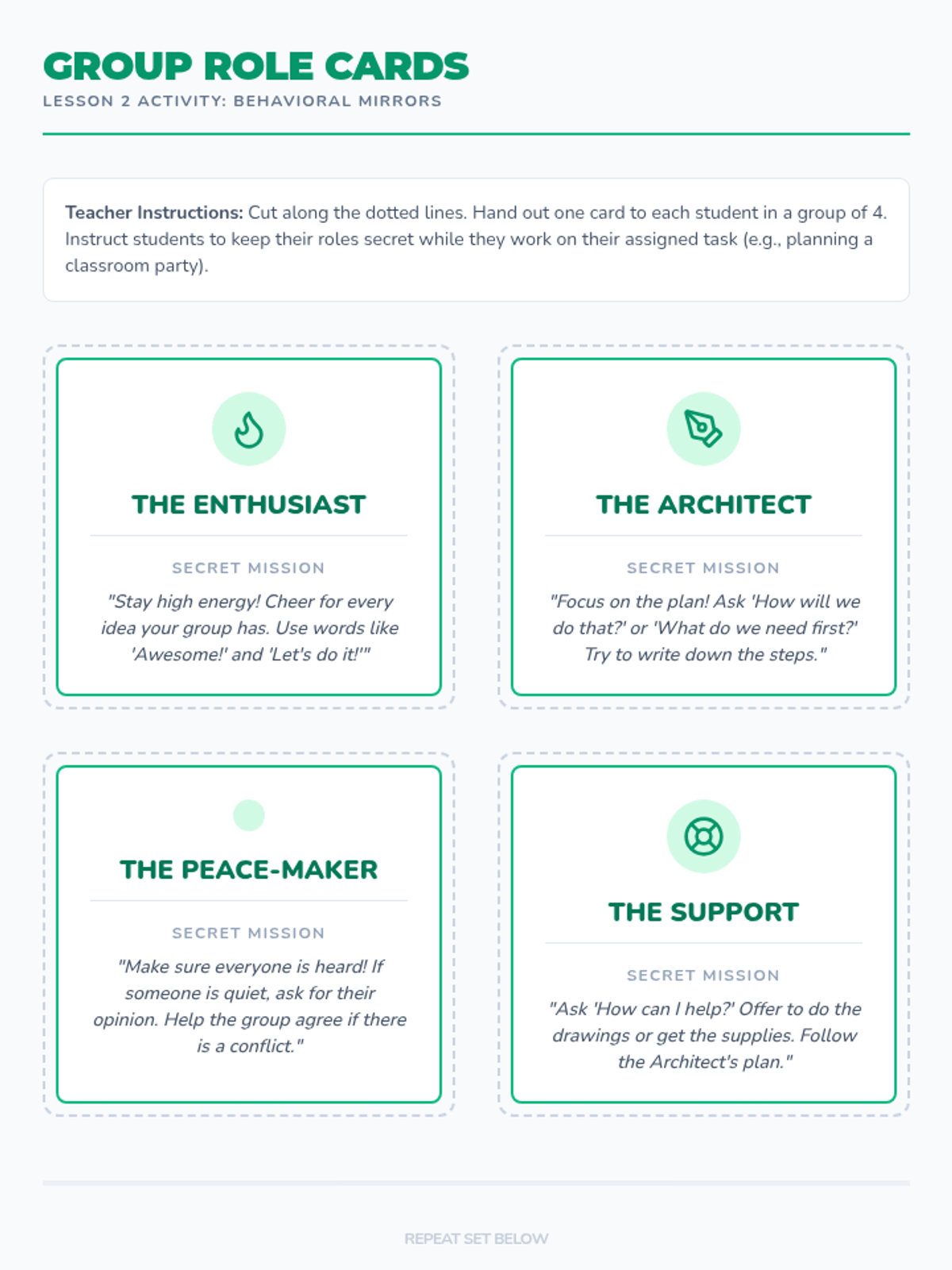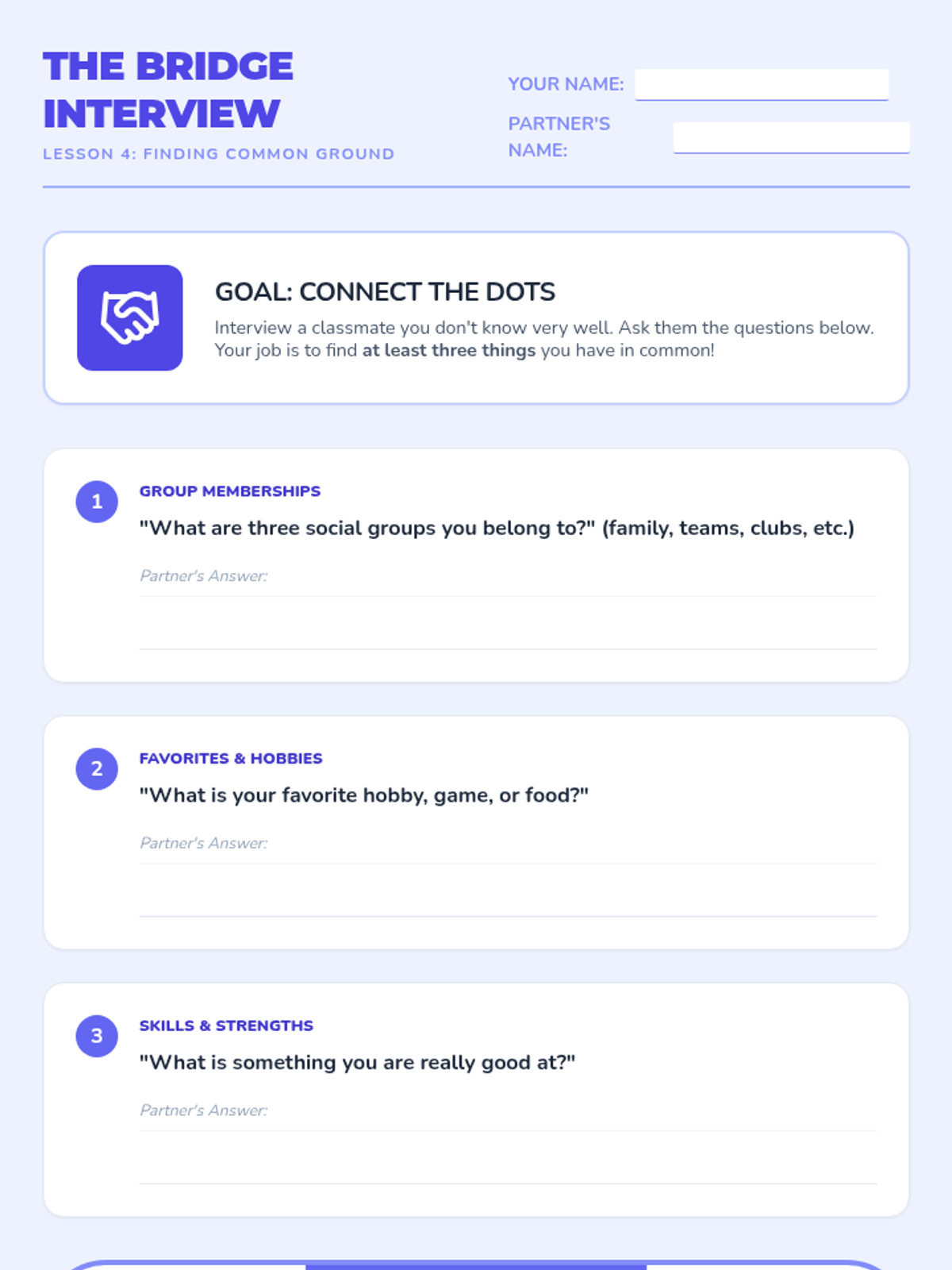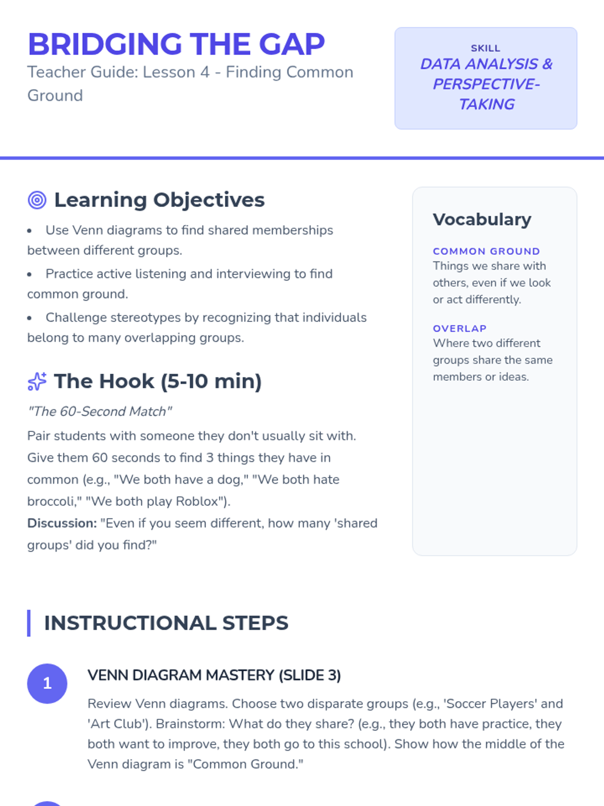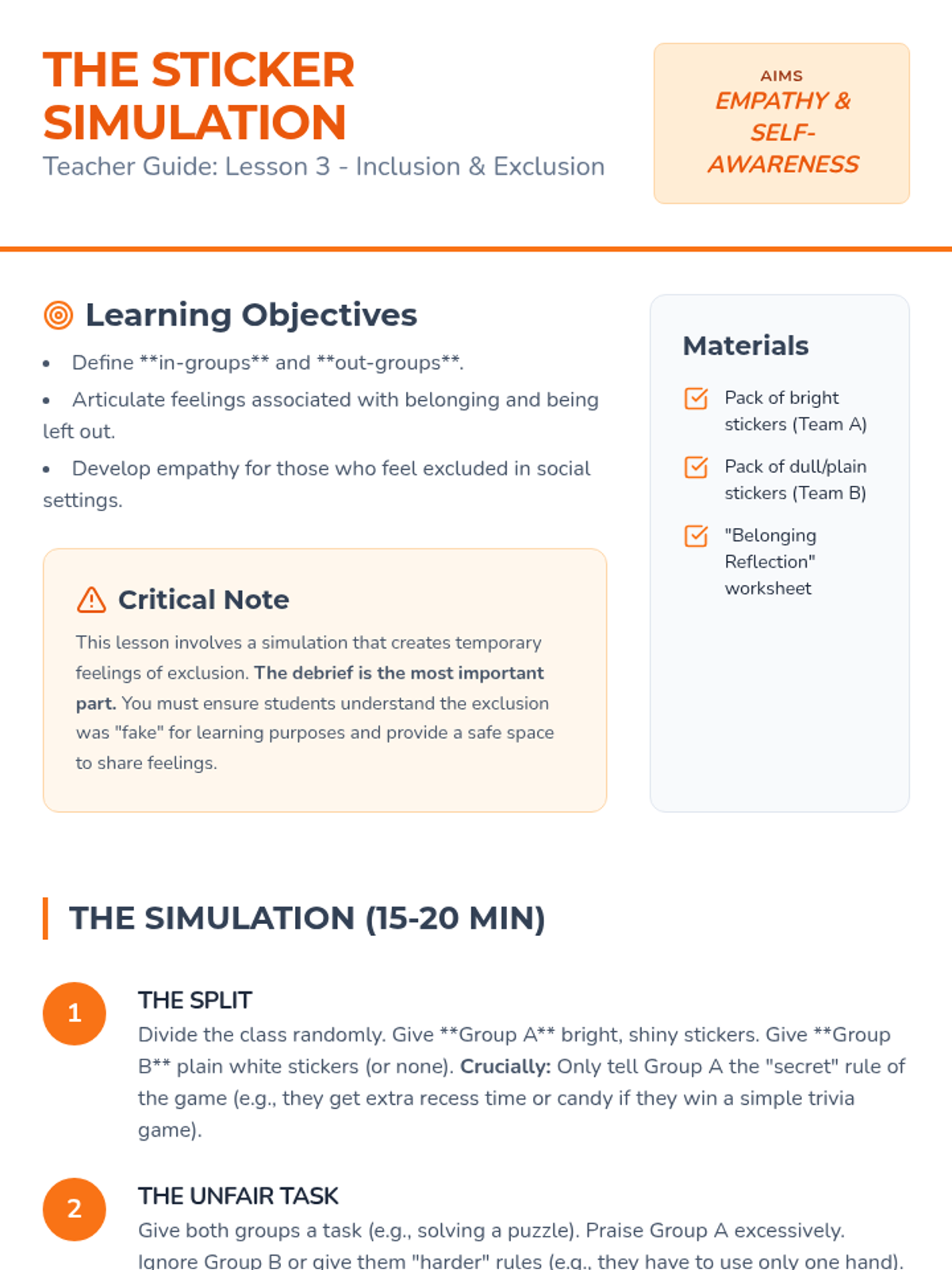 This 3rd-grade sequence explores the psychology of social groups, belonging, and how group membership affects self-perception. Students will navigate from identifying their own social circles to understanding group norms, the emotional impact of inclusion/exclusion, and finally designing an inclusive community.