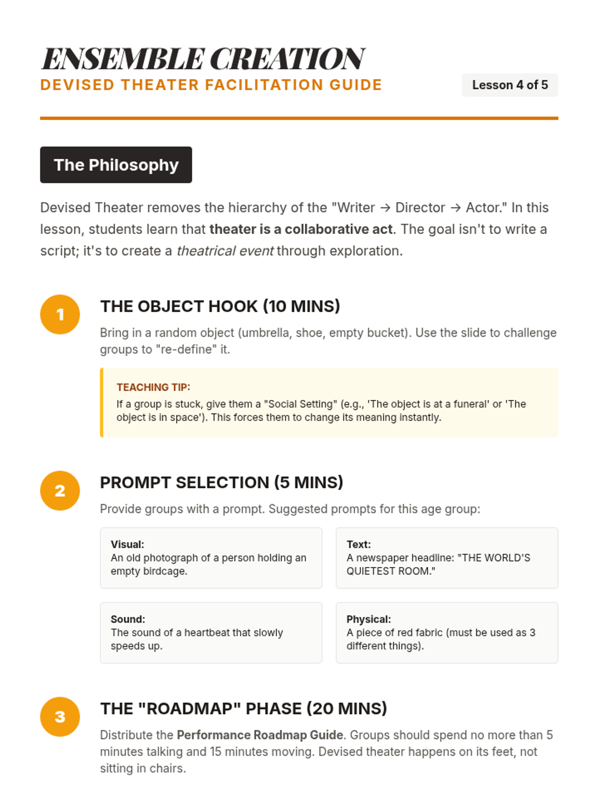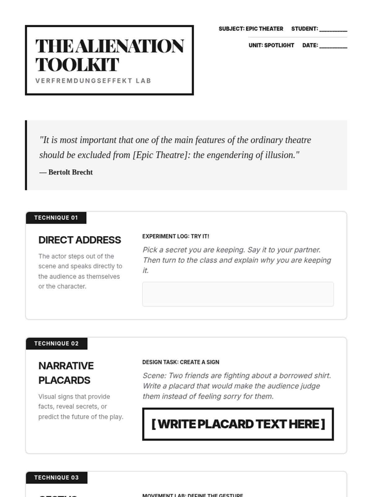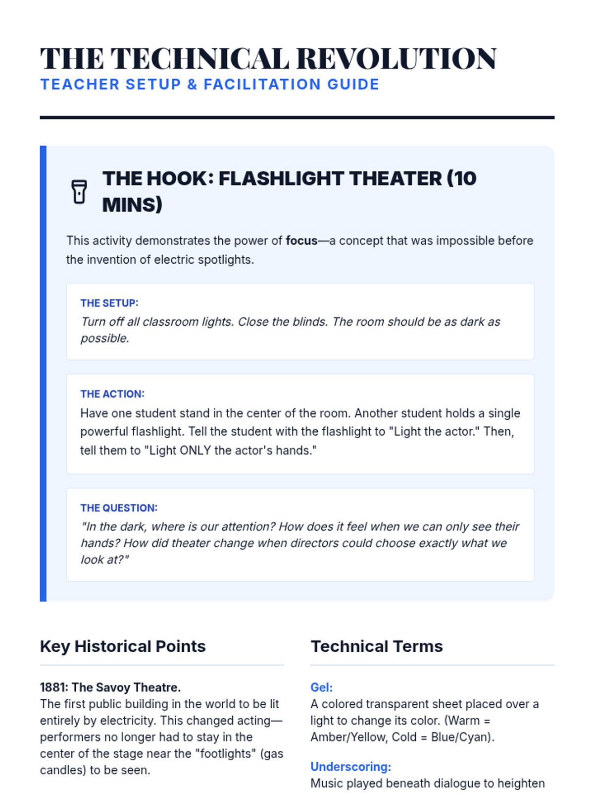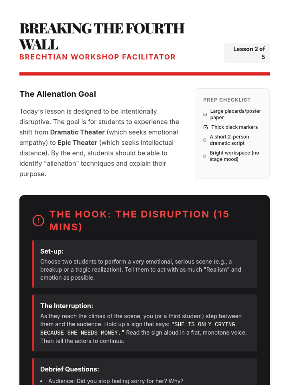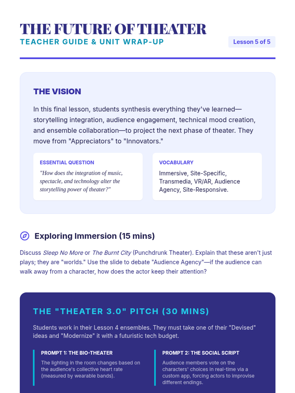 A comprehensive 5-lesson unit exploring the evolution of 20th and 21st-century theater. Students track the development of the 'integrated musical,' experiment with Brechtian alienation, investigate technical stagecraft revolutions, and design for the future of immersive and digital performance.