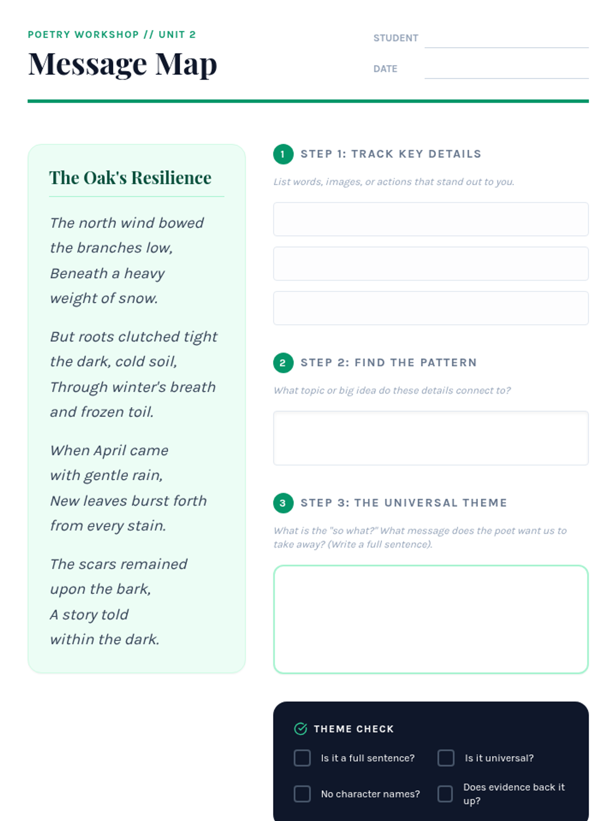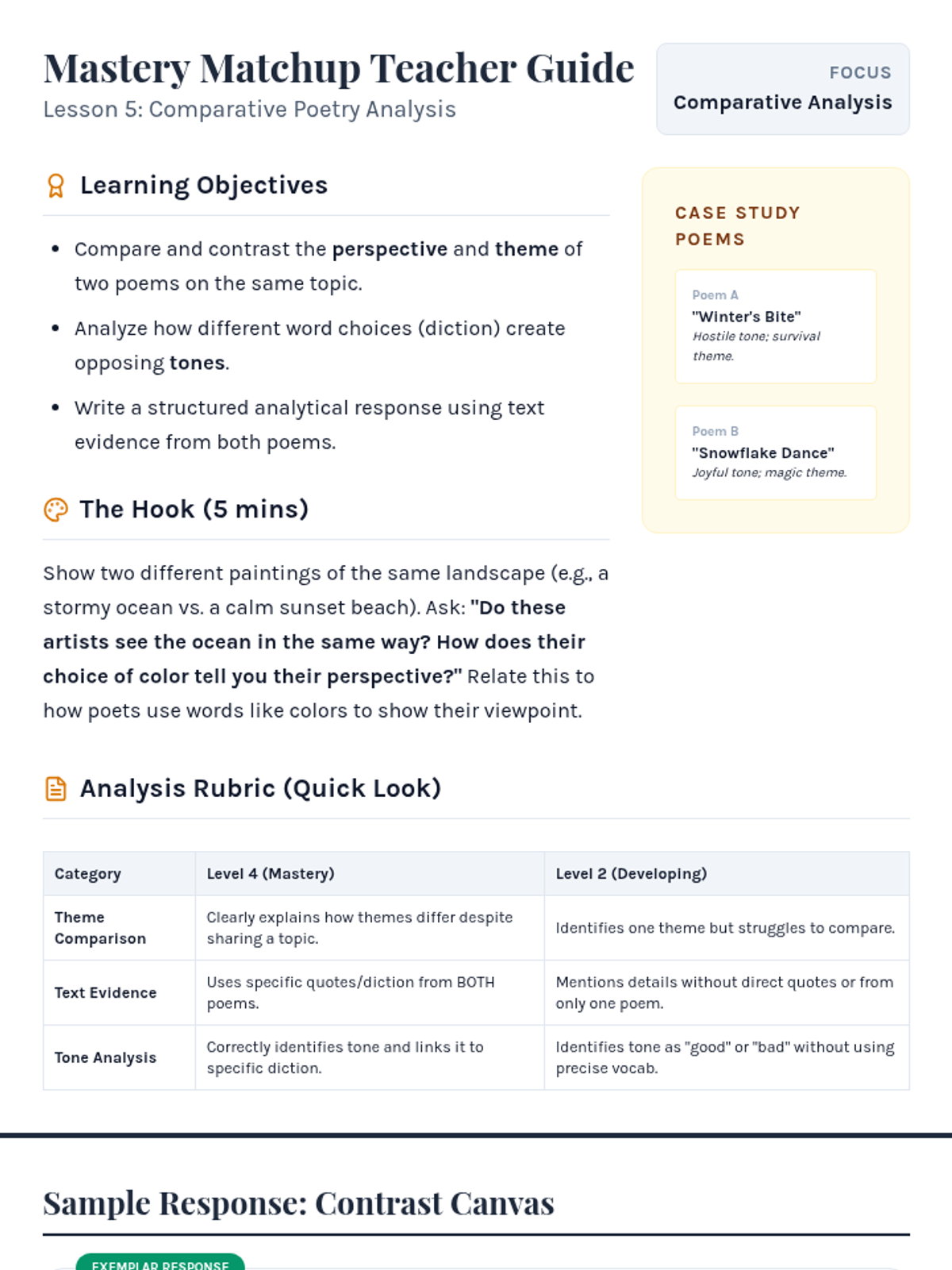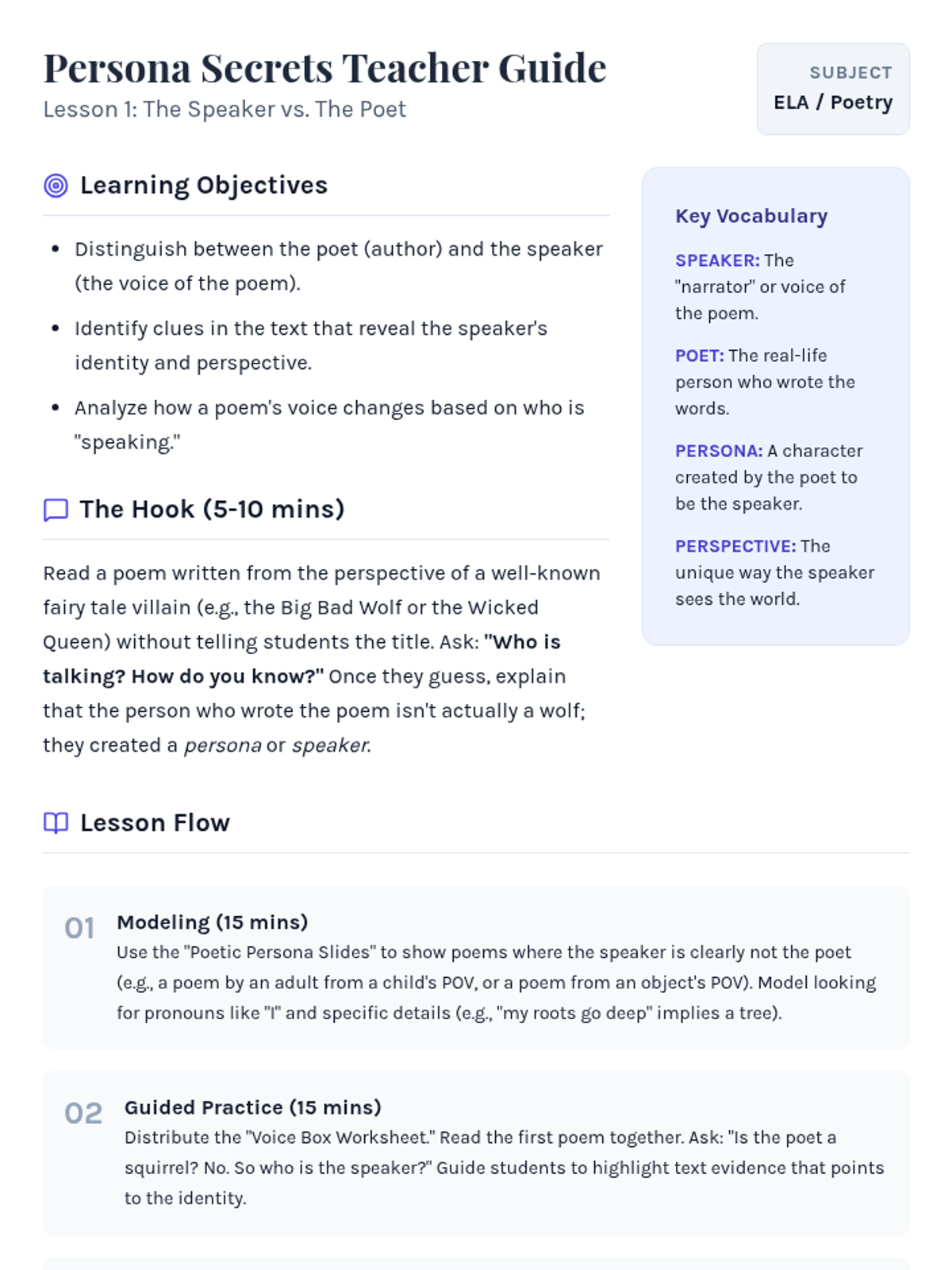 A comprehensive 5th-grade sequence focused on uncovering deep meanings in poetry. Students explore the distinction between speaker and poet, infer universal themes from specific details, analyze how word choice shapes tone, and perform comparative analyses of poetic perspectives.