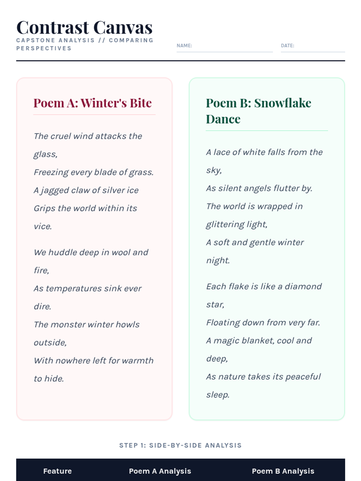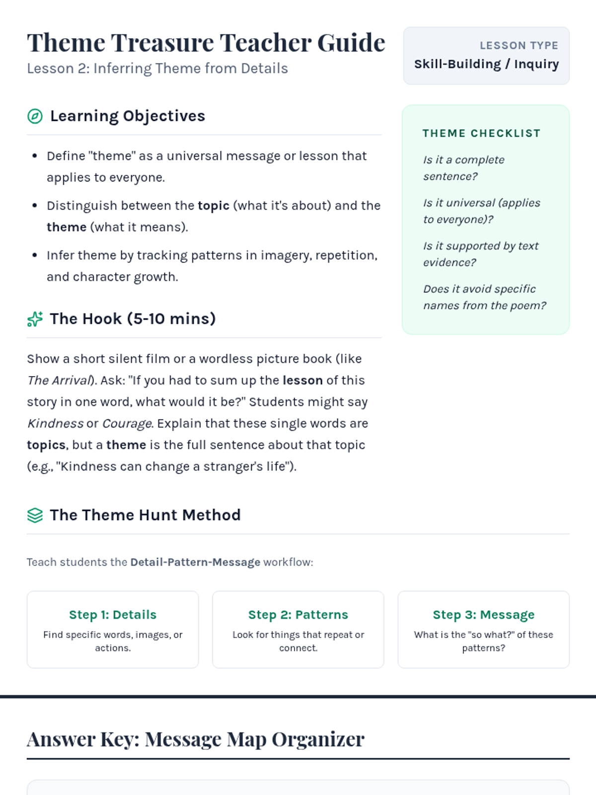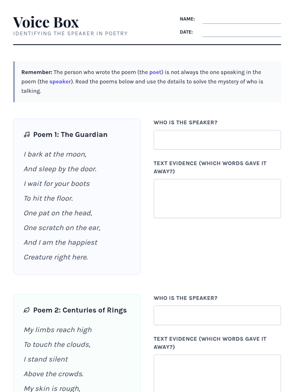 A comprehensive 5th-grade sequence focused on uncovering deep meanings in poetry. Students explore the distinction between speaker and poet, infer universal themes from specific details, analyze how word choice shapes tone, and perform comparative analyses of poetic perspectives.