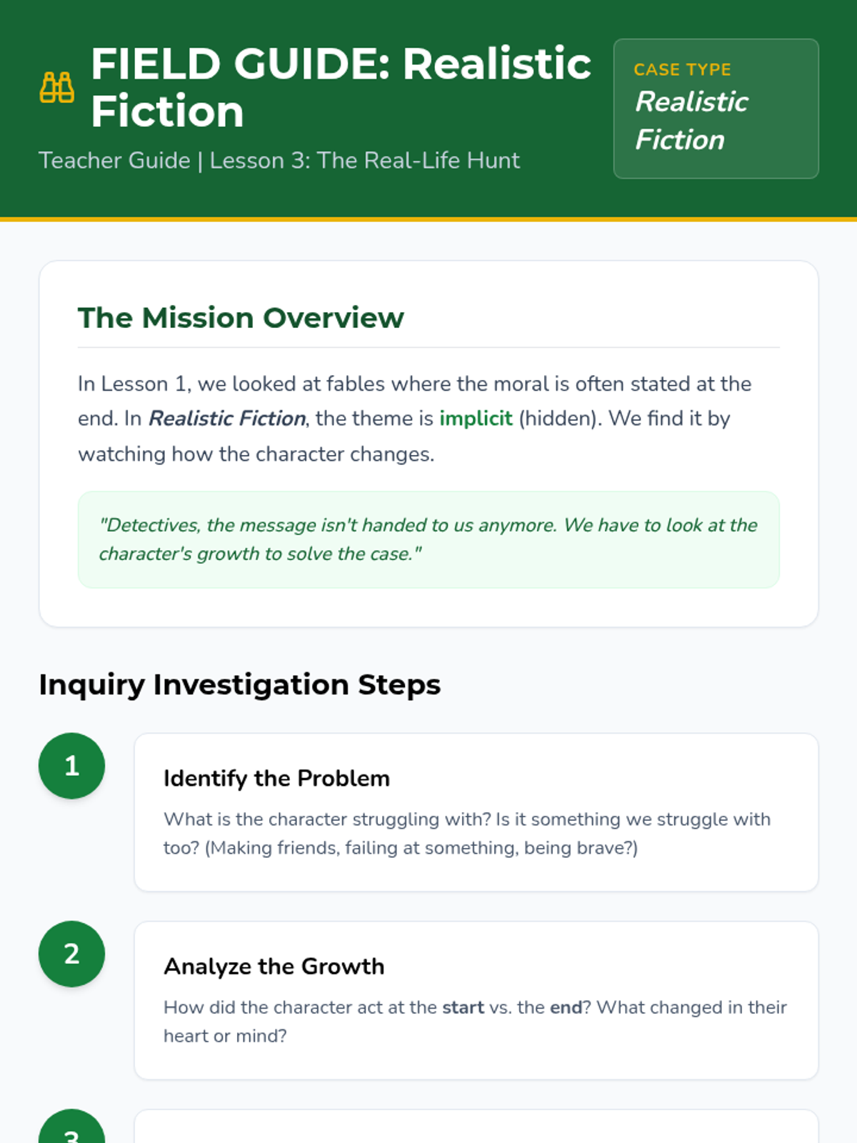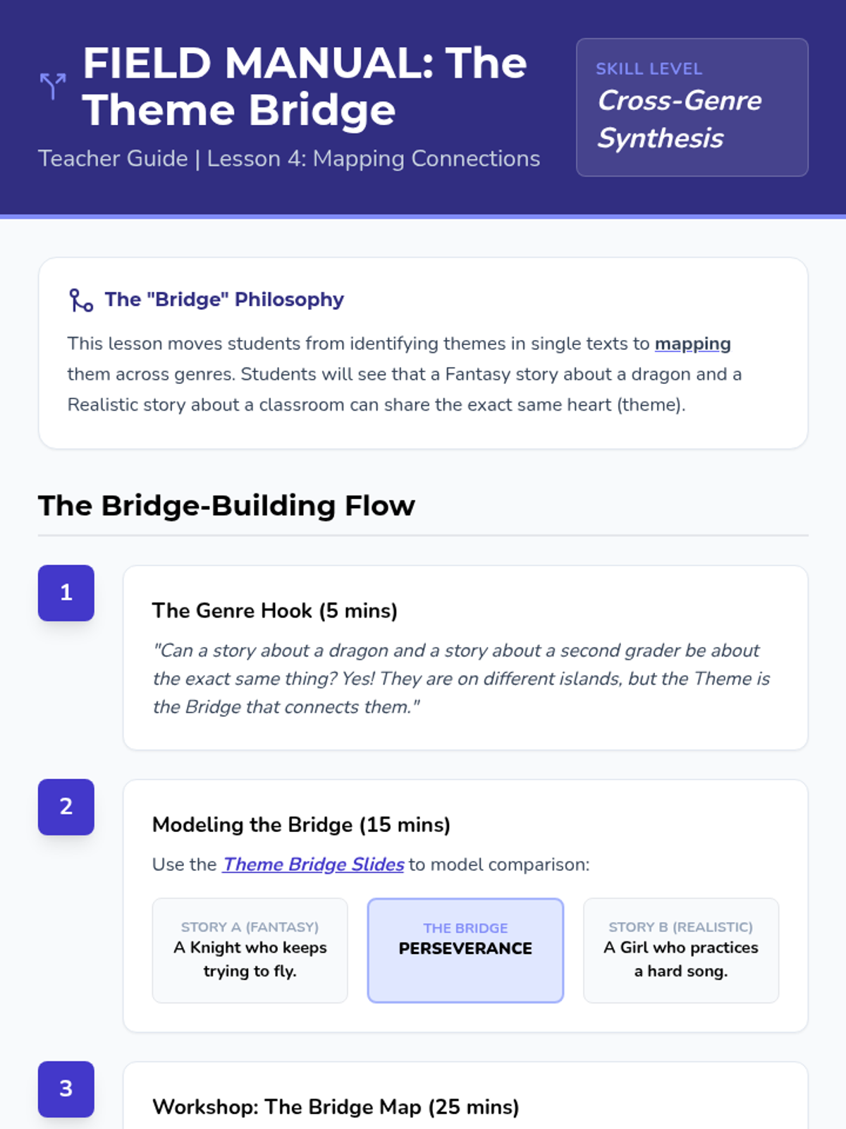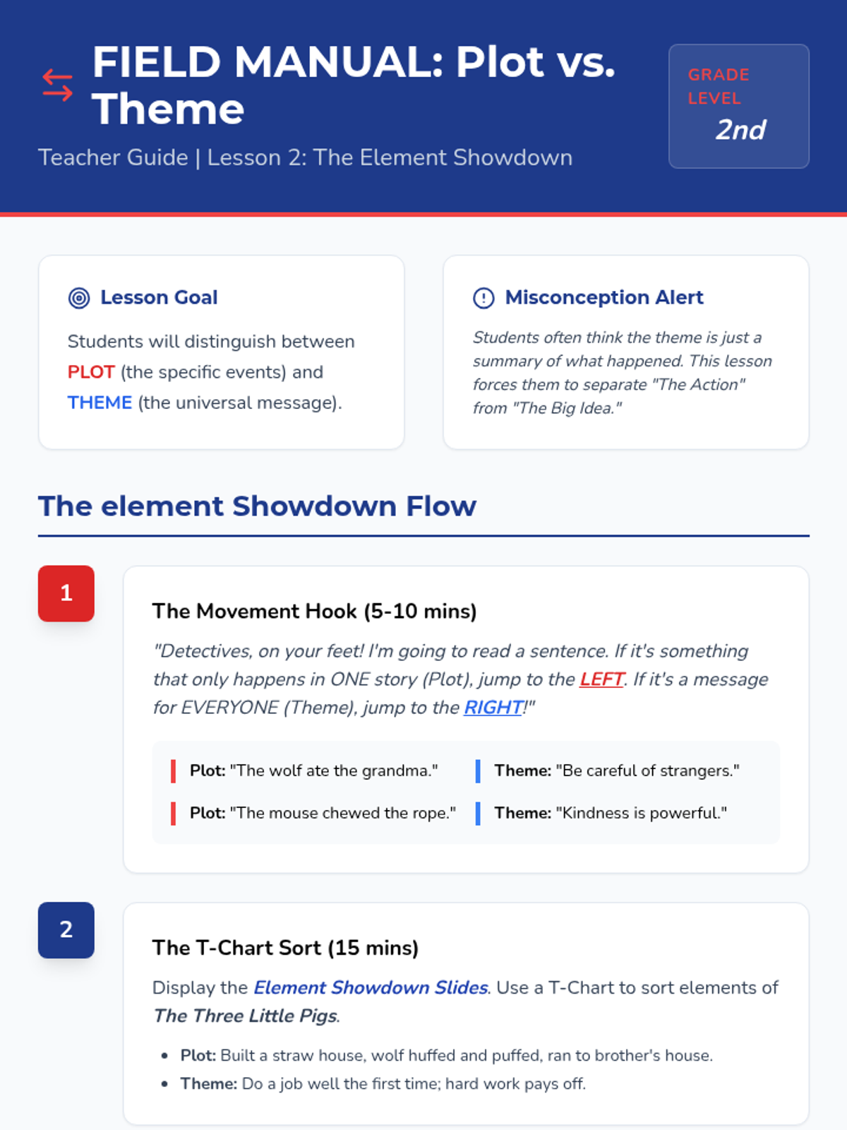 This 2nd-grade sequence guides students through the process of identifying shared themes across diverse texts. Moving from clear morals in fables to implicit messages in realistic fiction, students learn to generalize specific story lessons into universal 'Big Ideas' and connect stories of different genres through shared thematic bridges.
