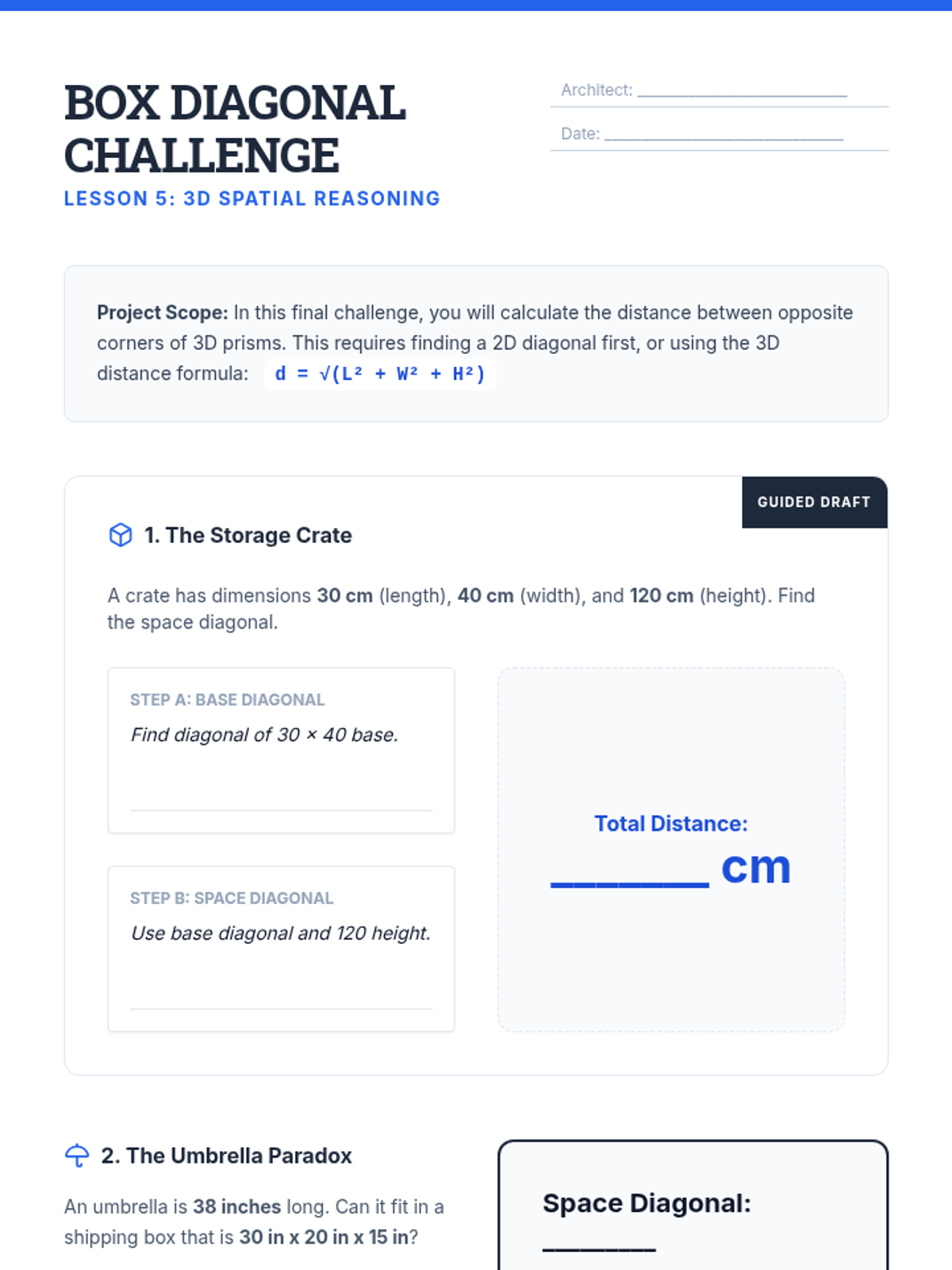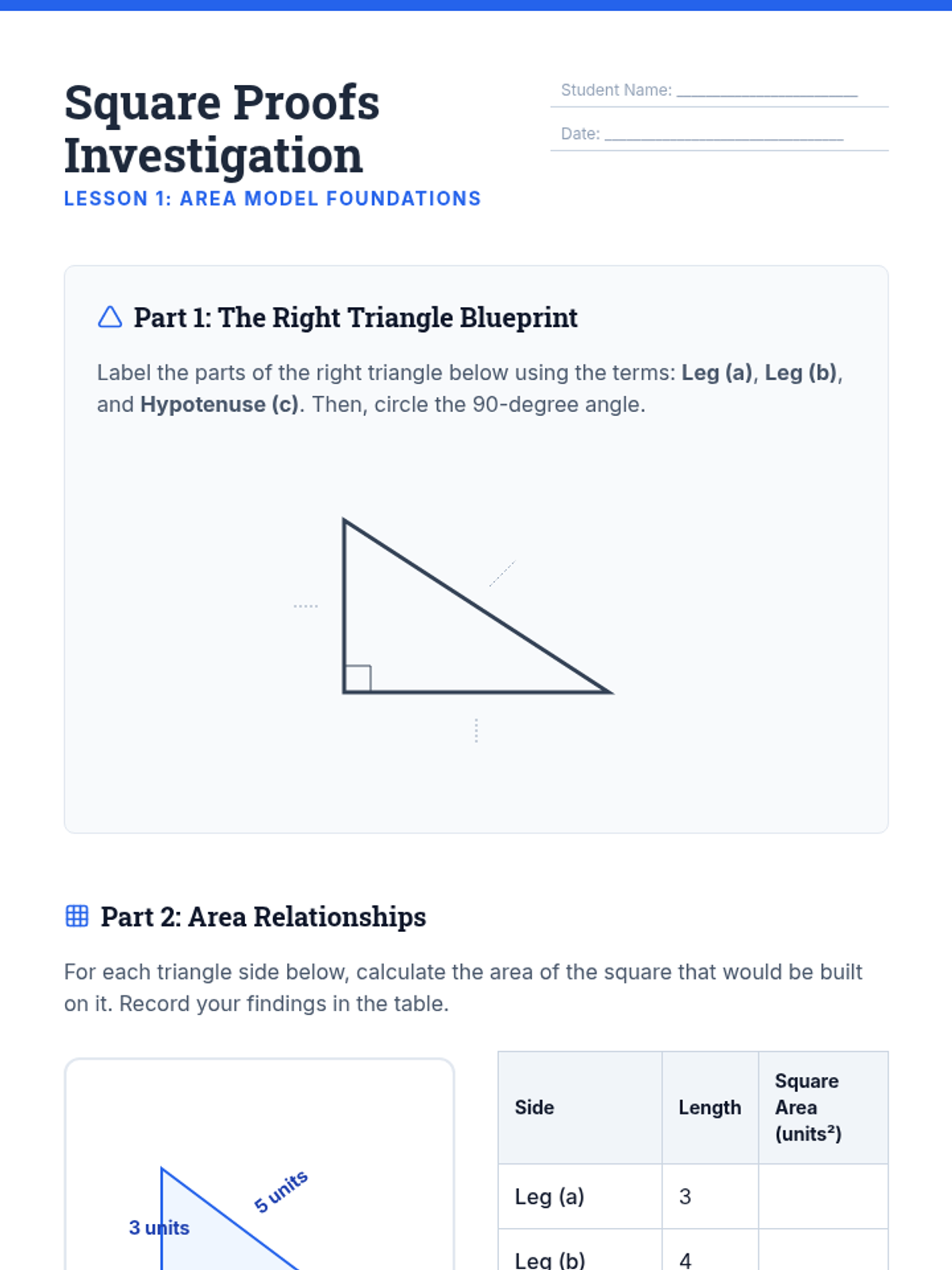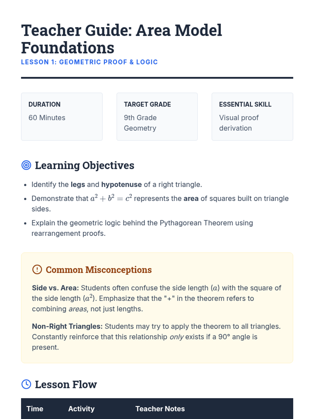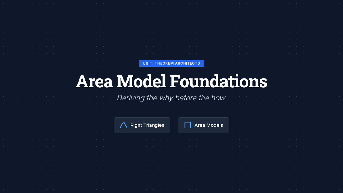A comprehensive 9th-grade geometry unit that guides students from the conceptual derivation of the Pythagorean Theorem using area models to complex 3D applications and coordinate geometry. Students will build spatial reasoning and algebraic skills through architect-themed activities and real-world problem-solving.