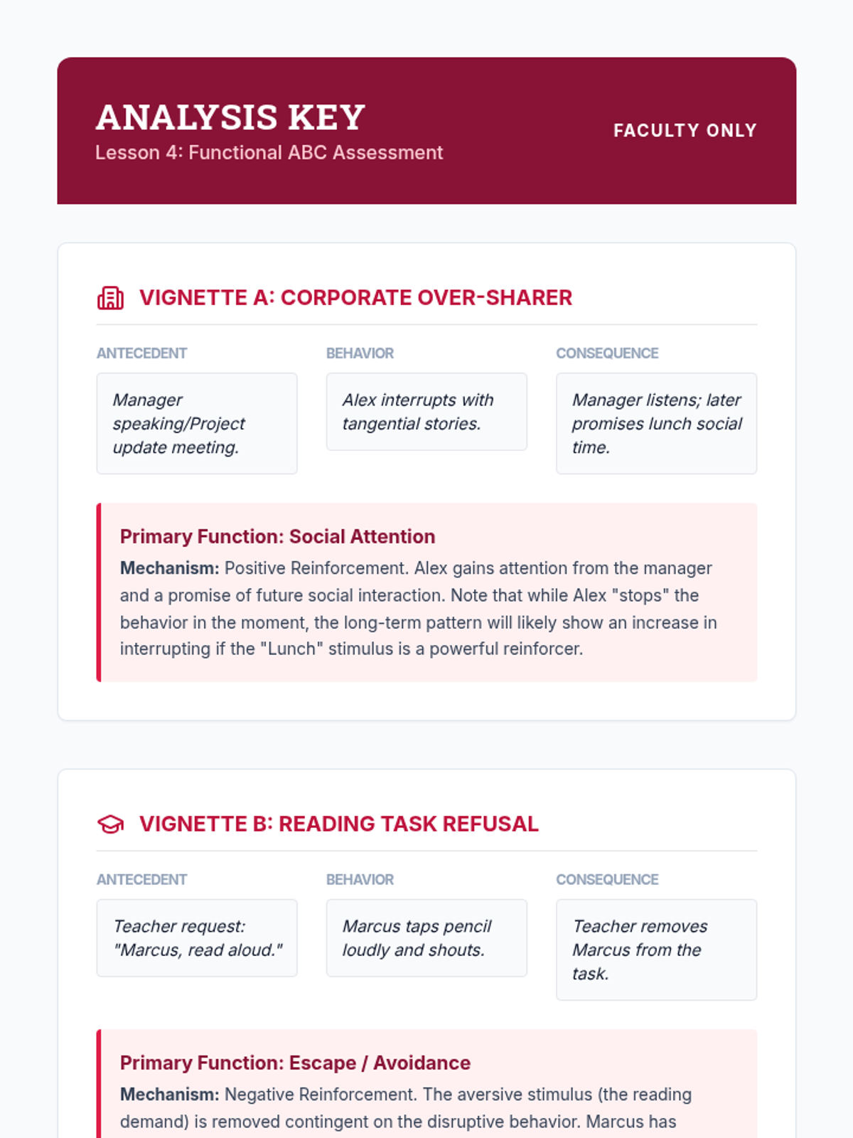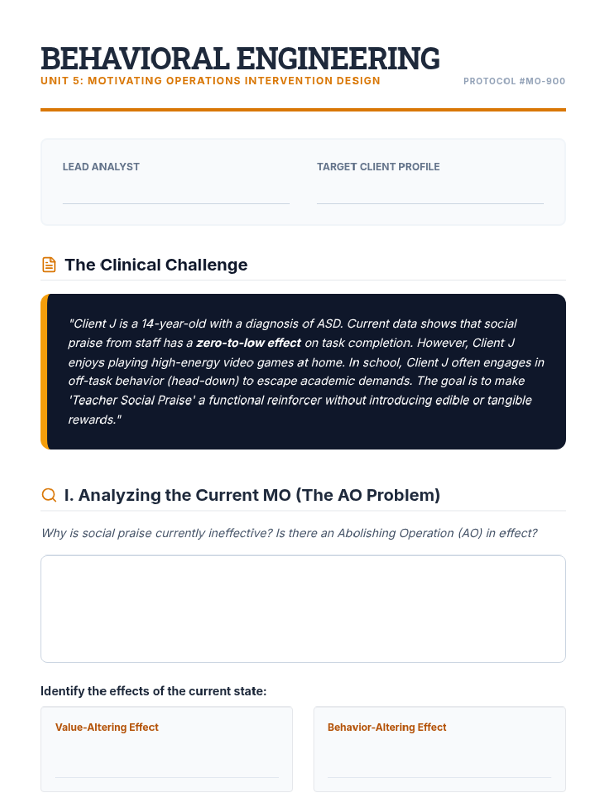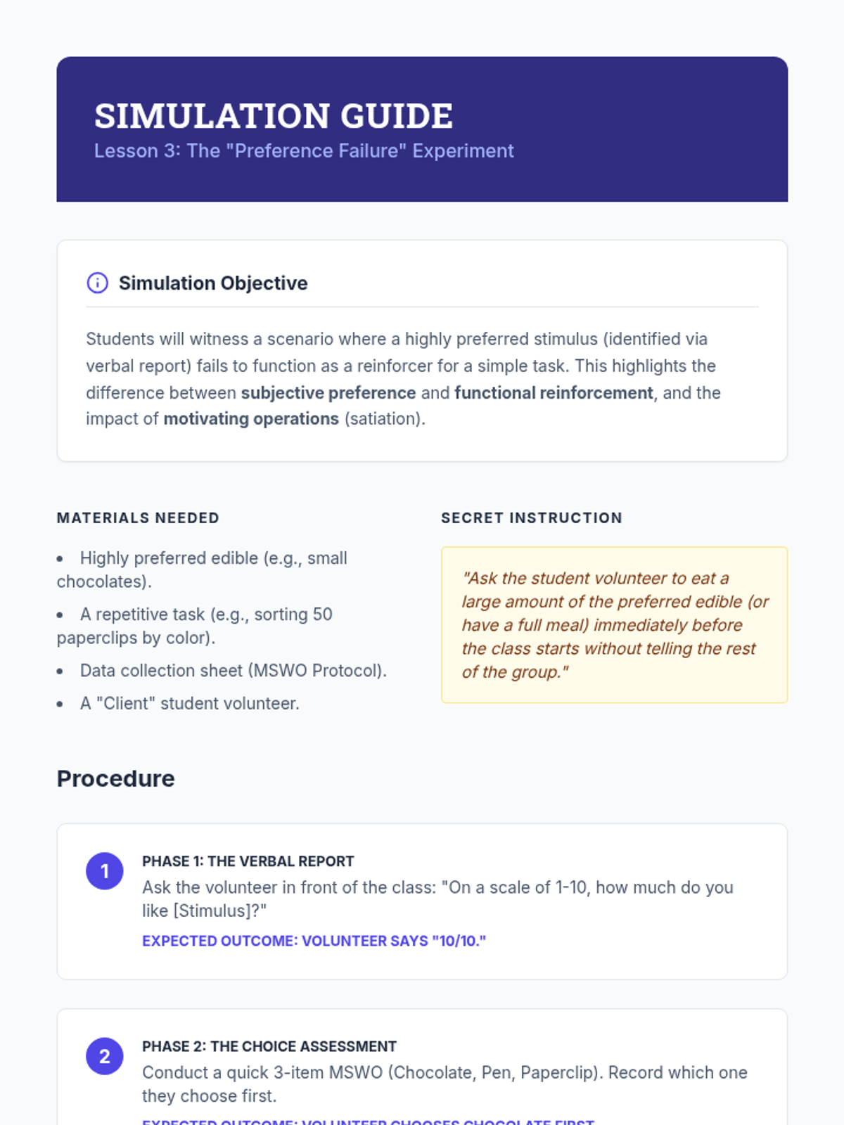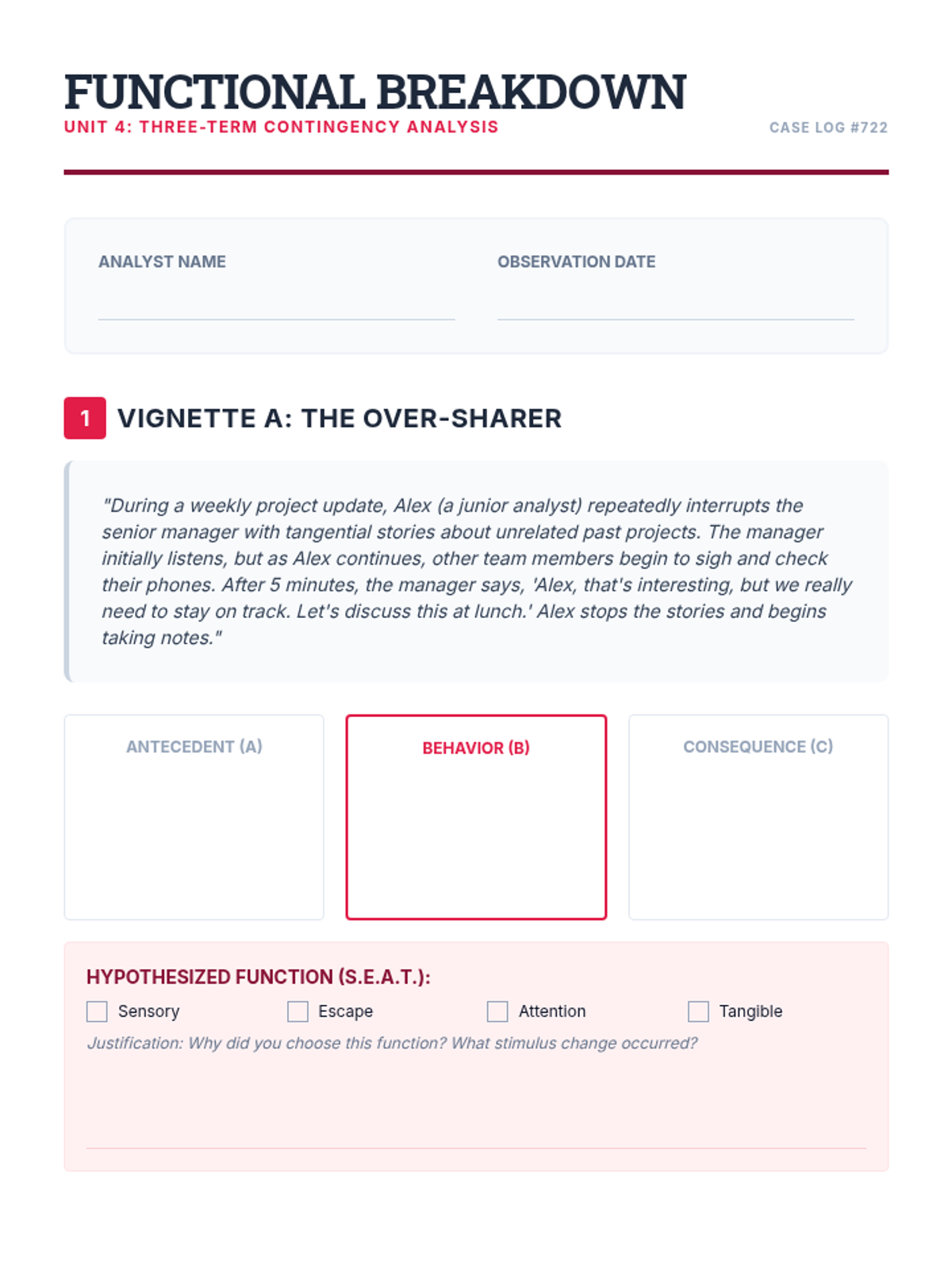 A comprehensive graduate-level sequence on Experimental Functional Analysis (FA). Students will progress from understanding the limitations of descriptive assessments to designing, implementing, and interpreting rigorous experimental conditions to identify behavioral functions.