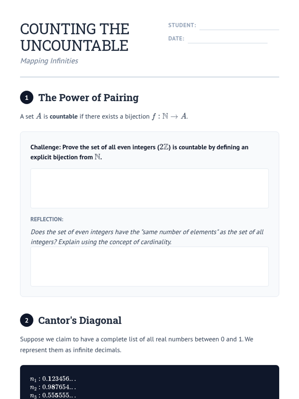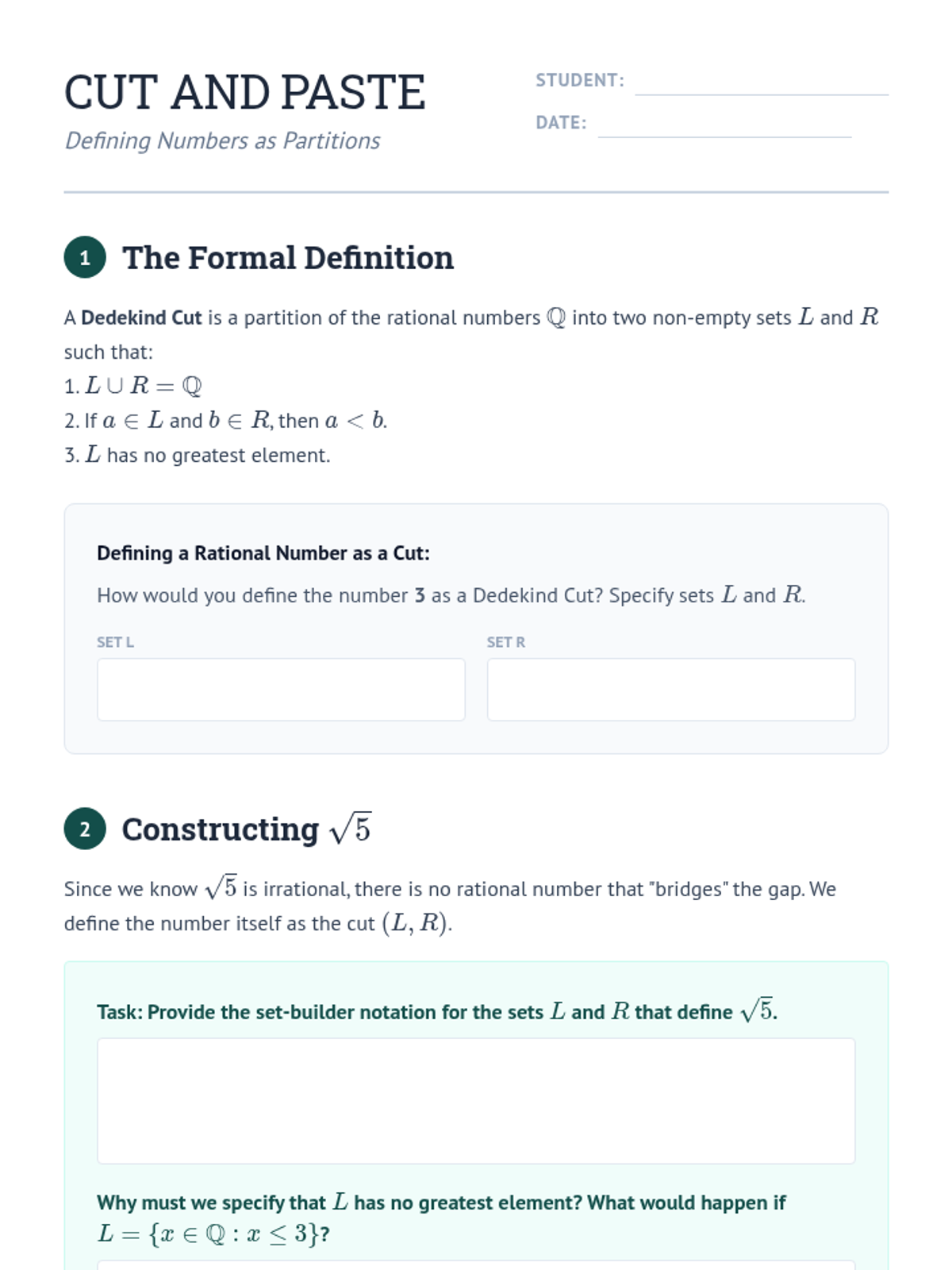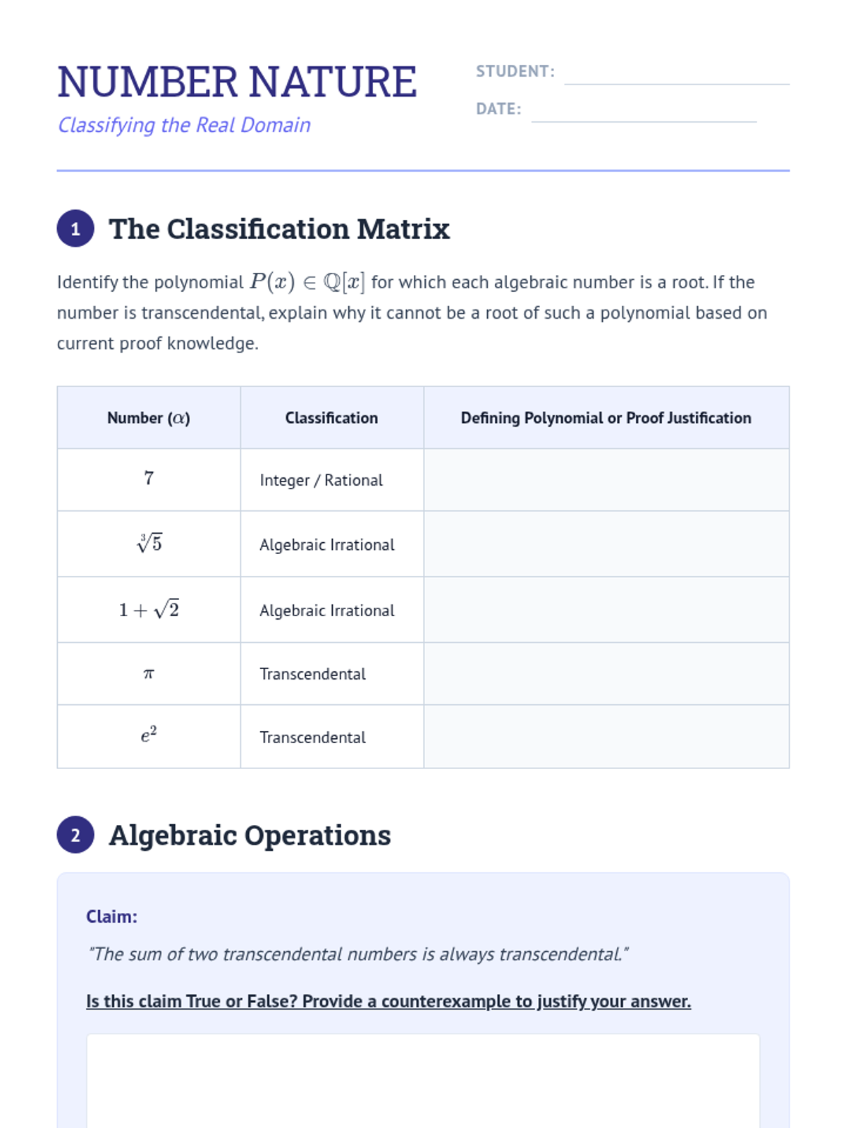 A rigorous undergraduate sequence exploring the theoretical construction of the real number system, focusing on the discovery, proof, and classification of irrational numbers from historical crises to Cantor's cardinality.