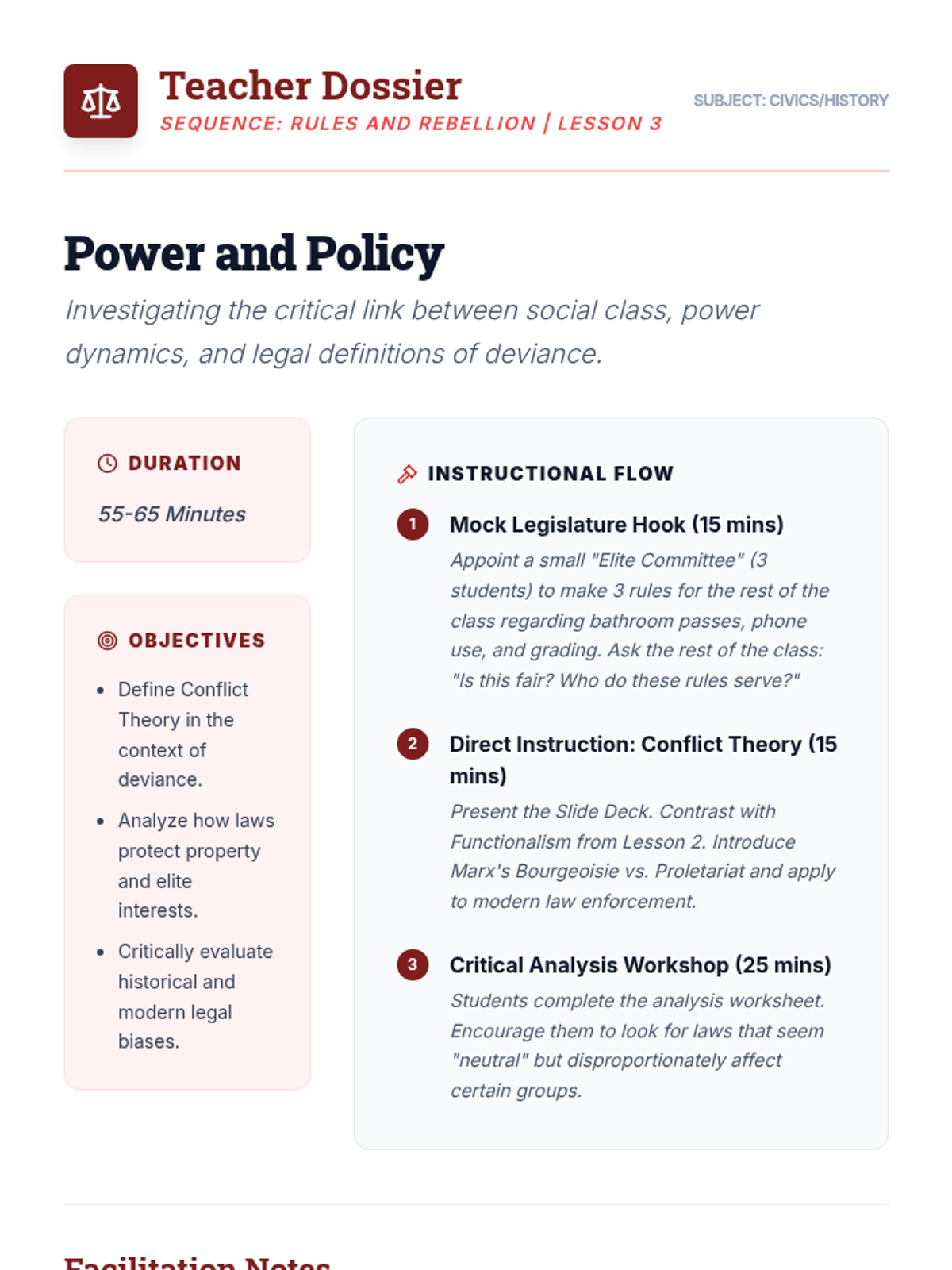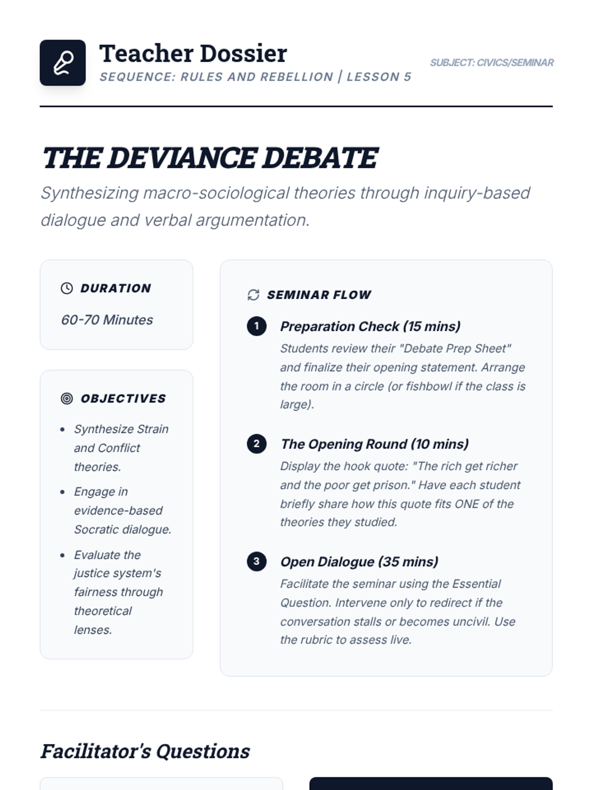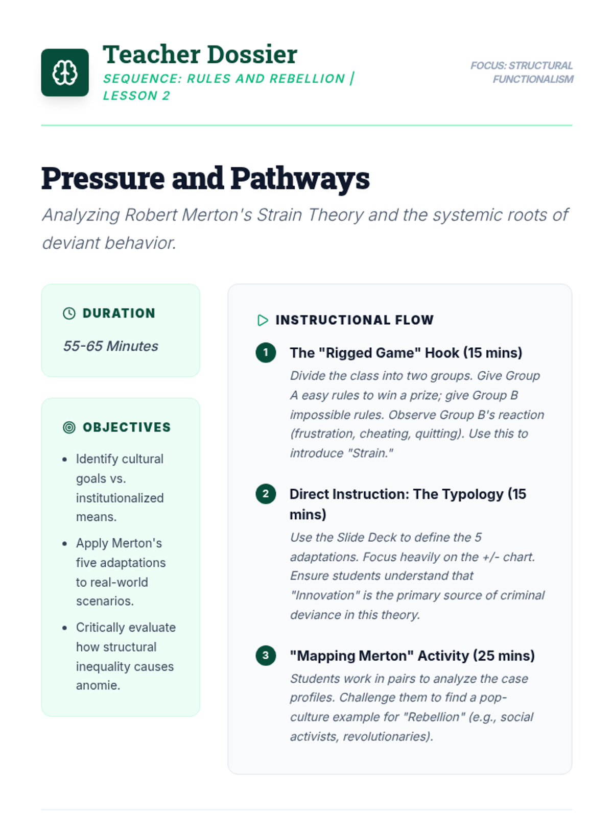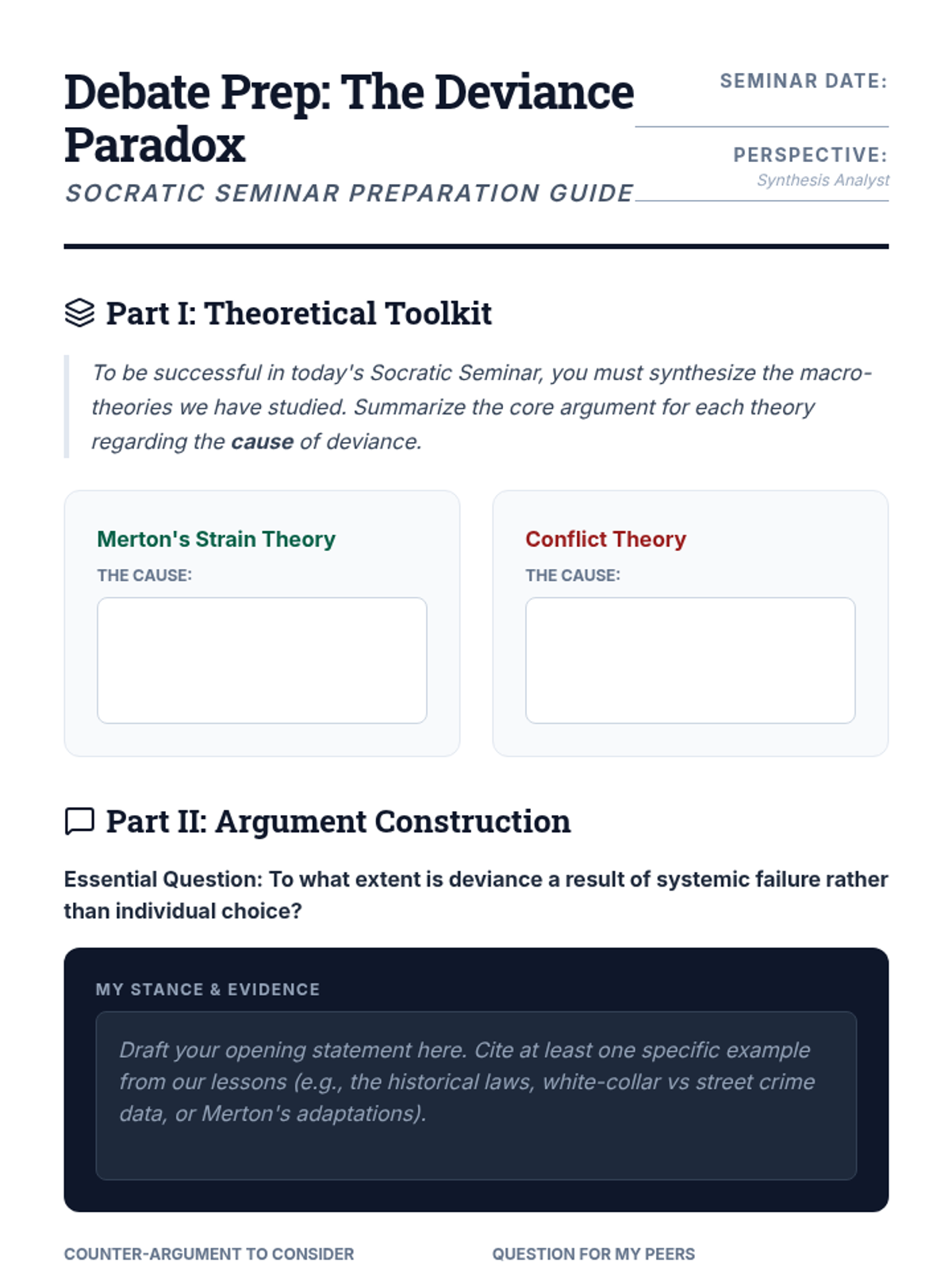 A comprehensive sociology sequence exploring how social structures and power dynamics influence deviant behavior through the lenses of Structural Functionalism and Conflict Theory. Students move from basic definitions of norms to complex analyses of systemic inequality in the justice system.