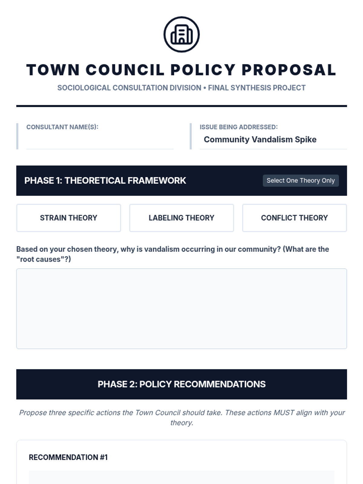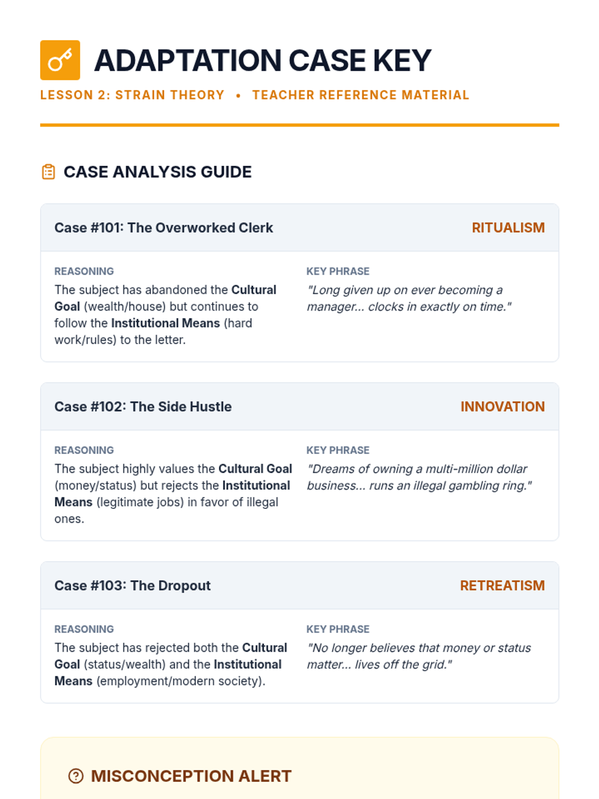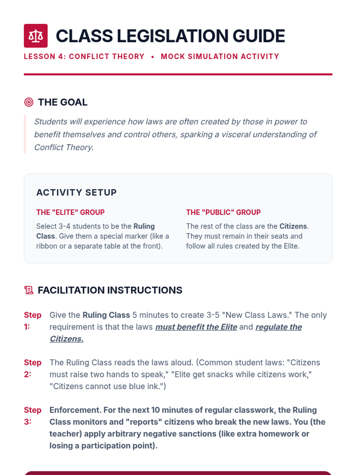 This sequence guides 9th-grade students through the sociological analysis of rule-breaking behavior and the mechanisms of social control. Students examine three major theoretical frameworks—Structural Strain, Labeling, and Conflict Theory—through simulations and case studies to understand how social structures and power dynamics influence the creation and enforcement of laws.
