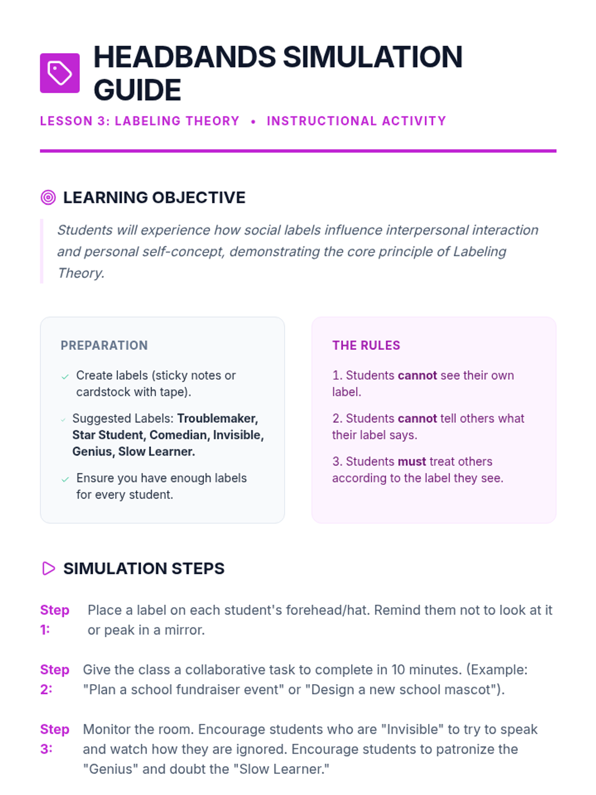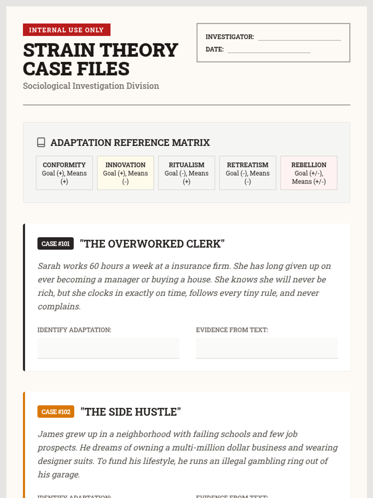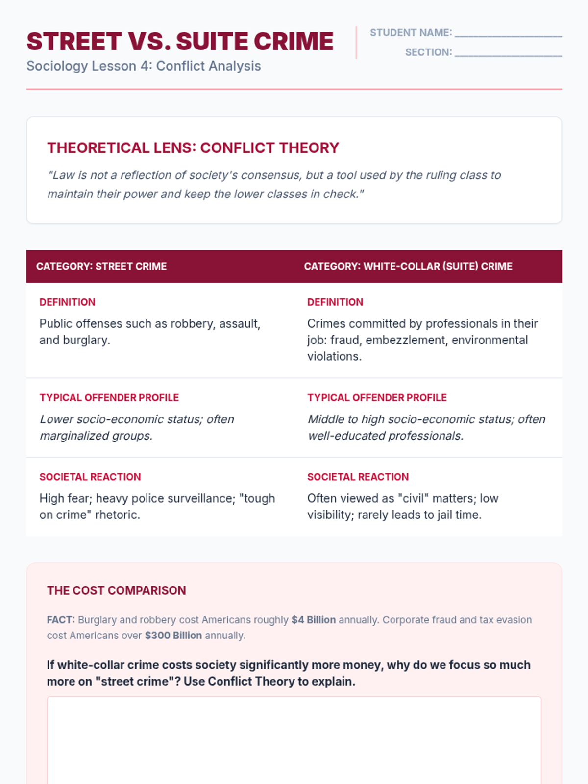 This sequence guides 9th-grade students through the sociological analysis of rule-breaking behavior and the mechanisms of social control. Students examine three major theoretical frameworks—Structural Strain, Labeling, and Conflict Theory—through simulations and case studies to understand how social structures and power dynamics influence the creation and enforcement of laws.