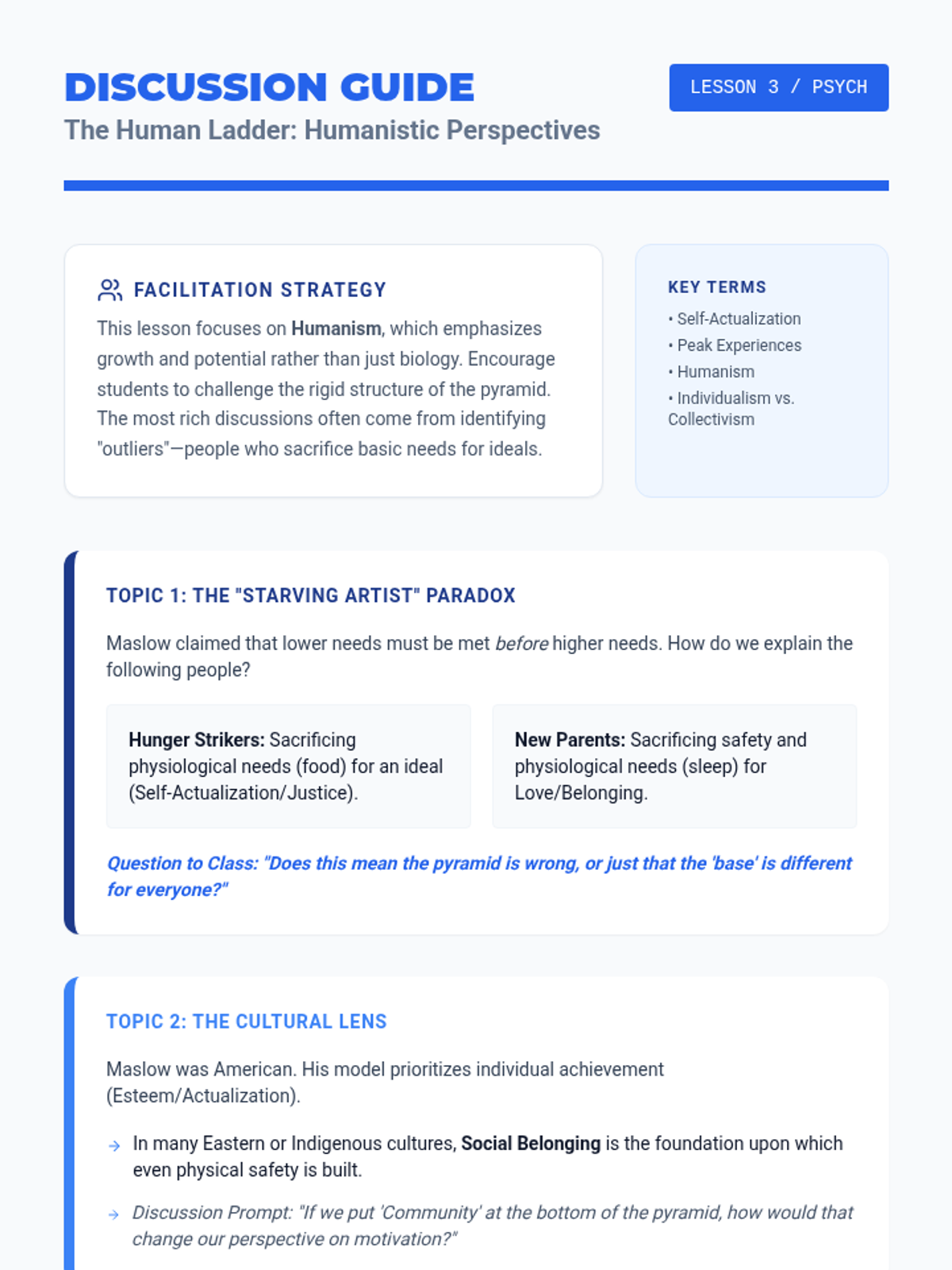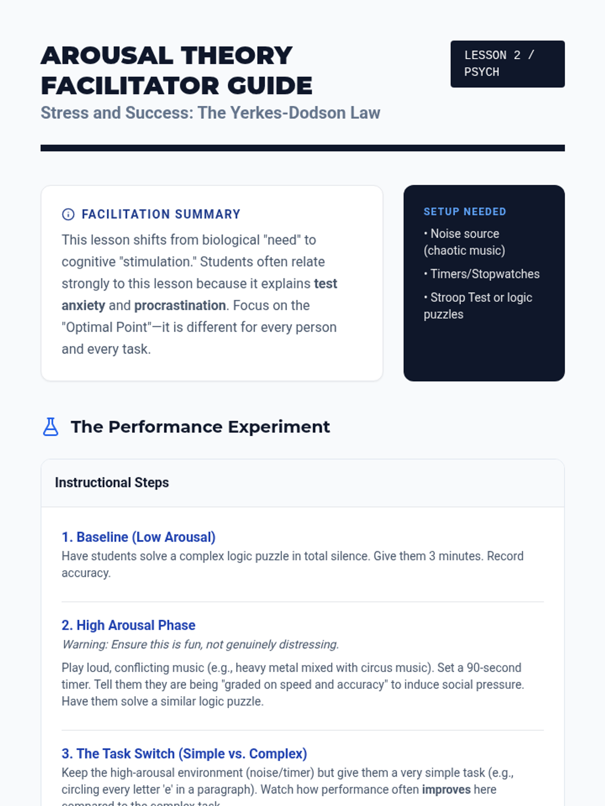 This sequence guides students through the physiological, cognitive, and social foundations of motivation, moving from basic biological drivers to complex psychological needs. Students analyze theories ranging from Drive-Reduction to Maslow's Hierarchy, applying these frameworks to real-world scenarios.