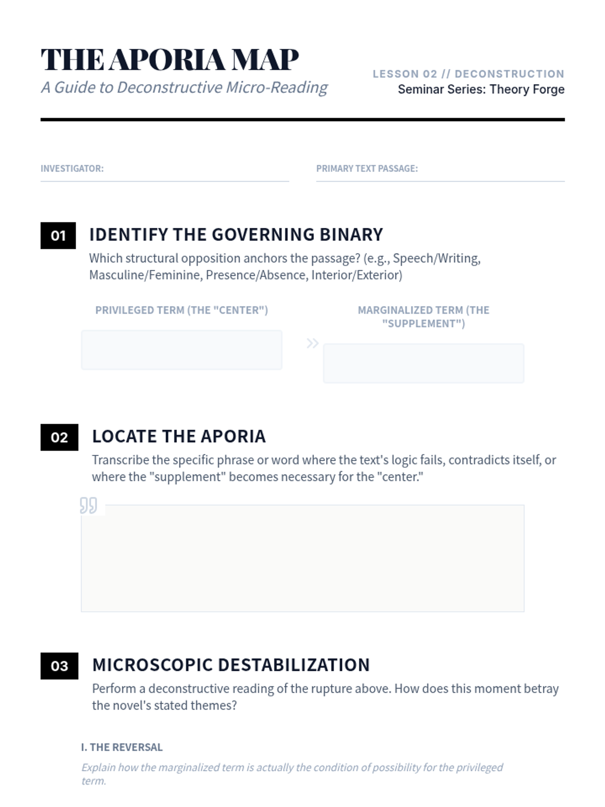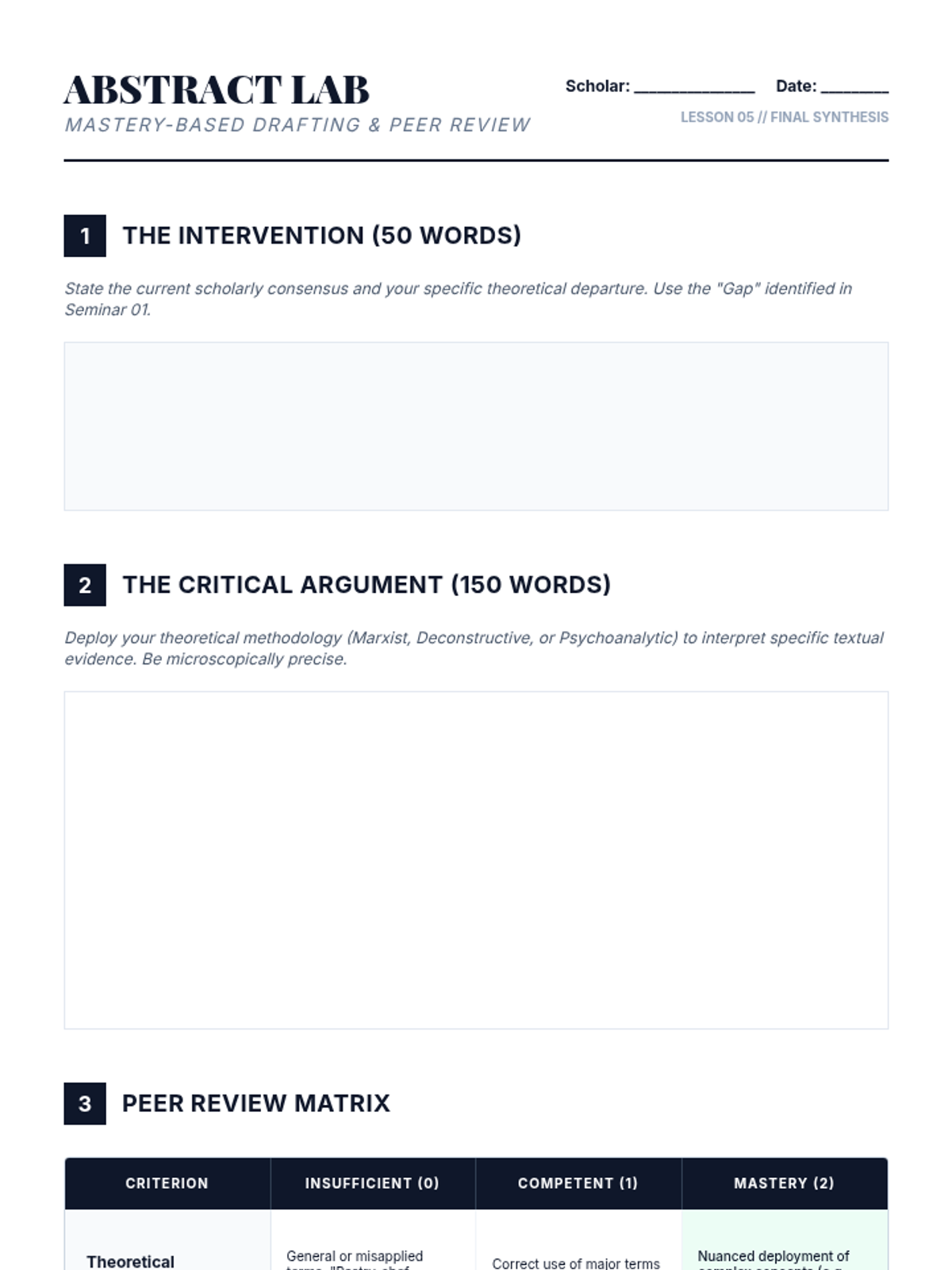 This advanced graduate-level sequence guides students through the rigorous application of contemporary literary theory (Post-structuralism, Psychoanalysis, Marxism) to a primary text. Students learn to navigate scholarly landscapes, perform deconstructive readings, and synthesize their findings into a publishable conference abstract.