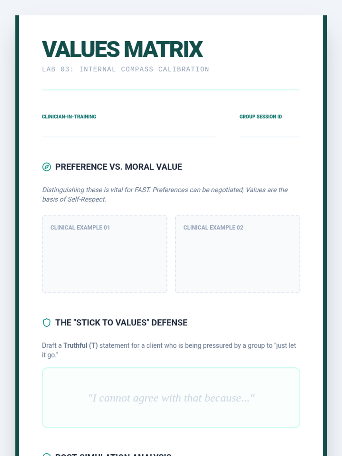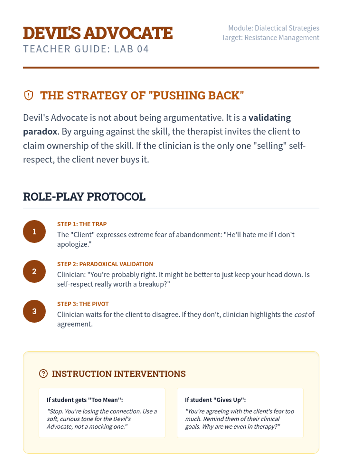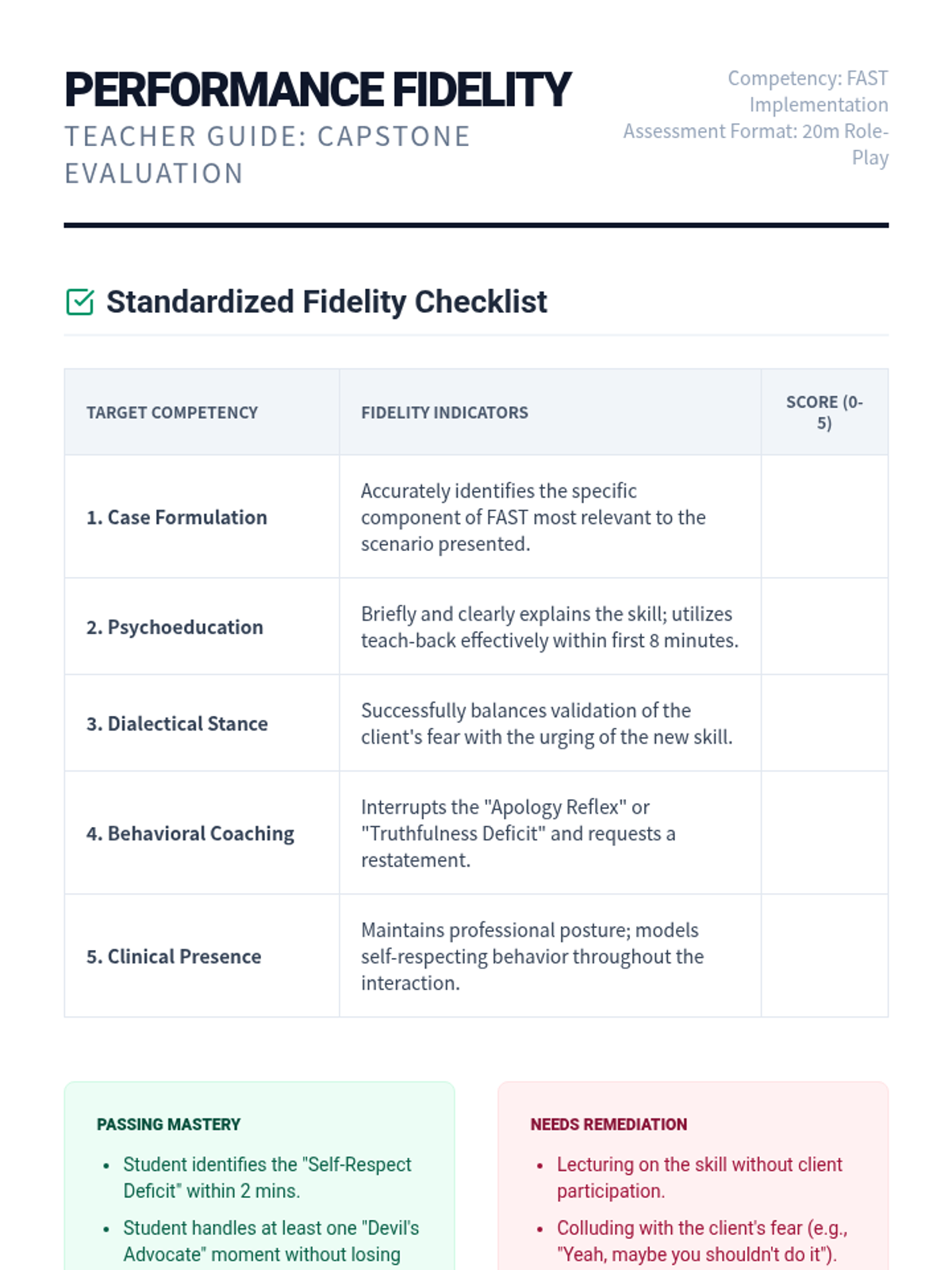 A clinical training laboratory for graduate students to master the coaching and implementation of DBT FAST skills. Focuses on move from theory to practice through simulation, peer feedback, and managing client resistance.