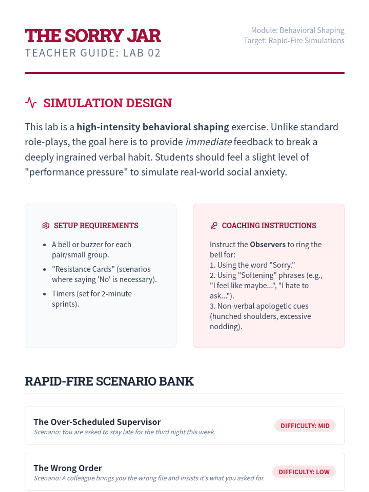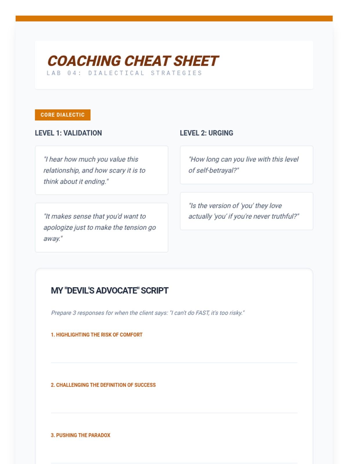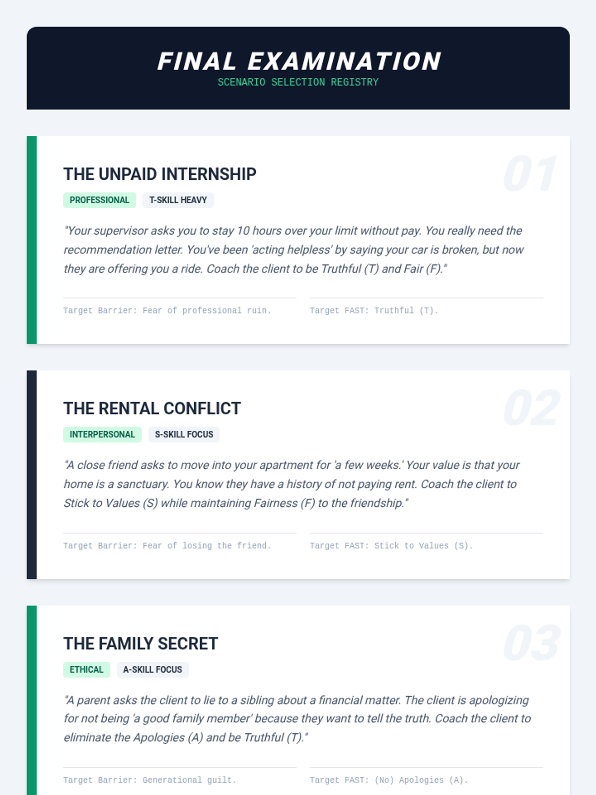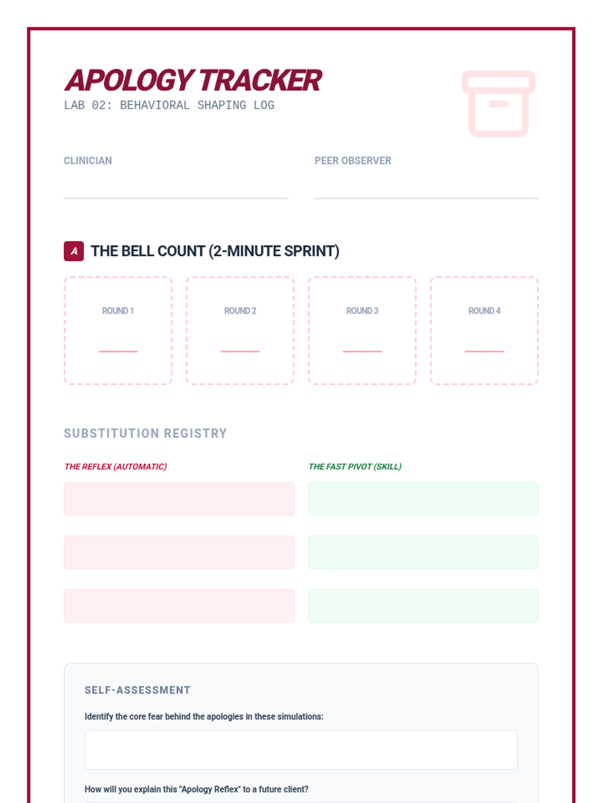 A clinical training laboratory for graduate students to master the coaching and implementation of DBT FAST skills. Focuses on move from theory to practice through simulation, peer feedback, and managing client resistance.